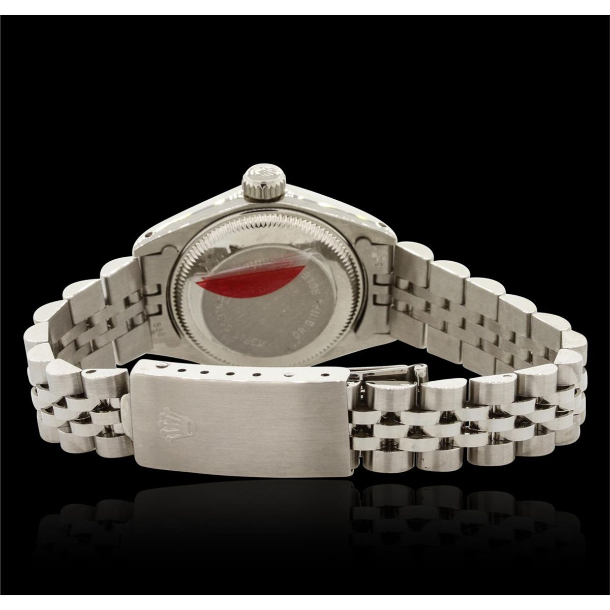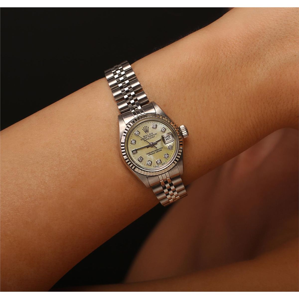 One ladies, hand crafted & machine milled Rolex DateJust Model stainless steel wristwatch electronically tested, Case: 26mm oyster, Crown: twinlock with logo, Bezel: fluted, Crystal: acrylic cyclops lens. Movement: superlative chronometer, Custom Dial: Mother of Pearl, with baton hands & diamond markers, Calendar: 3 o'clock position date display, non-quick set, Circa: 1977, Condition: G-4 Average. Bracelet: stainless steel jubilee. Bright polish and brushed finish. Six and one half inch length, adjustable. Standard clasp, with logo. Total Weight of Watch 47.63 grams. AIG Appraised at $5,880.00.