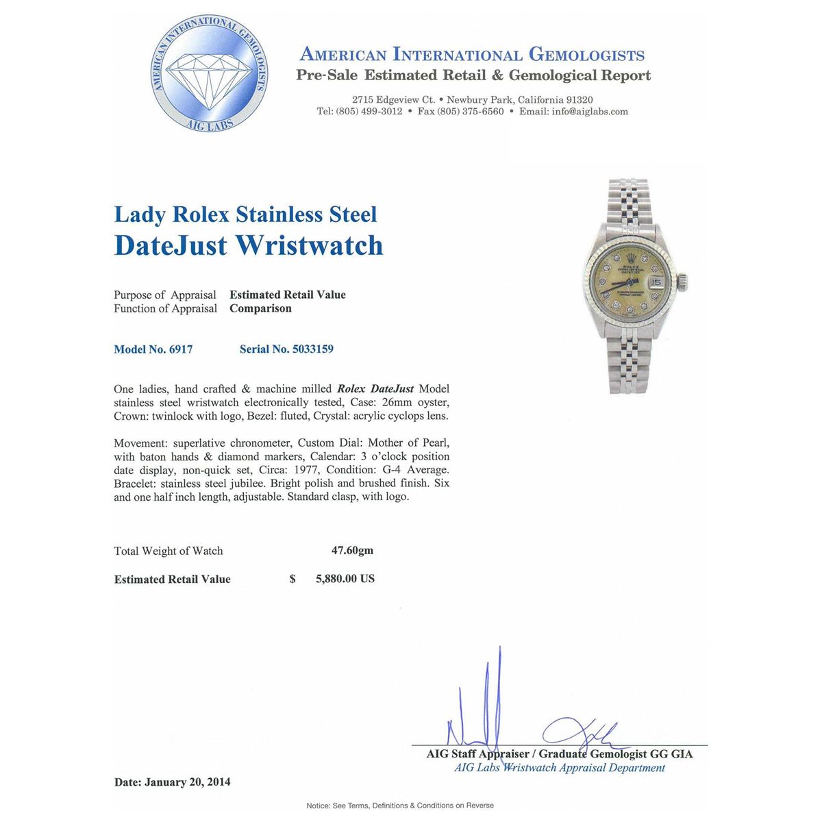 One ladies, hand crafted & machine milled Rolex DateJust Model stainless steel wristwatch electronically tested, Case: 26mm oyster, Crown: twinlock with logo, Bezel: fluted, Crystal: acrylic cyclops lens. Movement: superlative chronometer, Custom Dial: Mother of Pearl, with baton hands & diamond markers, Calendar: 3 o'clock position date display, non-quick set, Circa: 1977, Condition: G-4 Average. Bracelet: stainless steel jubilee. Bright polish and brushed finish. Six and one half inch length, adjustable. Standard clasp, with logo. Total Weight of Watch 47.63 grams. AIG Appraised at $5,880.00.