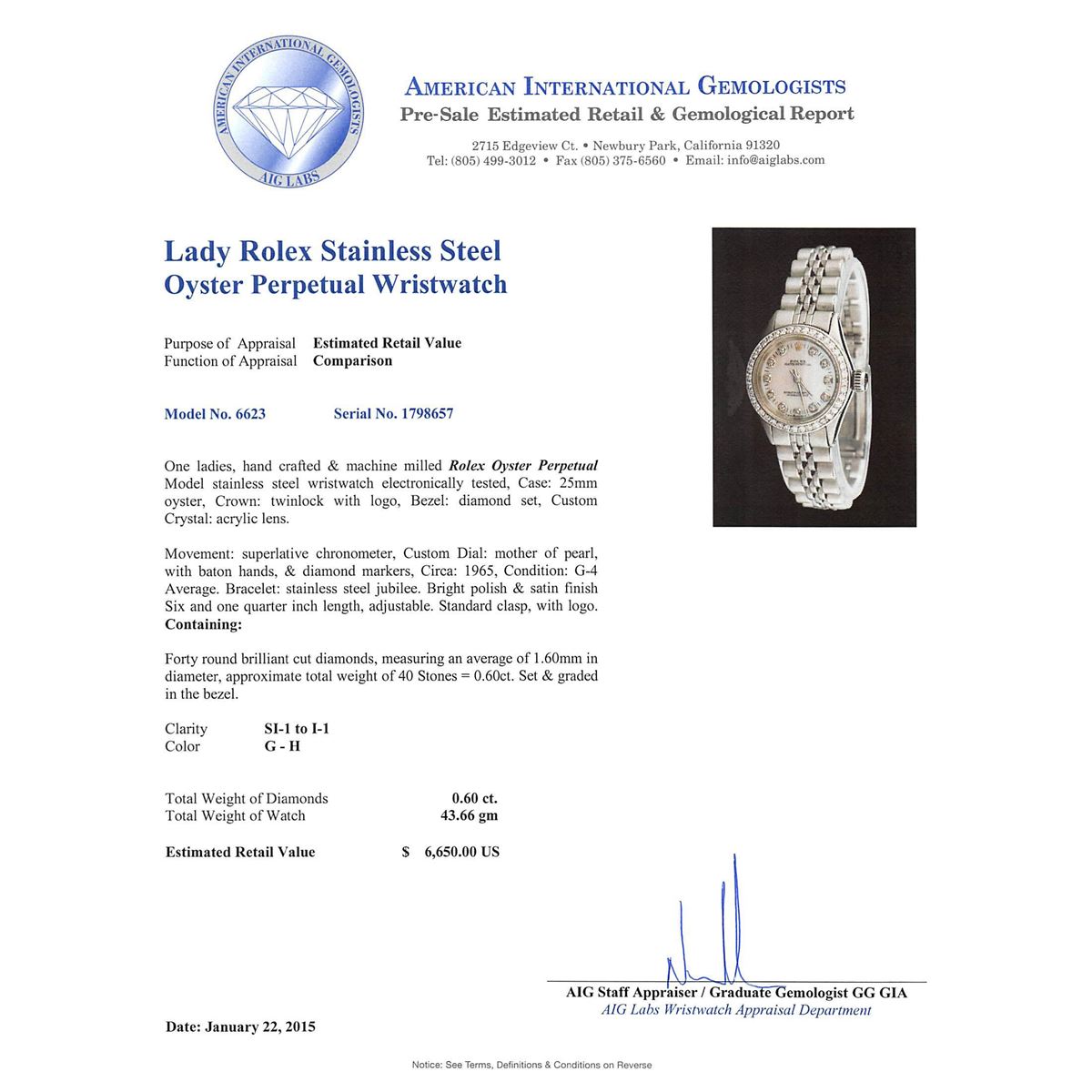 One ladies, hand crafted & machine milled Rolex Oyster Perpetual Model stainless steel wristwatch electronically tested, Case: 25mm oyster, Crown: twinlock with logo, Bezel: diamond set, Custom Crystal: acrylic lens. Movement: superlative chronometer, Custom Dial: mother of pearl, with baton hands, & diamond markers, Circa: 1965, Condition: G-4 Average. Bracelet: stainless steel jubilee. Bright polish & satin finish Six and one quarter inch length, adjustable. Standard clasp, with logo. Containing: Forty round brilliant cut diamonds, measuring an average of 1.60mm in diameter, approximate. Total Weight of 40 Stones = 0.60ct. Set & graded in the bezel. Clarity: SI-1 to I-1. Color: G - H. Total Weight of Diamonds 0.60ct. Total Weight of Watch 43.66 grams. AIG Appraised at $6,650.00.