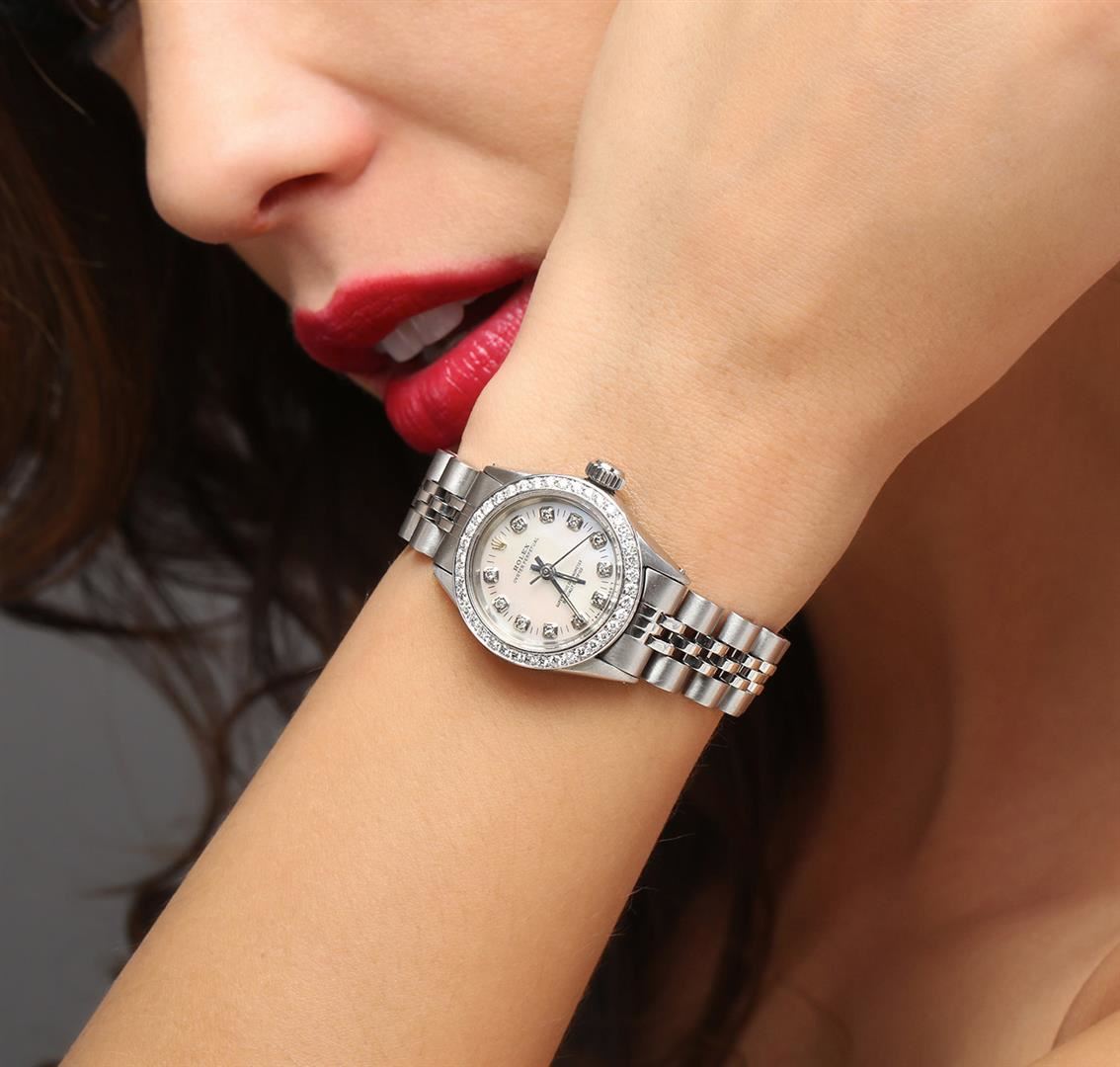 One ladies, hand crafted & machine milled Rolex Oyster Perpetual Model stainless steel wristwatch electronically tested, Case: 25mm oyster, Crown: twinlock with logo, Bezel: diamond set, Custom Crystal: acrylic lens. Movement: superlative chronometer, Custom Dial: mother of pearl, with baton hands, & diamond markers, Circa: 1965, Condition: G-4 Average. Bracelet: stainless steel jubilee. Bright polish & satin finish Six and one quarter inch length, adjustable. Standard clasp, with logo. Containing: Forty round brilliant cut diamonds, measuring an average of 1.60mm in diameter, approximate. Total Weight of 40 Stones = 0.60ct. Set & graded in the bezel. Clarity: SI-1 to I-1. Color: G - H. Total Weight of Diamonds 0.60ct. Total Weight of Watch 43.66 grams. AIG Appraised at $6,650.00.