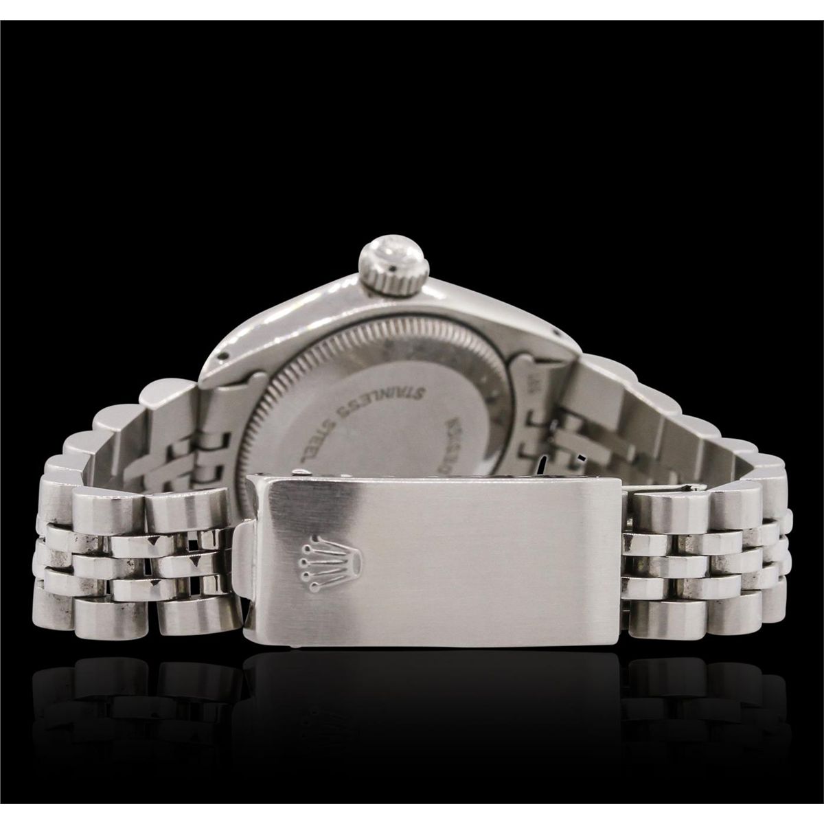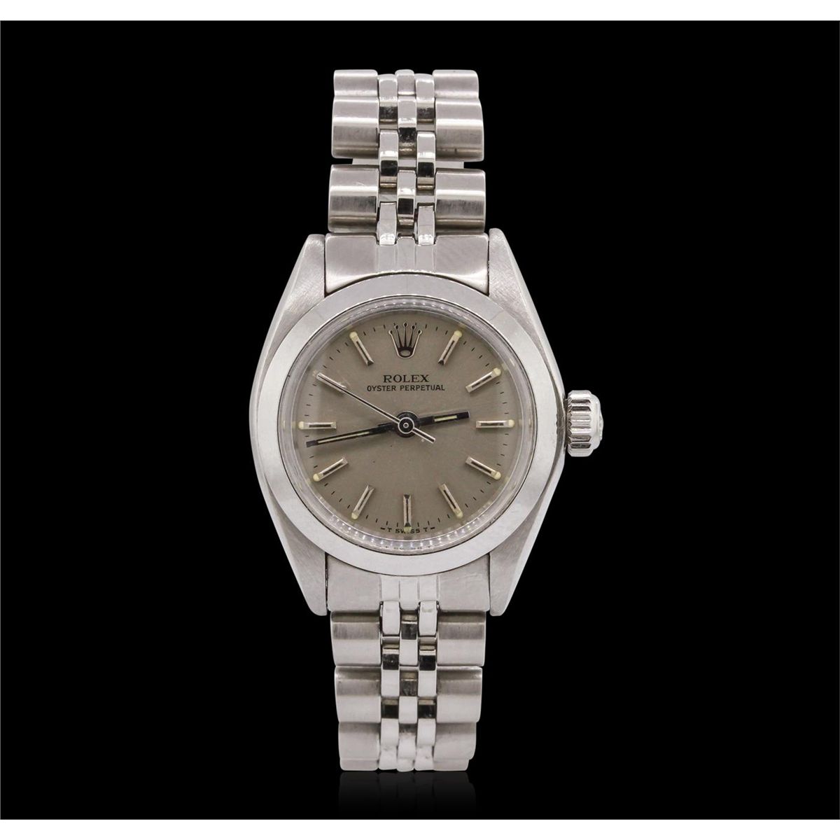 One ladies, vintage Rolex Oyster Perpetual model Stainless Steel wristwatch electronically tested, Case: 25mm oyster, Crown: twinlock with logo, Bezel: polished, Custom Crystal: acrylic lens. Movement: mechanical, stem wind, Dial: Gray, with baton hands and indices, Circa: 1982, Condition: G-5 Fine, Bracelet: bright polish & satin finish stainless steel jubilee link. Five and three quarter inch length, adjustable. Standard clasp, with logo. Total Weight of Watch 42.86 grams. AIG Appraised at $2,880.00.
