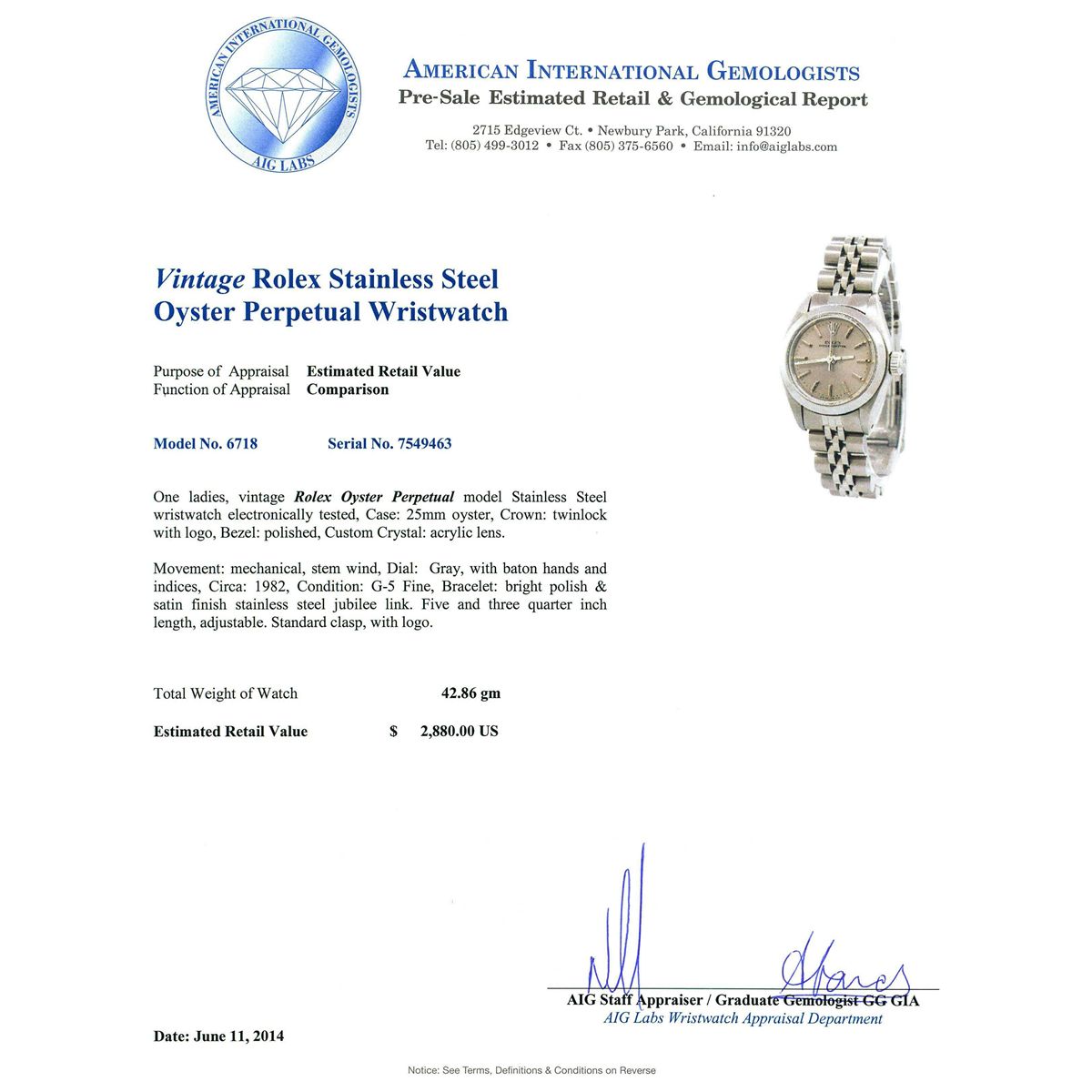 One ladies, vintage Rolex Oyster Perpetual model Stainless Steel wristwatch electronically tested, Case: 25mm oyster, Crown: twinlock with logo, Bezel: polished, Custom Crystal: acrylic lens. Movement: mechanical, stem wind, Dial: Gray, with baton hands and indices, Circa: 1982, Condition: G-5 Fine, Bracelet: bright polish & satin finish stainless steel jubilee link. Five and three quarter inch length, adjustable. Standard clasp, with logo. Total Weight of Watch 42.86 grams. AIG Appraised at $2,880.00.