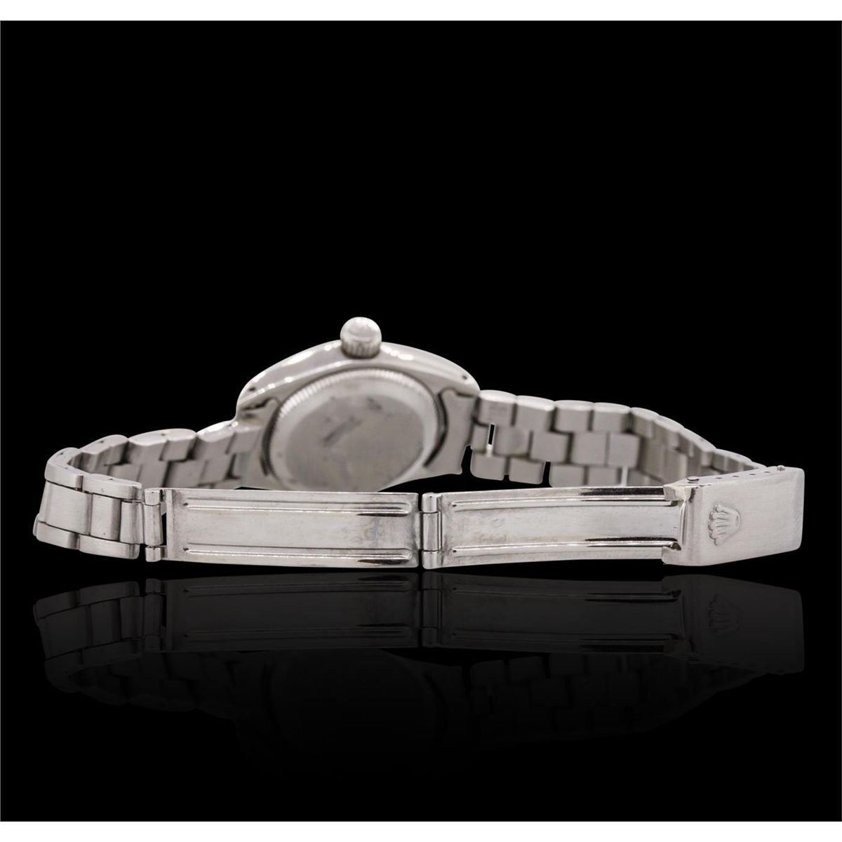 One ladies, vintage Lady Date Rolex Oyster Perpetual model Stainless Steel wristwatch electronically tested, Case: 25mm oyster, Crown: twinlock with logo, Bezel: polished, Custom Crystal: acrylic lens. Movement: mechanical stem wind, Custom Dial: Silvered, with pointed hands and diamond markers, Circa: 1972, Condition: G-4 Average, Bracelet: bright polish & brushed finish stainless steel tapering oyster link. Seven and one quarter inch length, adjustable. Total Weight of Watch 39.63 grams. AIG Appraised at $3,050.00.