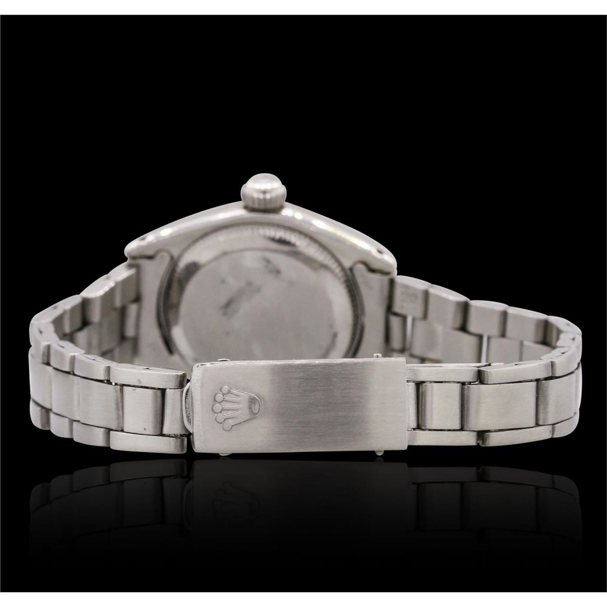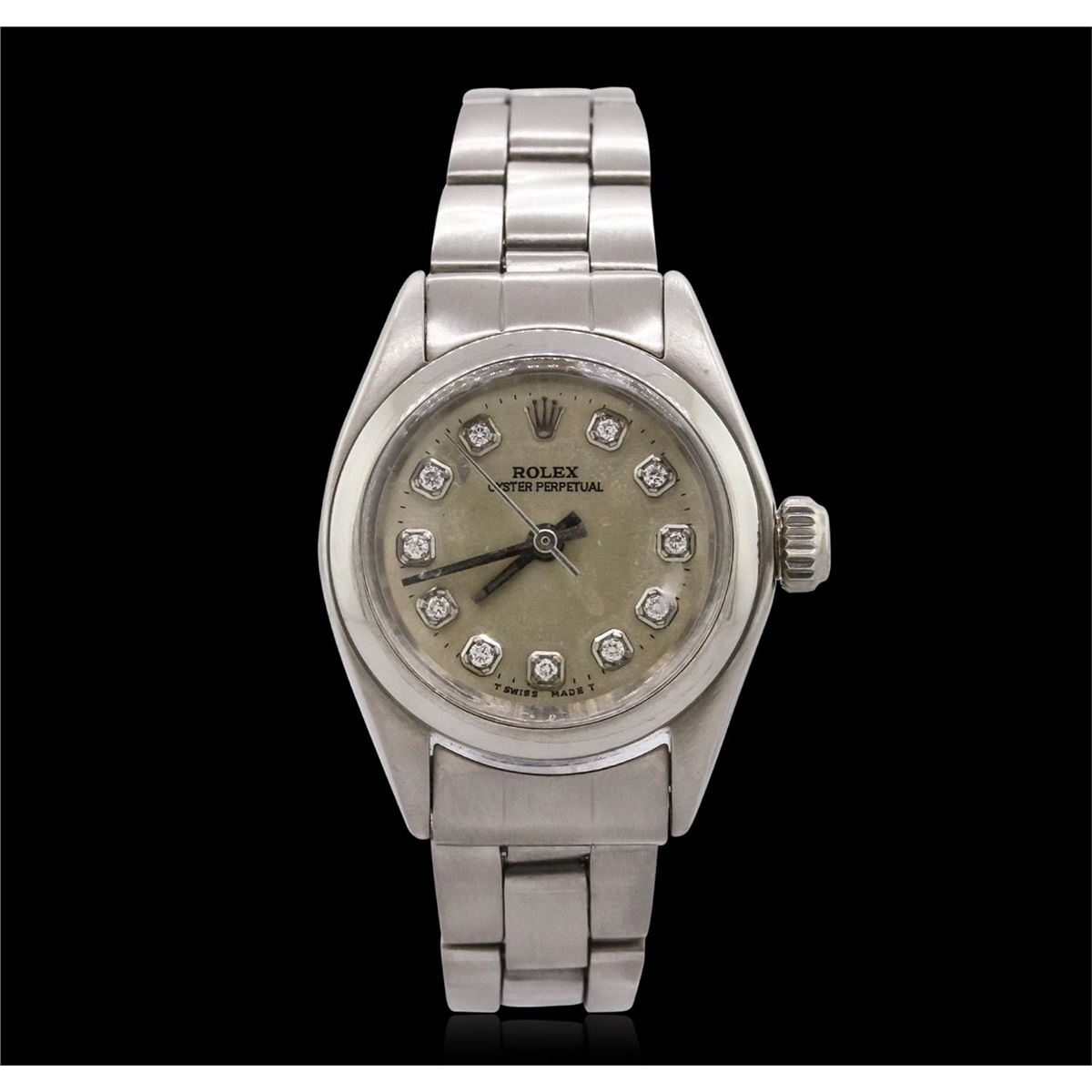 One ladies, vintage Lady Date Rolex Oyster Perpetual model Stainless Steel wristwatch electronically tested, Case: 25mm oyster, Crown: twinlock with logo, Bezel: polished, Custom Crystal: acrylic lens. Movement: mechanical stem wind, Custom Dial: Silvered, with pointed hands and diamond markers, Circa: 1972, Condition: G-4 Average, Bracelet: bright polish & brushed finish stainless steel tapering oyster link. Seven and one quarter inch length, adjustable. Total Weight of Watch 39.63 grams. AIG Appraised at $3,050.00.