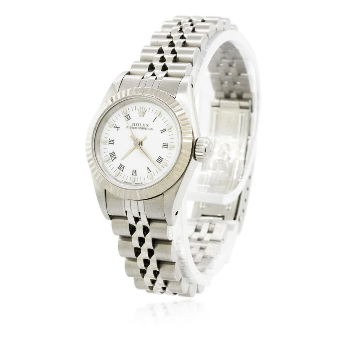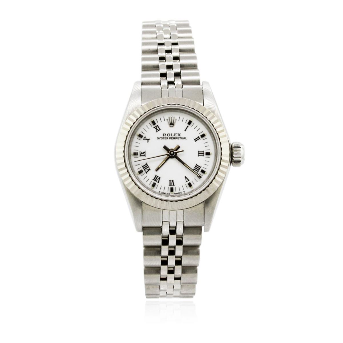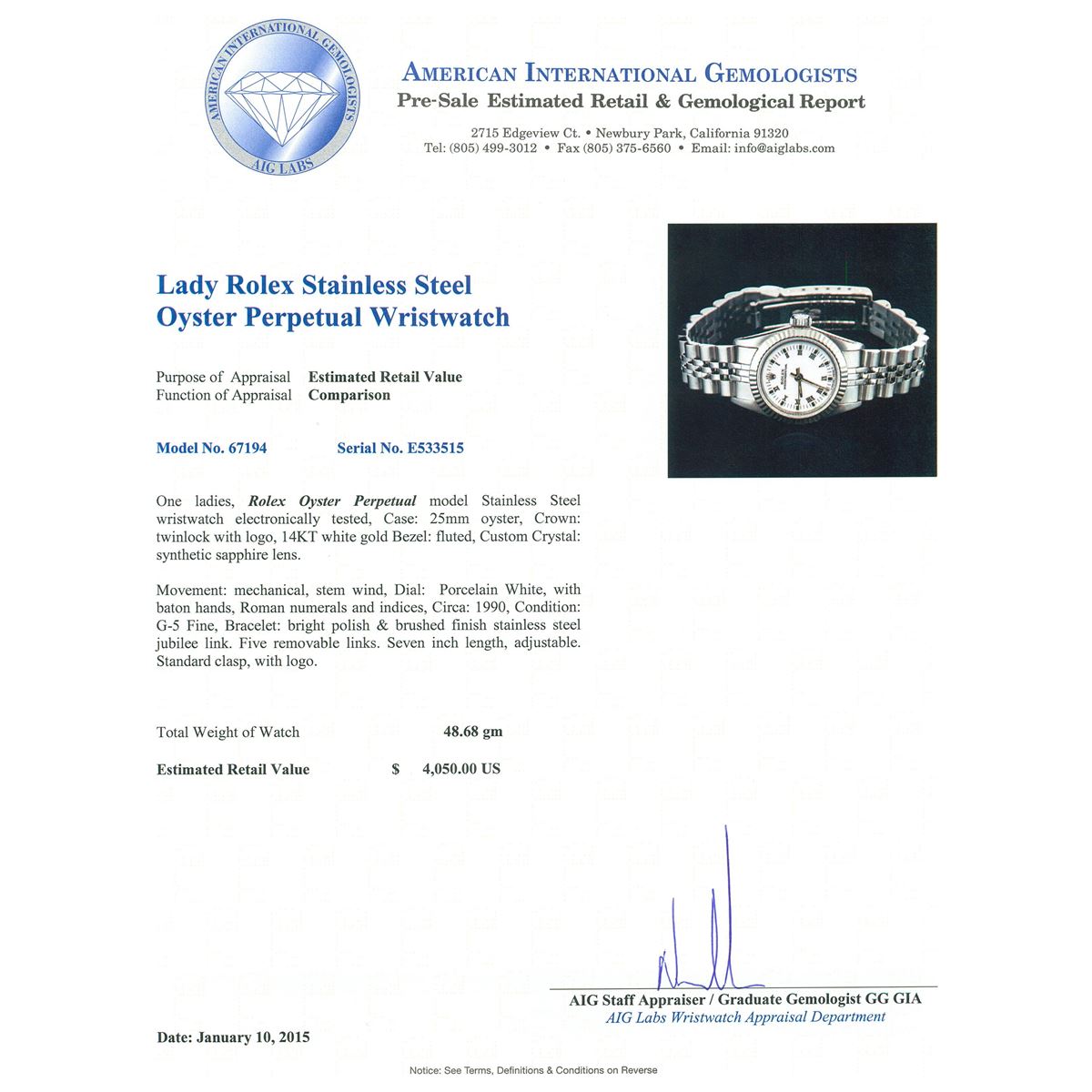 One ladies, Rolex Oyster Perpetual model Stainless Steel wristwatch electronically tested, Case: 25mm oyster, Crown: twinlock with logo, 14KT white gold Bezel: fluted, Custom Crystal: synthetic sapphire lens. Movement: mechanical, stem wind, Dial: Porcelain White, with baton hands, Roman numerals and indices, Circa: 1990, Condition: G-5 Fine, Bracelet: bright polish & brushed finish stainless steel jubilee link. Five removable links. Seven inch length, adjustable. Standard clasp, with logo. Total Weight of Watch 48.68 grams. AIG Appraised at $4,050.00.