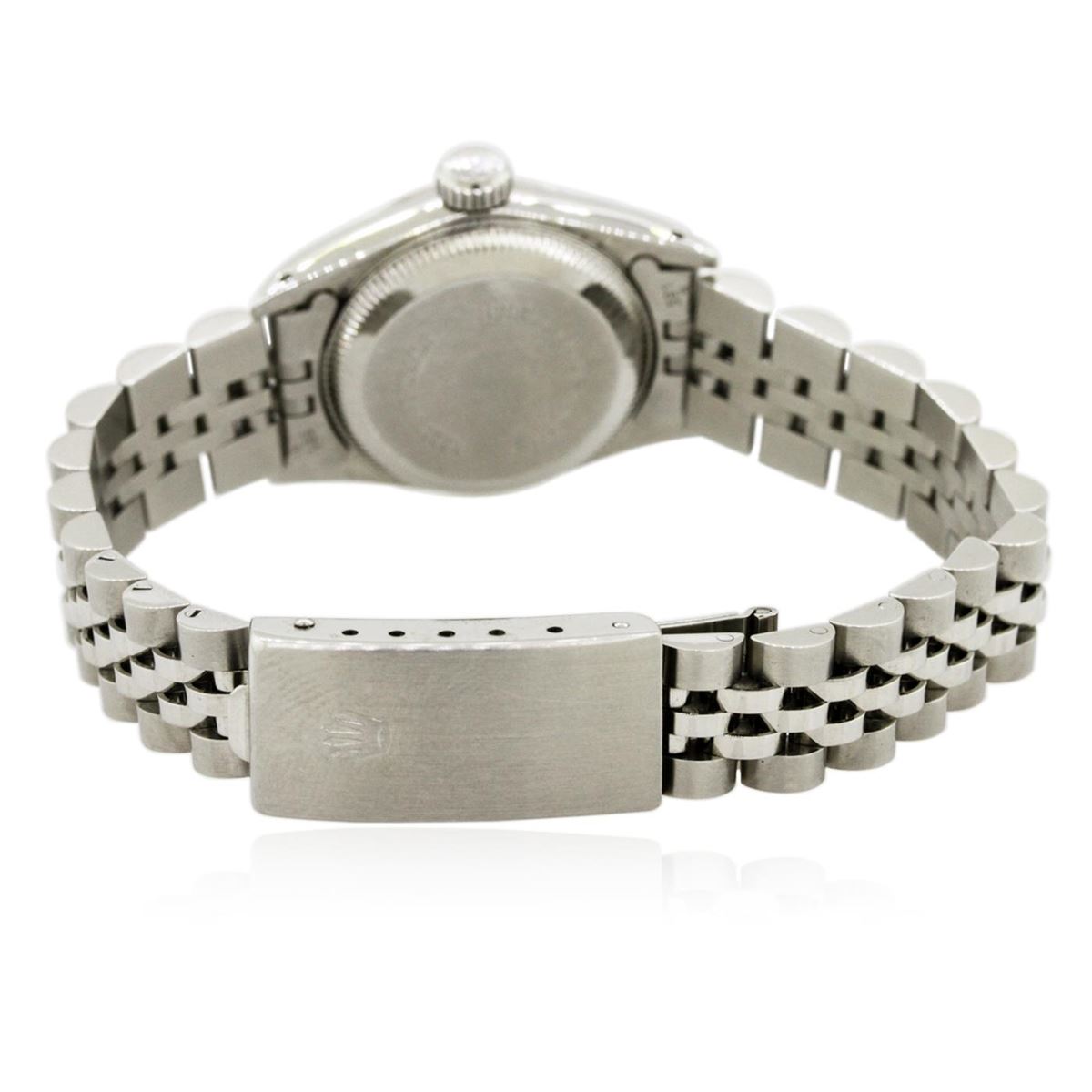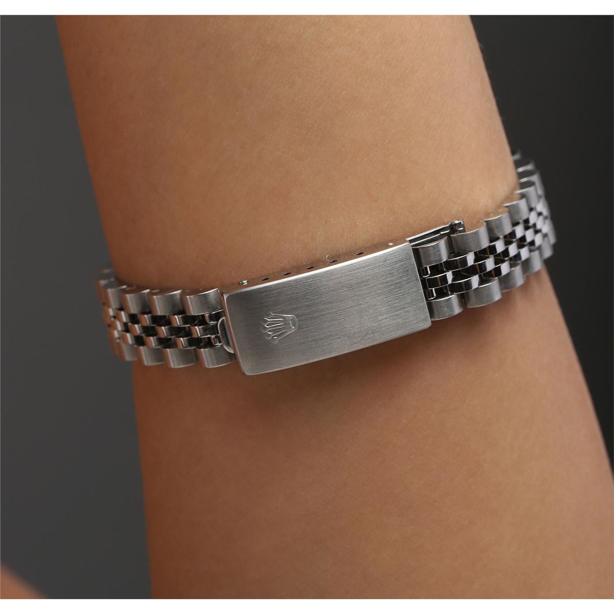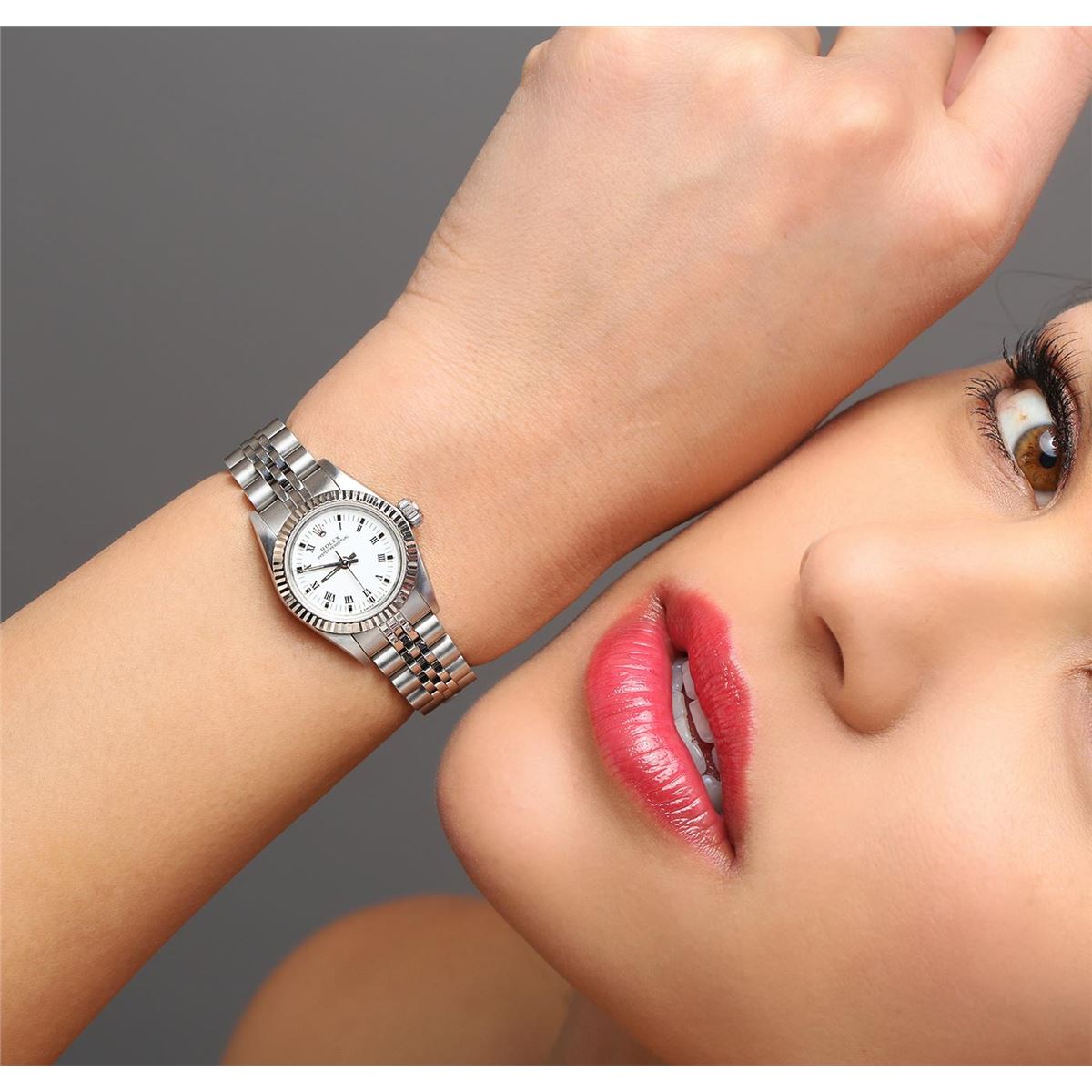 One ladies, Rolex Oyster Perpetual model Stainless Steel wristwatch electronically tested, Case: 25mm oyster, Crown: twinlock with logo, 14KT white gold Bezel: fluted, Custom Crystal: synthetic sapphire lens. Movement: mechanical, stem wind, Dial: Porcelain White, with baton hands, Roman numerals and indices, Circa: 1990, Condition: G-5 Fine, Bracelet: bright polish & brushed finish stainless steel jubilee link. Five removable links. Seven inch length, adjustable. Standard clasp, with logo. Total Weight of Watch 48.68 grams. AIG Appraised at $4,050.00.