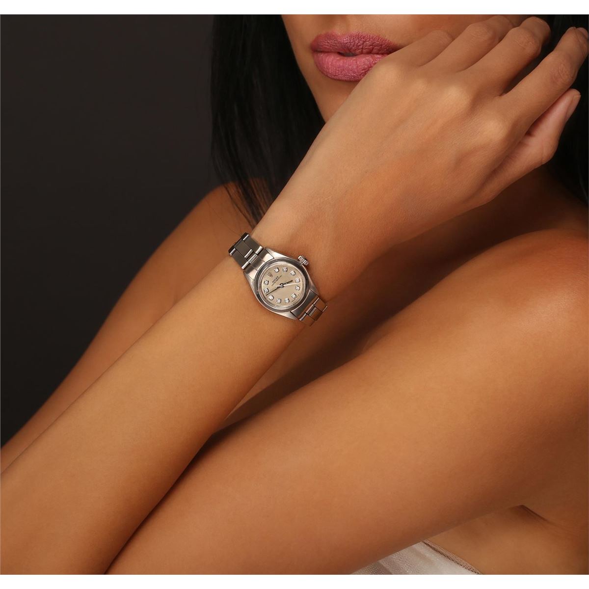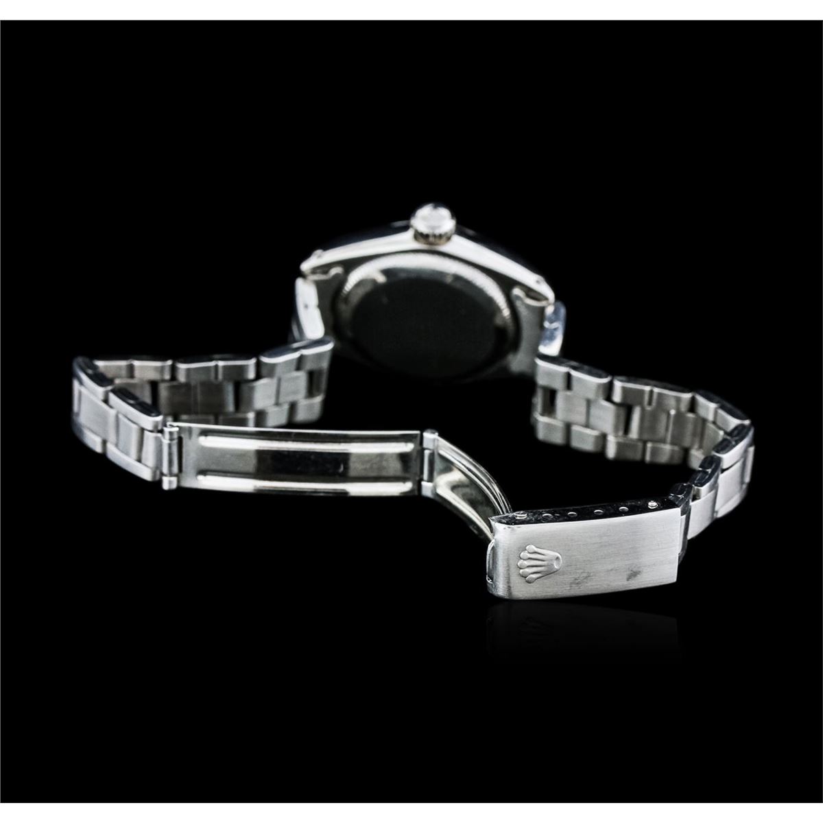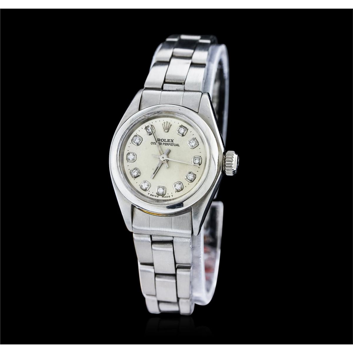 One ladies, vintage Lady Date Rolex Oyster Perpetual model Stainless Steel wristwatch electronically tested, Case: 25mm oyster, Crown: twinlock with logo, Bezel: polished, Custom Crystal: acrylic lens. Movement: mechanical stem wind, Custom Dial: Silvered, with pointed hands and diamond markers, Circa: 1972, Condition: G-4 Average, Bracelet: bright polish & brushed finish stainless steel tapering oyster link. Seven and one quarter inch length, adjustable. Total Weight of Watch 39.63 grams. AIG Appraised at $3,050.00.