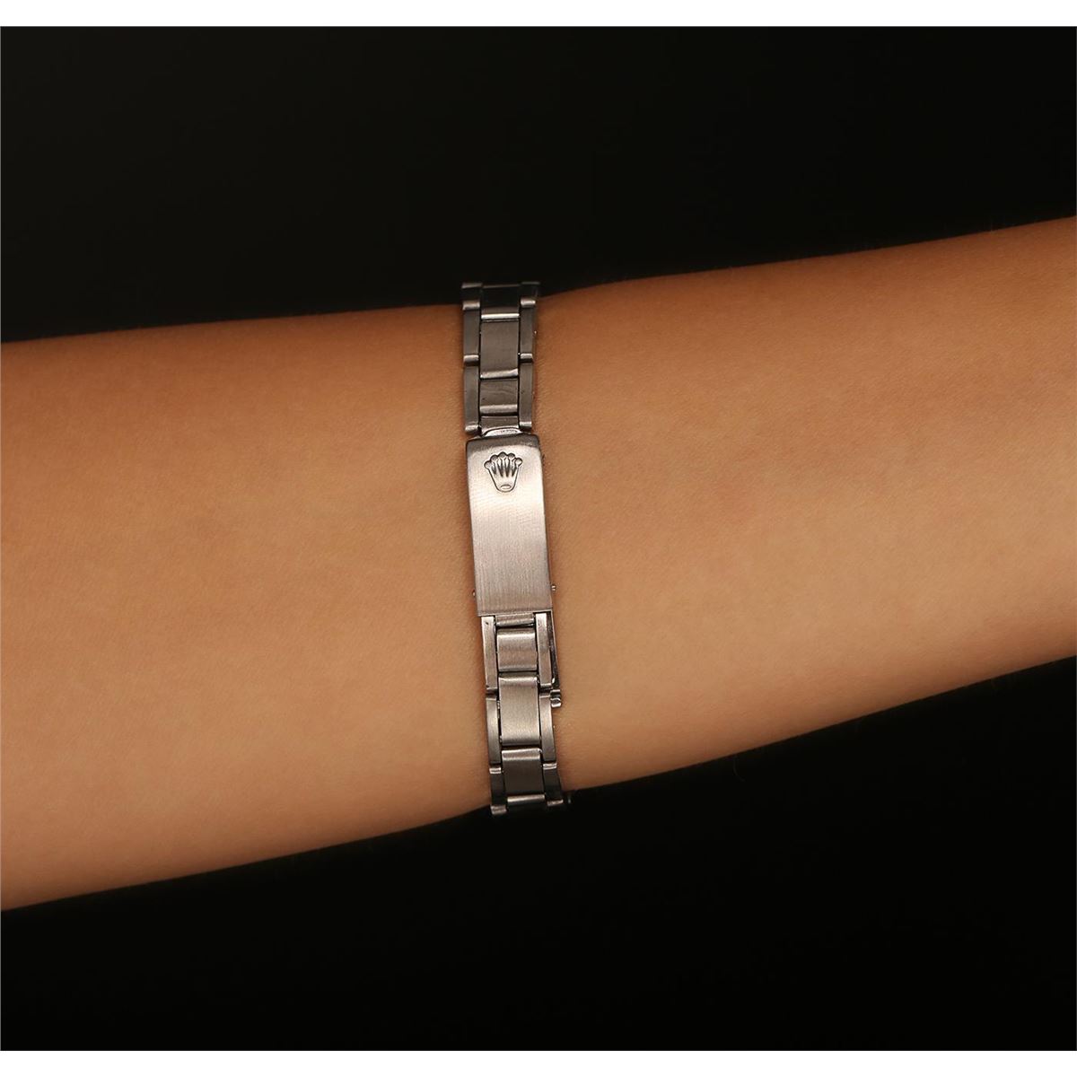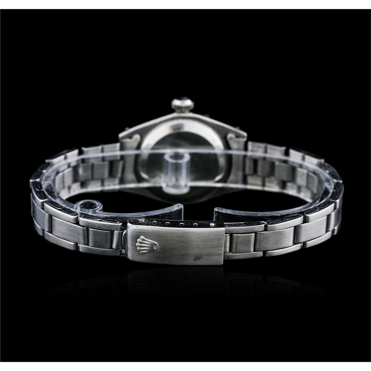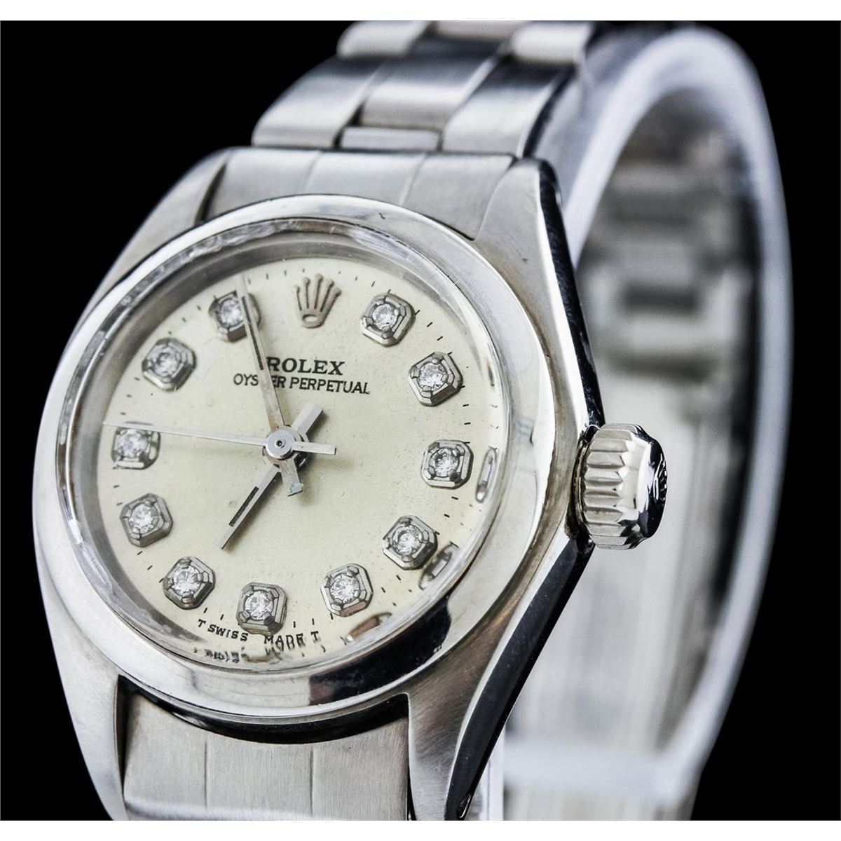 One ladies, vintage Lady Date Rolex Oyster Perpetual model Stainless Steel wristwatch electronically tested, Case: 25mm oyster, Crown: twinlock with logo, Bezel: polished, Custom Crystal: acrylic lens. Movement: mechanical stem wind, Custom Dial: Silvered, with pointed hands and diamond markers, Circa: 1972, Condition: G-4 Average, Bracelet: bright polish & brushed finish stainless steel tapering oyster link. Seven and one quarter inch length, adjustable. Total Weight of Watch 39.63 grams. AIG Appraised at $3,050.00.