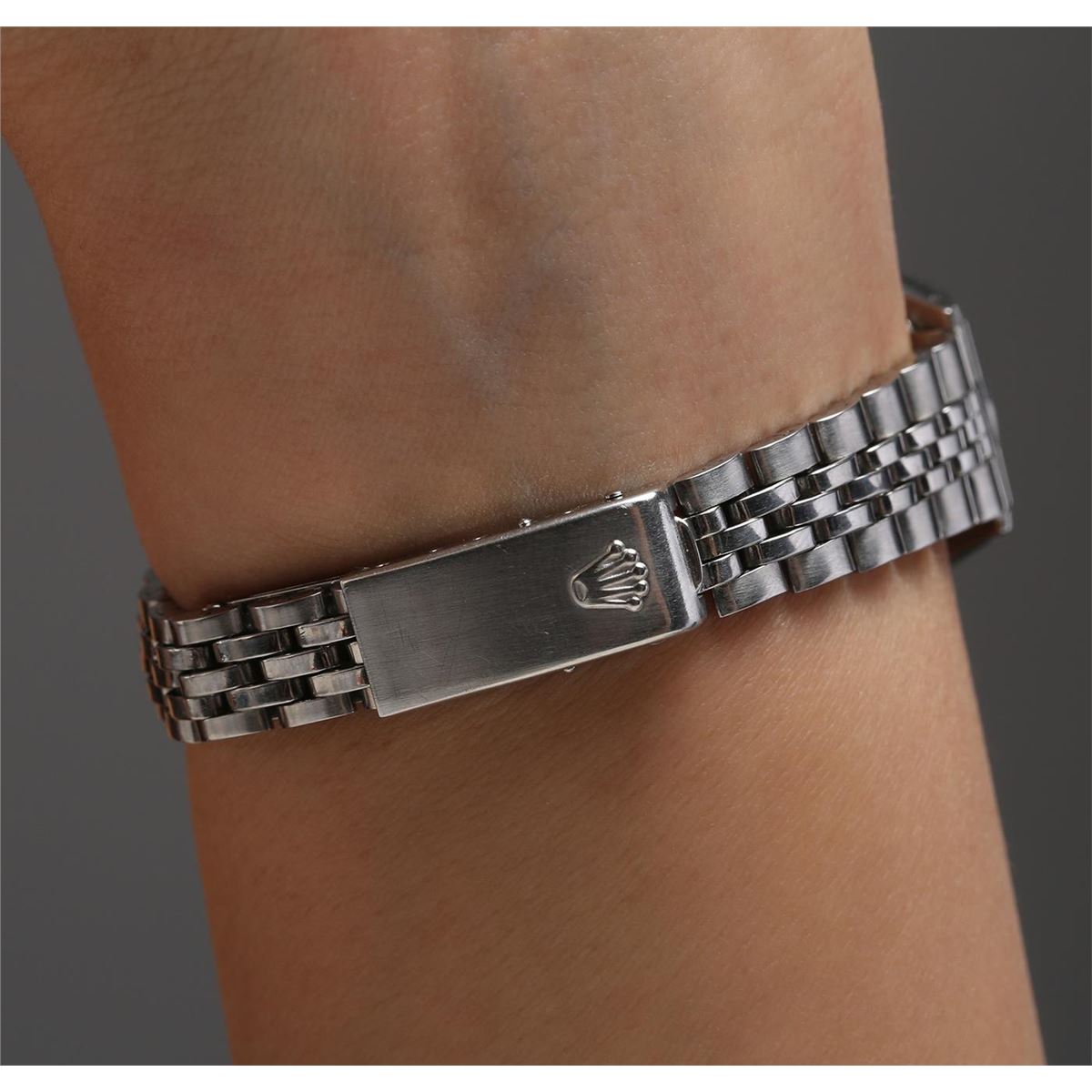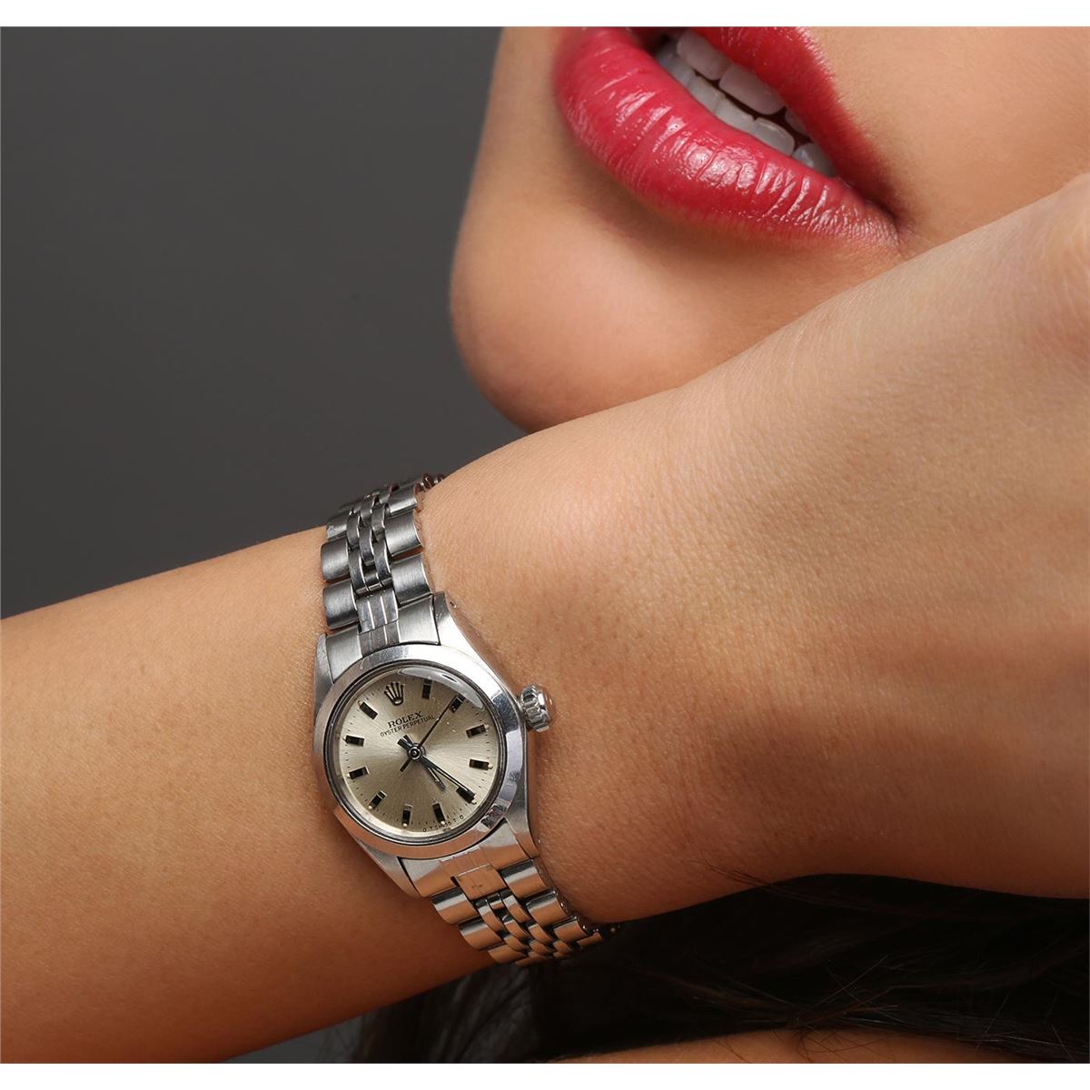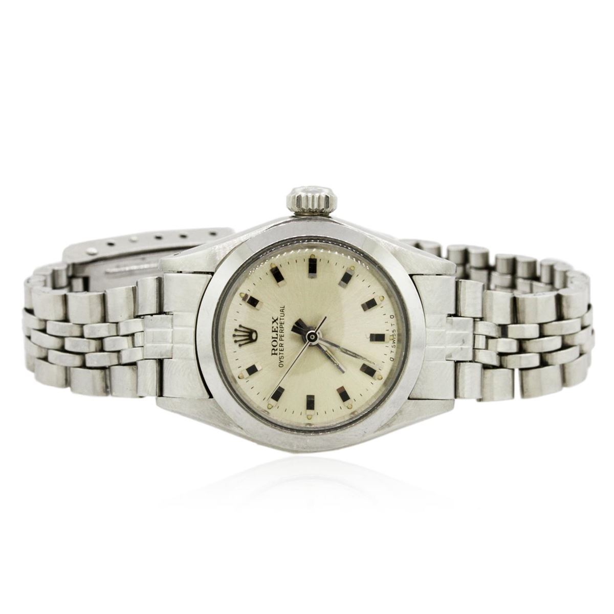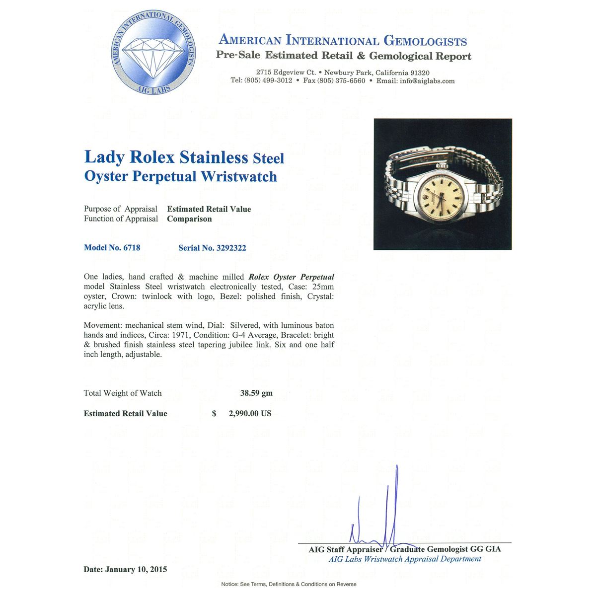 One ladies, hand crafted & machine milled Rolex Oyster Perpetual model Stainless Steel wristwatch electronically tested, Case: 25mm oyster, Crown: twinlock with logo, Bezel: polished finish, Crystal: acrylic lens. Movement: mechanical stem wind, Dial: Silvered, with luminous baton hands and indices, Circa: 1971, Condition: G-4 Average, Bracelet: bright & brushed finish stainless steel tapering jubilee link. Six and one half inch length, adjustable. Total Weight of Watch 38.59 grams. AIG Appraised at $2,990.00.