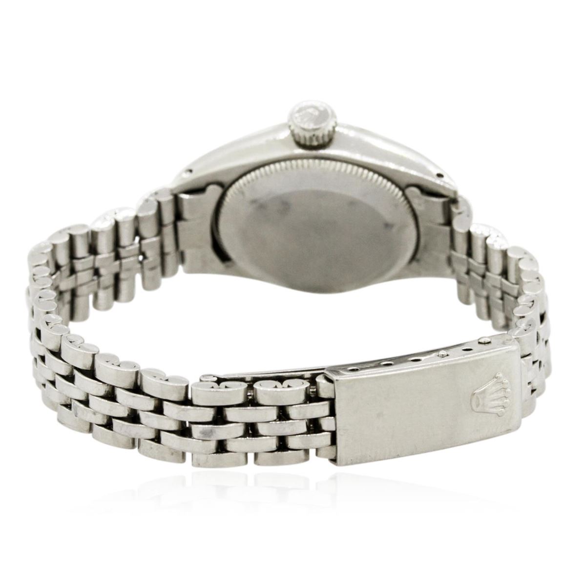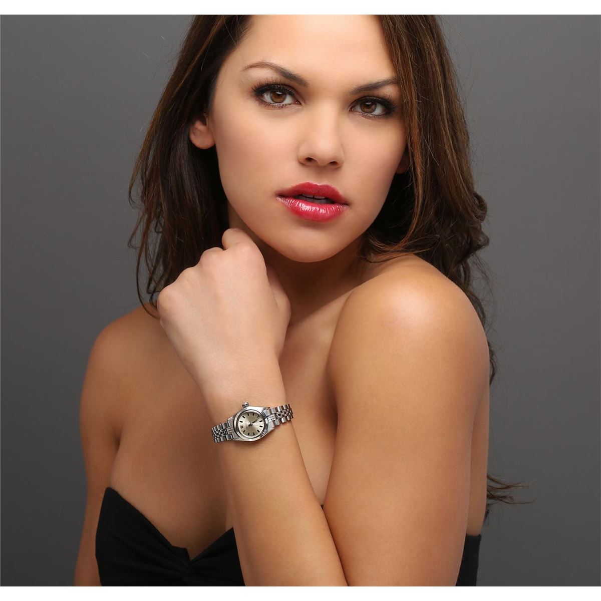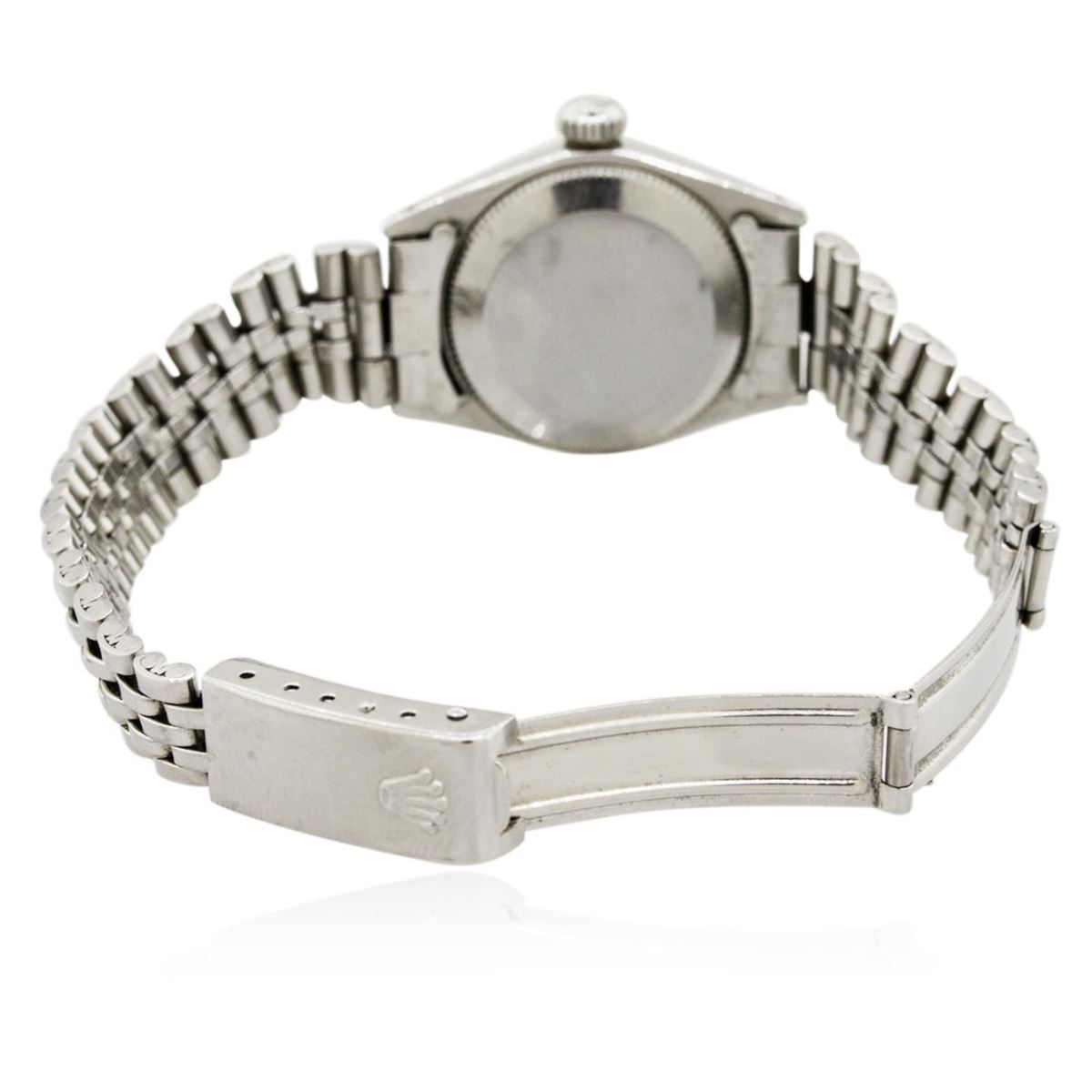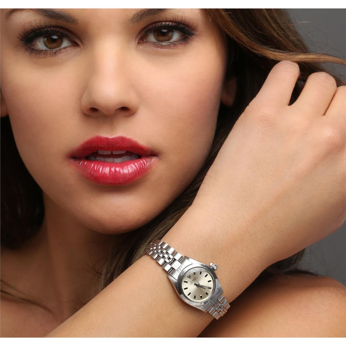 One ladies, hand crafted & machine milled Rolex Oyster Perpetual model Stainless Steel wristwatch electronically tested, Case: 25mm oyster, Crown: twinlock with logo, Bezel: polished finish, Crystal: acrylic lens. Movement: mechanical stem wind, Dial: Silvered, with luminous baton hands and indices, Circa: 1971, Condition: G-4 Average, Bracelet: bright & brushed finish stainless steel tapering jubilee link. Six and one half inch length, adjustable. Total Weight of Watch 38.59 grams. AIG Appraised at $2,990.00.