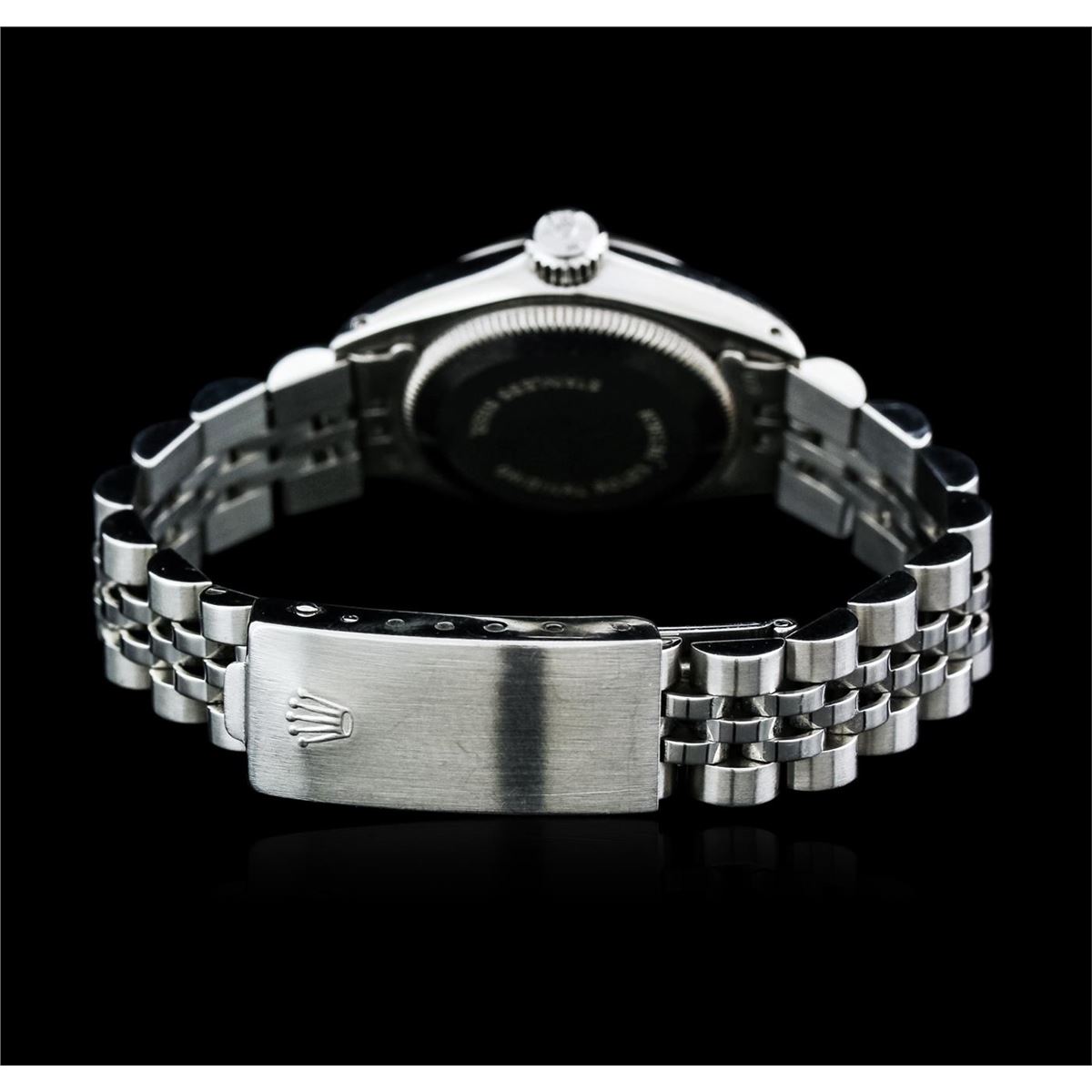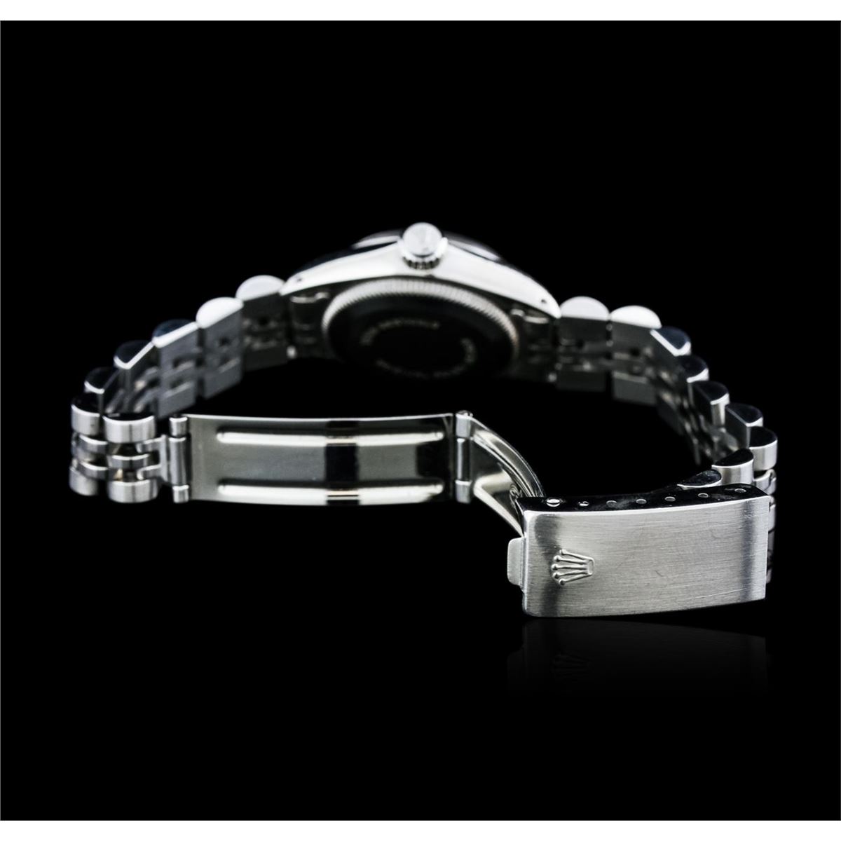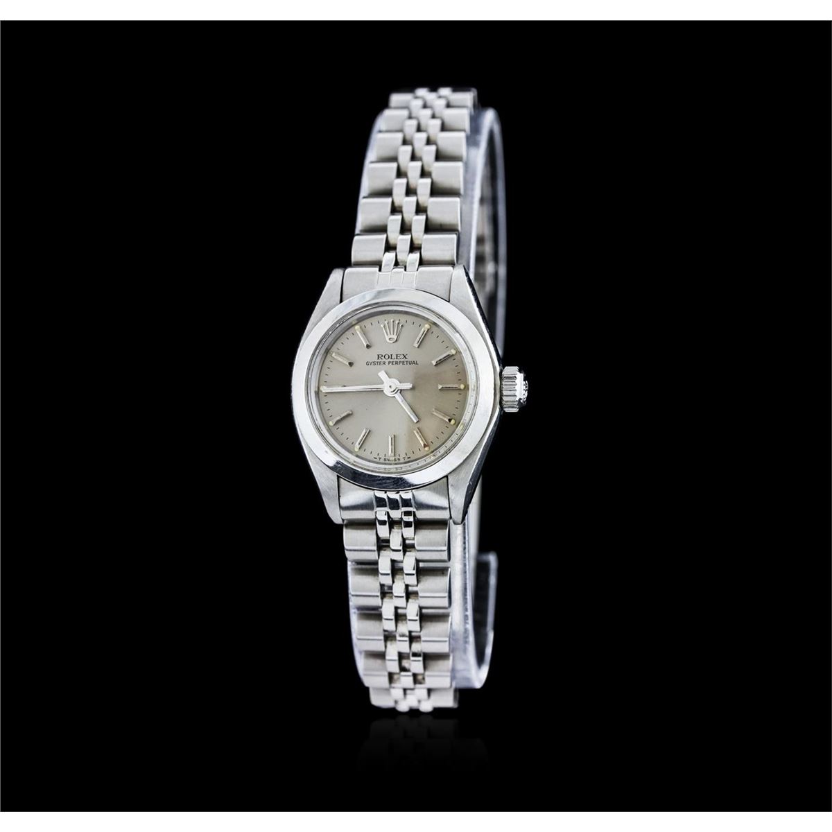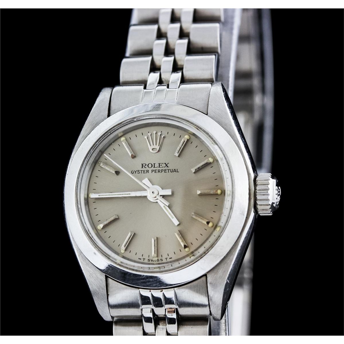 One ladies, vintage Rolex Oyster Perpetual model Stainless Steel wristwatch electronically tested, Case: 25mm oyster, Crown: twinlock with logo, Bezel: polished, Custom Crystal: acrylic lens. Movement: mechanical, stem wind, Dial: Gray, with baton hands and indices, Circa: 1982, Condition: G-5 Fine, Bracelet: bright polish & satin finish stainless steel jubilee link. Five and three quarter inch length, adjustable. Standard clasp, with logo. Total Weight of Watch 42.86 grams. AIG Appraised at $2,880.00.