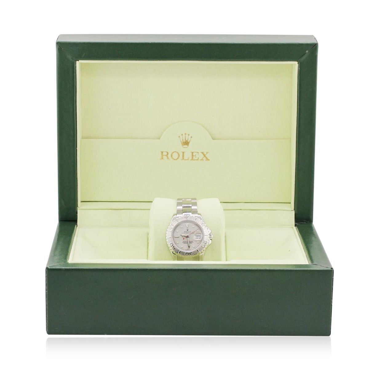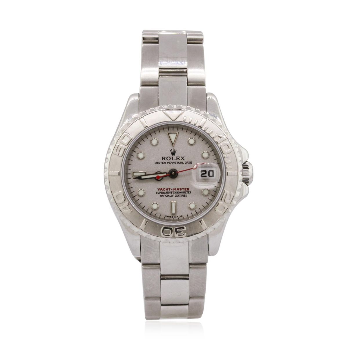 One ladies, hand crafted & machine milled Rolex stainless steel Yacht-Master wristwatch electronically tested, Case: 29mm oyster, Crown: twinlock with logo, set within protective shoulders, Platinum Bezel: rotatable sixty minute time lapse, Crystal: synthetic sapphire cyclops lens. Movement: superlative chronometer, Dial: Platinum, with Blue luminous hands and indices, Circa: 2002, Date Window: 3 o'clock position quick set, Bracelet: Stainless Steel oyster, Bright polish and brushed finish, Condition: G-6 Extra Fine. Six and one half inch length, adjustable. Three removable links. Total Weight of Watch 72.12 grams. AIG Appraised at $8,990.00.