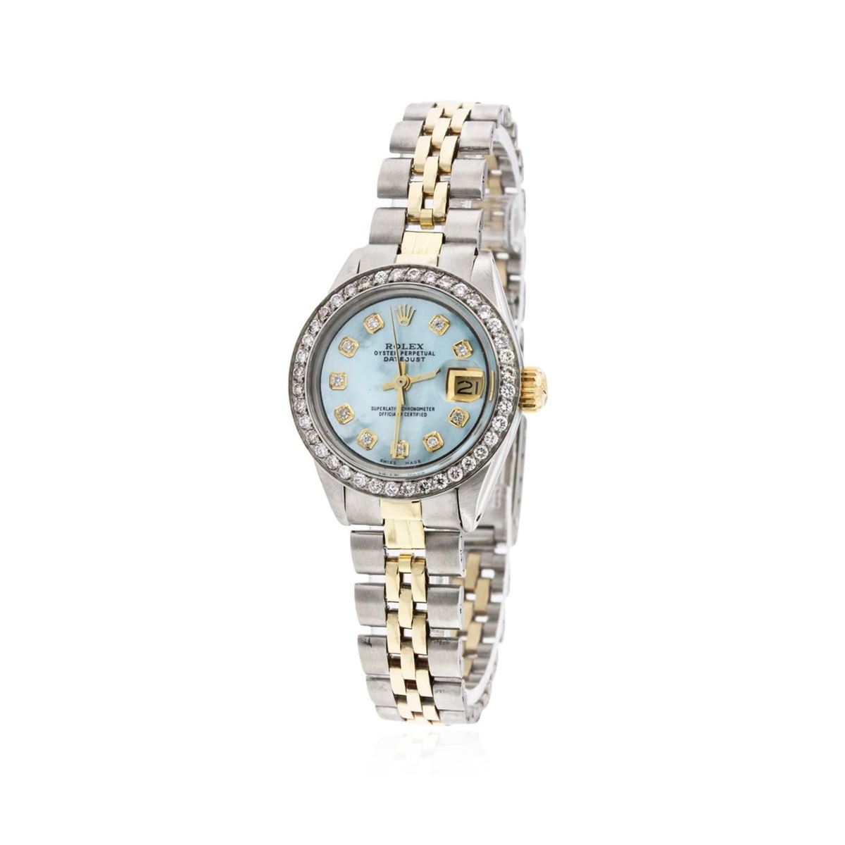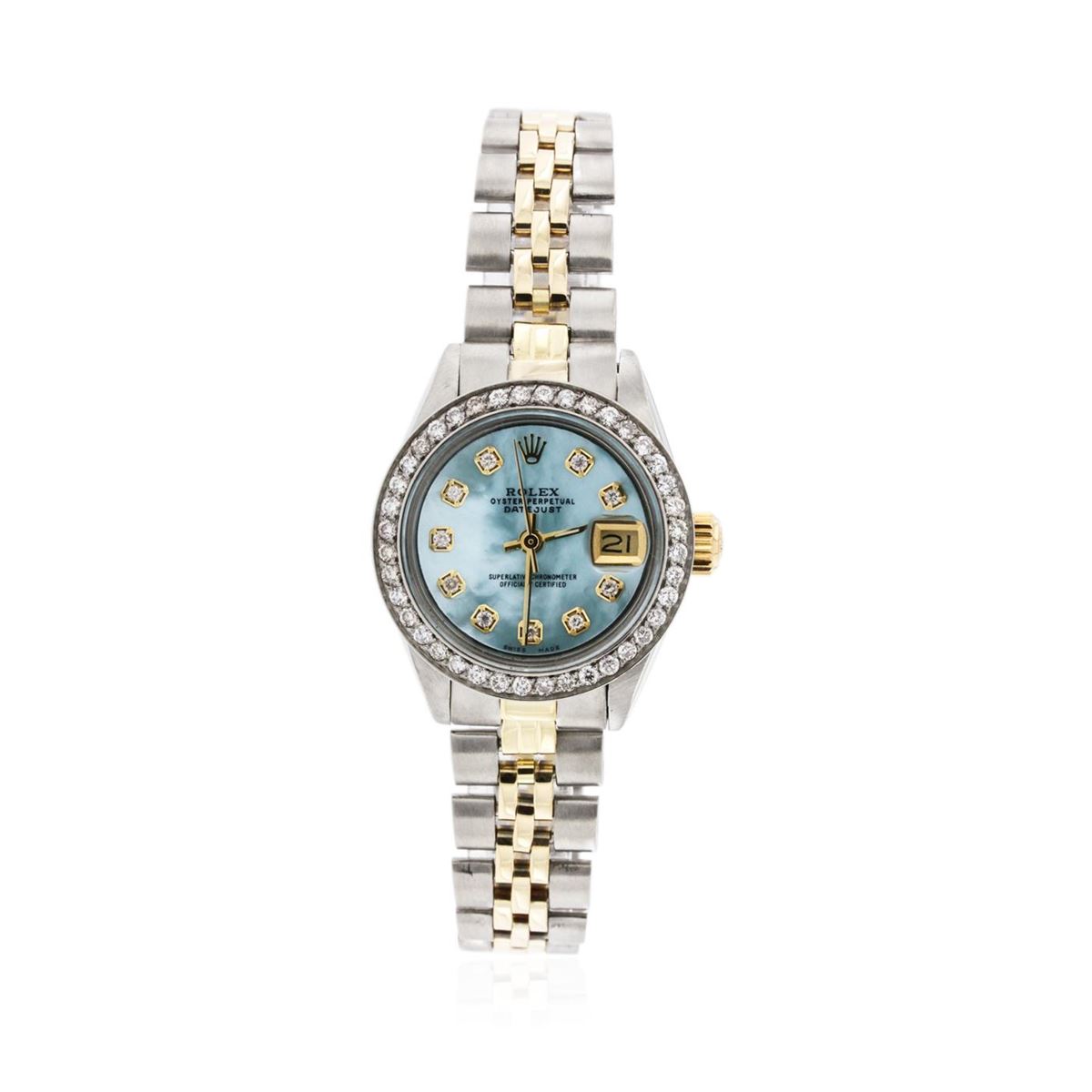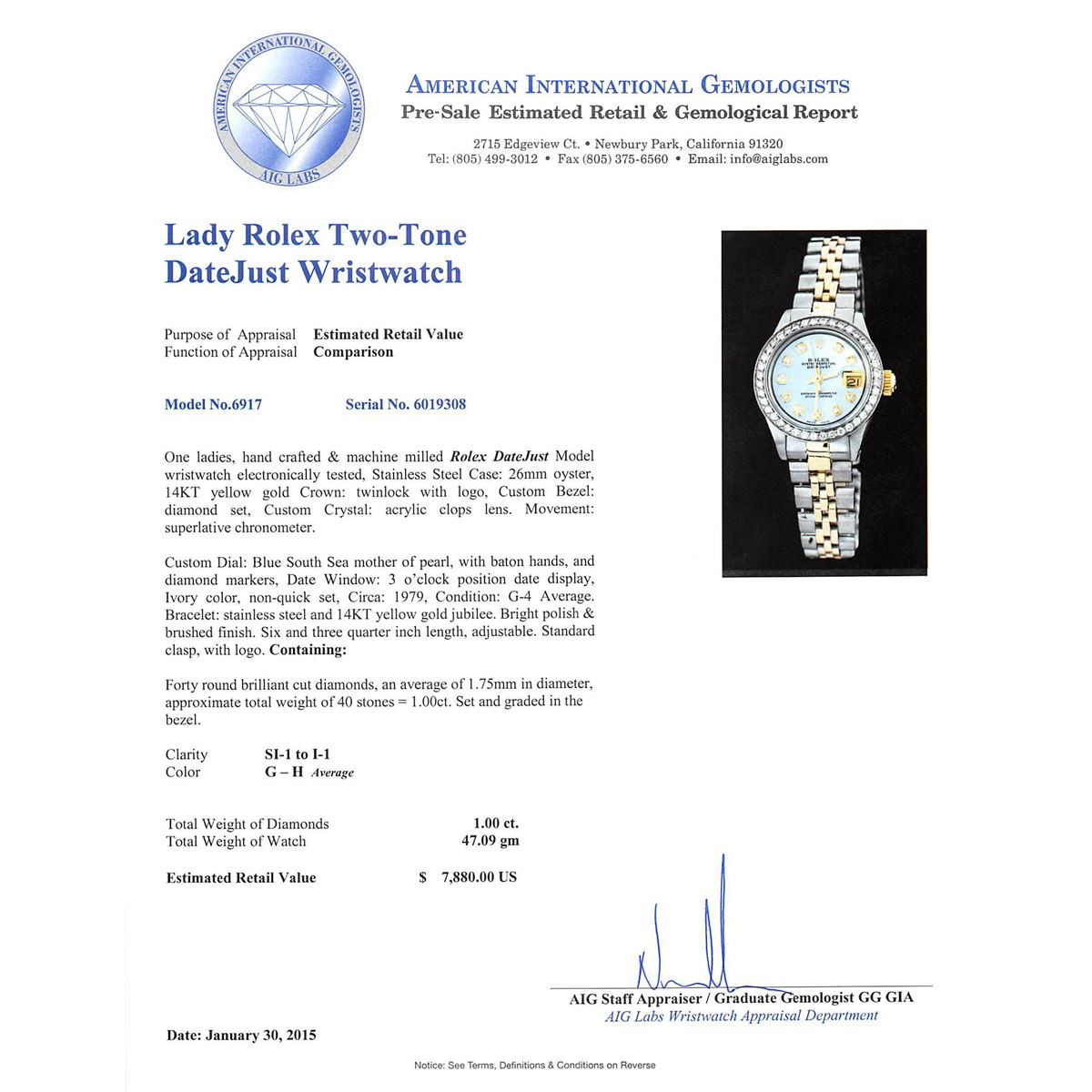 One ladies, hand crafted & machine milled Rolex DateJust Model wristwatch electronically tested, Stainless Steel Case: 26mm oyster, 14KT yellow gold Crown: twinlock with logo, Custom Bezel: diamond set, Custom Crystal: acrylic clops lens. Movement: superlative chronometer. Custom Dial: Blue South Sea mother of pearl, with baton hands, and diamond markers, Date Window: 3 o'clock position date display, Ivory color, non-quick set, Circa: 1979, Condition: G-4 Average. Bracelet: stainless steel and 14KT yellow gold jubilee. Bright polish & brushed finish. Six and three quarter inch length, adjustable. Standard clasp, with logo. Containing: Forty round brilliant cut diamonds, an average of 1.75mm in diameter, approximate. Total Weight of 40 stones = 1.00ct. Set and graded in the bezel. Clarity: SI-1 to I-1. Color: G - H Average. Total Weight of Diamonds 1.00ct. Total Weight of Watch 47.09 grams. AIG Appraised at $7,880.00.