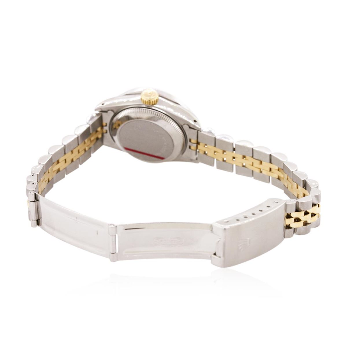 One ladies, hand crafted & machine milled Rolex DateJust Model wristwatch electronically tested, stainless steel Case: 26mm oyster, 18KT yellow gold Crown: twinlock with logo, Custom Bezel: diamond set, Custom Crystal: synthetic sapphire cyclops lens. Movement: superlative chronometer, Custom Dial: mother of pearl, with baton hands & diamond markers, Calendar: 3 o'clock position date display, quick set, Circa: 1987, Condition: G-5 Fine, Bracelet: stainless steel and 18KT yellow gold jubilee. Six inch length, adjustable. Standard clasp, with logo. Containing: Forty round brilliant diamonds, approximate total weight of 40 stones equals 1.15ct. Set & graded in the bezel. Clarity: SI-1 to SI-2. Color: G - I. Total Weight of Diamonds 1.15ct. Total Weight of Watch 53.58 grams. AIG Appraised at $9,050.00.
