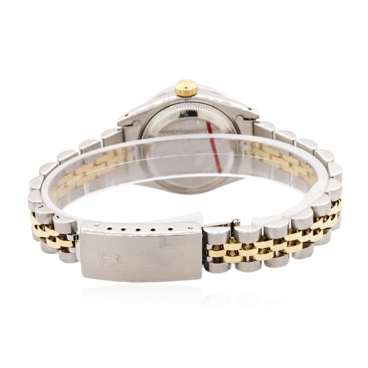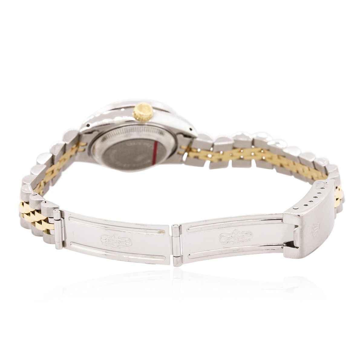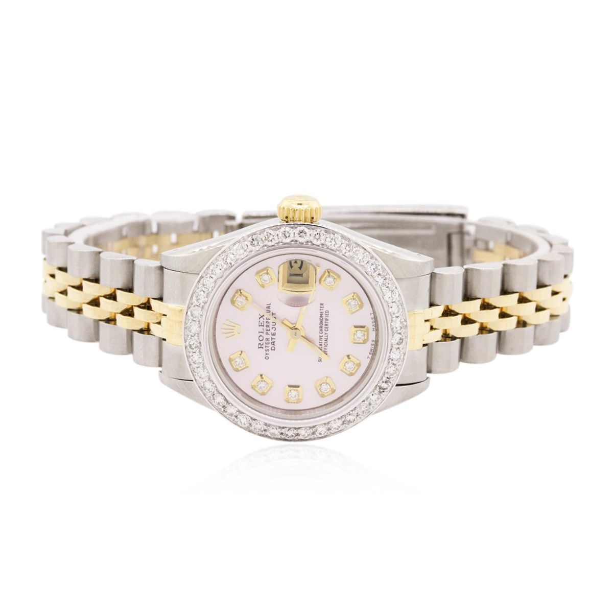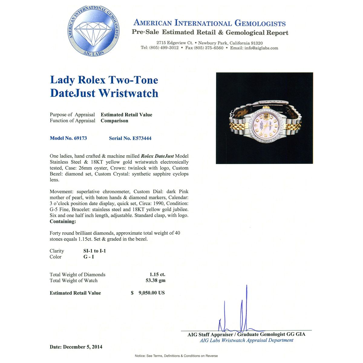 One ladies, hand crafted & machine milled Rolex DateJust Model Stainless Steel & 18KT yellow gold wristwatch electronically tested, Case: 26mm oyster, Crown: twinlock with logo, Custom Bezel: diamond set, Custom Crystal: synthetic sapphire cyclops lens. Movement: superlative chronometer, Custom Dial: dark Pink mother of pearl, with baton hands & diamond markers, Calendar: 3 o'clock position date display, quick set, Circa: 1990, Condition: G-5 Fine, Bracelet: stainless steel and 18KT yellow gold jubilee. Six and one half inch length, adjustable. Standard clasp, with logo. Containing: Forty round brilliant diamonds, approximate total weight of 40 stones equals 1.15ct. Set & graded in the bezel. Clarity: SI-1 to I-1. Color: G - I. Total Weight of Diamonds 1.15ct. Total Weight of Watch 53.38 grams. AIG Appraised at $9,050.00.