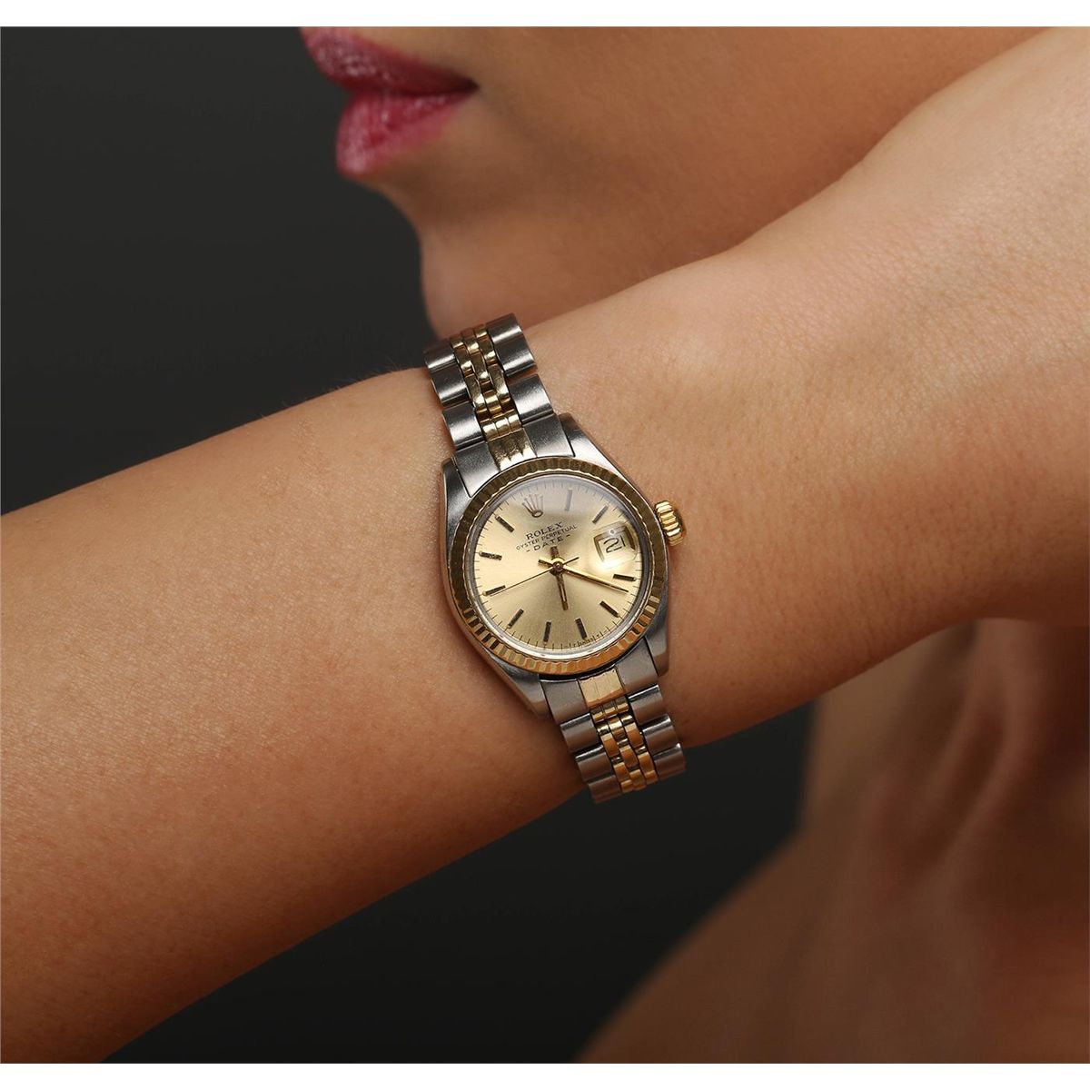 One ladies, hand crafted & machine milled Rolex Date Model wristwatch electronically tested, Stainless Steel Case: 26mm oyster, 14KT yellow gold Crown: twinlock with logo, Bezel: 14KT yellow gold fluted, Crystal: acrylic cyclops lens. Movement: mechanical stem wind, Dial: Champagne, with baton hands, and indices, Calendar: 3 o'clock position date display, non-quick set, Circa: 1978, Bracelet: stainless steel and 14KT yellow gold Jubilee. Condition: G-4 Average. Five and three quarter inch length, adjustable. Standard clasp, with logo.Total Weight of Watch 52.15gm. AIG Appraised at $4,990.00.