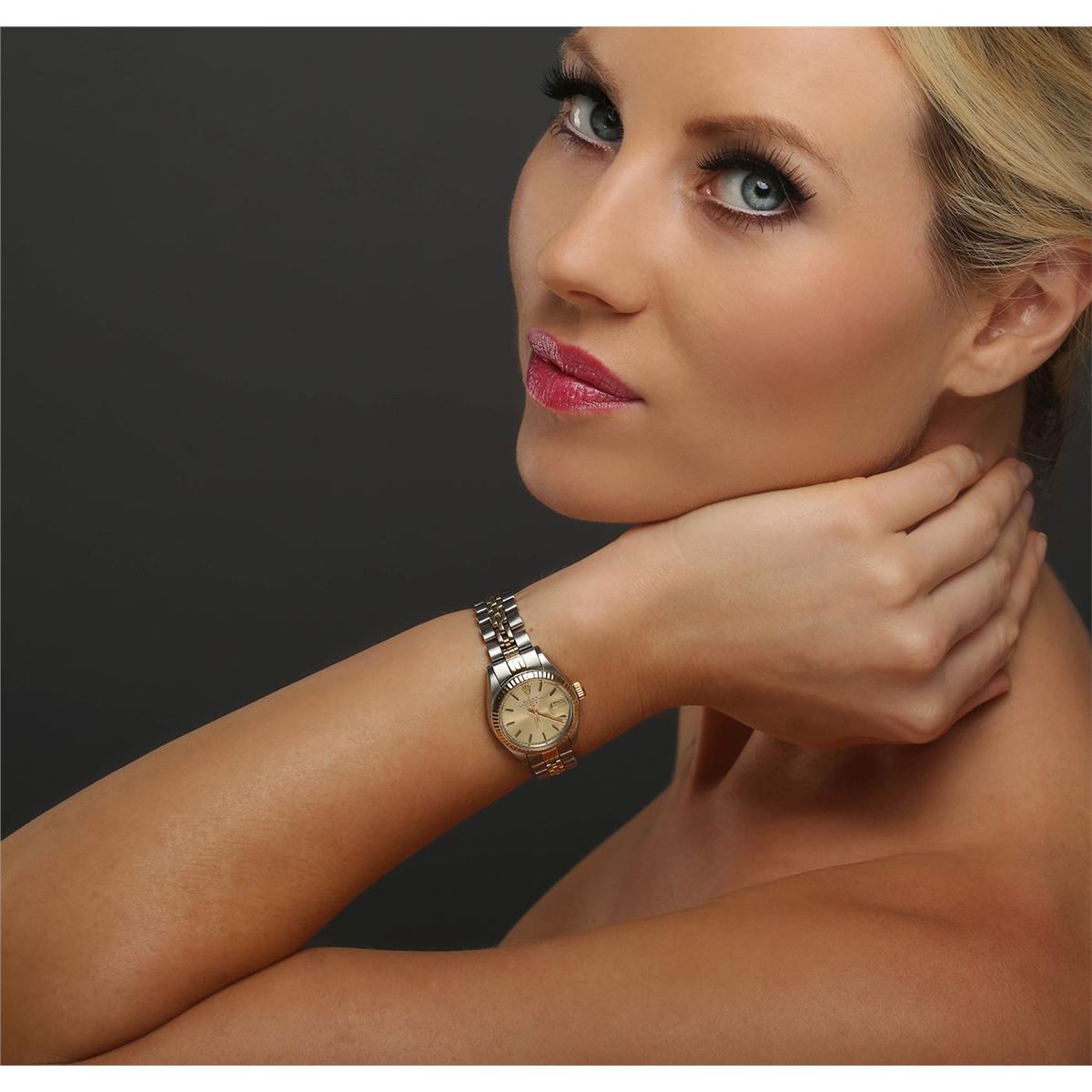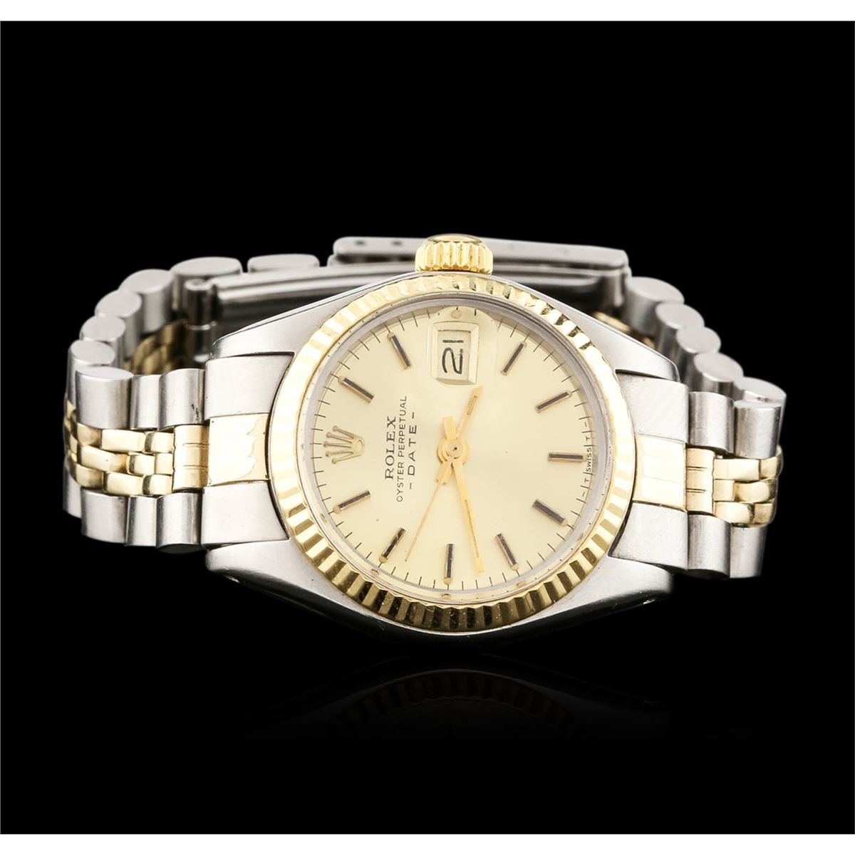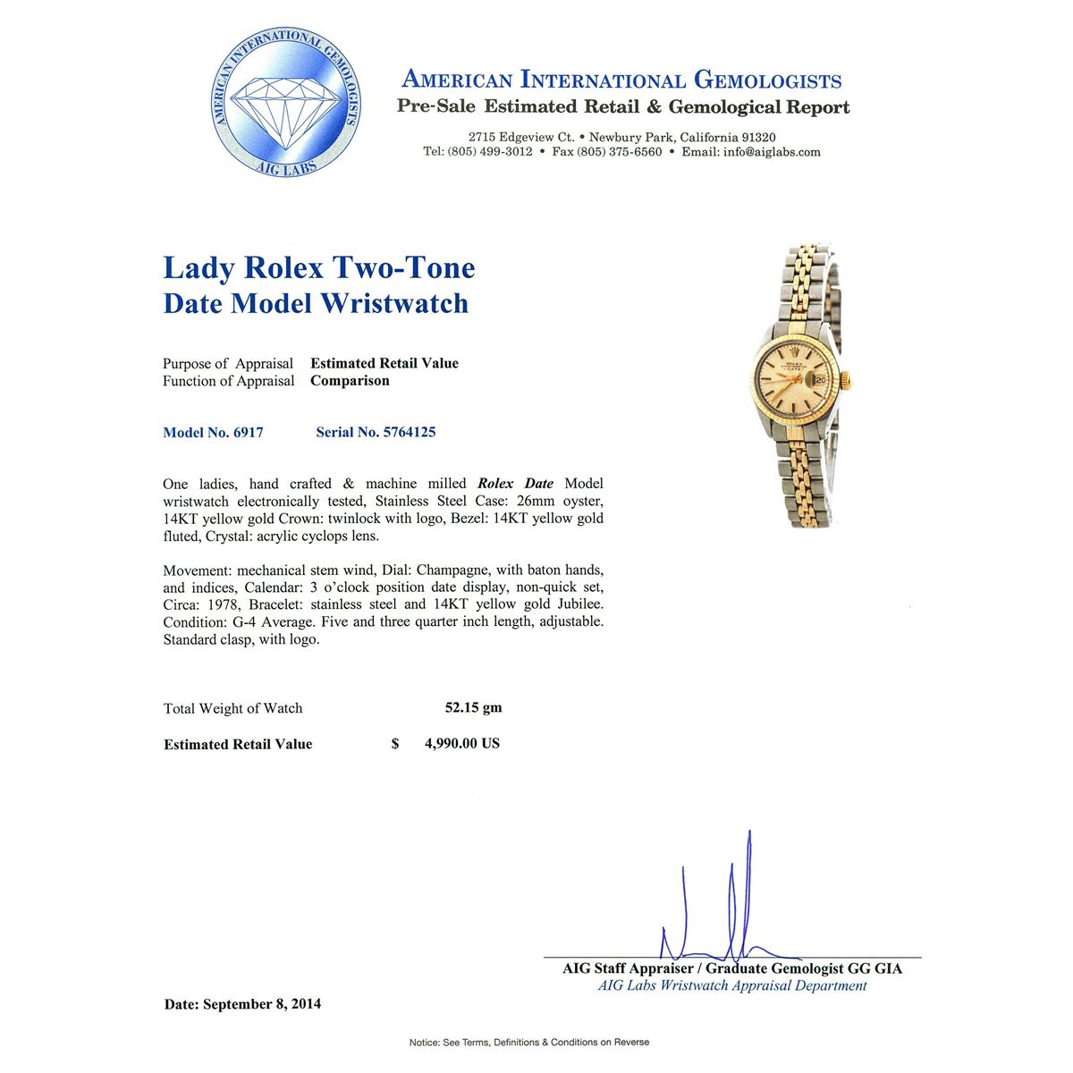 One ladies, hand crafted & machine milled Rolex Date Model wristwatch electronically tested, Stainless Steel Case: 26mm oyster, 14KT yellow gold Crown: twinlock with logo, Bezel: 14KT yellow gold fluted, Crystal: acrylic cyclops lens. Movement: mechanical stem wind, Dial: Champagne, with baton hands, and indices, Calendar: 3 o'clock position date display, non-quick set, Circa: 1978, Bracelet: stainless steel and 14KT yellow gold Jubilee. Condition: G-4 Average. Five and three quarter inch length, adjustable. Standard clasp, with logo.Total Weight of Watch 52.15gm. AIG Appraised at $4,990.00.