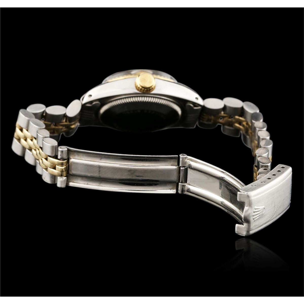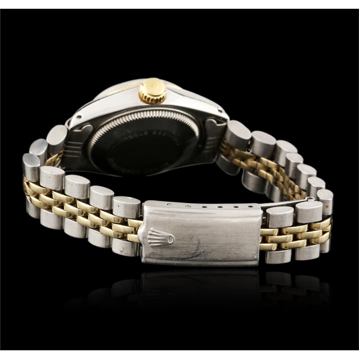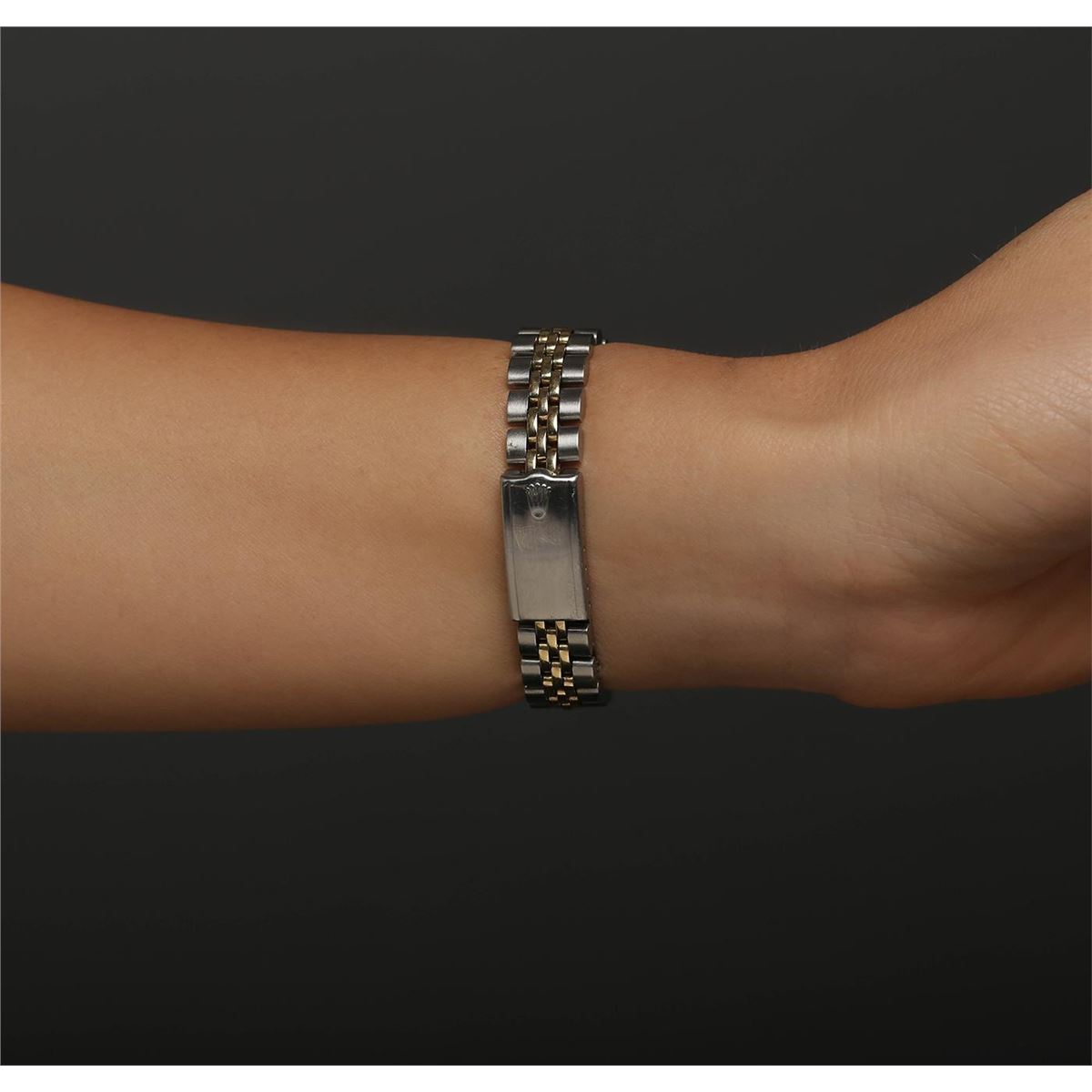 One ladies, hand crafted & machine milled Rolex Date Model wristwatch electronically tested, Stainless Steel Case: 26mm oyster, 14KT yellow gold Crown: twinlock with logo, Bezel: 14KT yellow gold fluted, Crystal: acrylic cyclops lens. Movement: mechanical stem wind, Dial: Champagne, with baton hands, and indices, Calendar: 3 o'clock position date display, non-quick set, Circa: 1978, Bracelet: stainless steel and 14KT yellow gold Jubilee. Condition: G-4 Average. Five and three quarter inch length, adjustable. Standard clasp, with logo.Total Weight of Watch 52.15gm. AIG Appraised at $4,990.00.