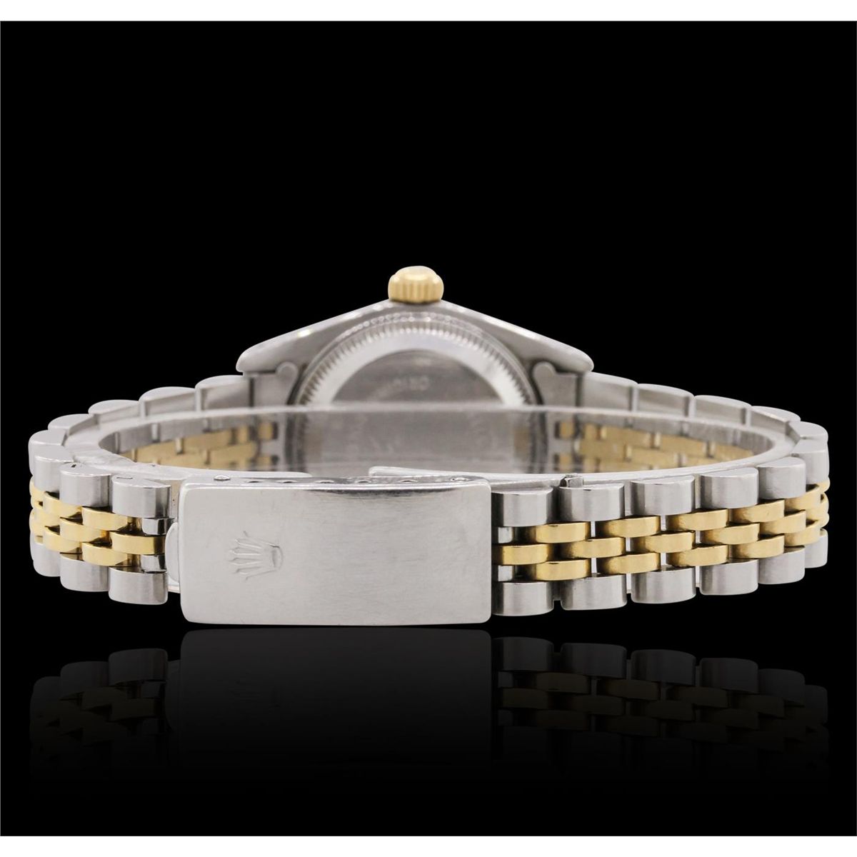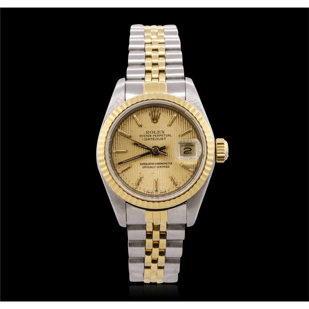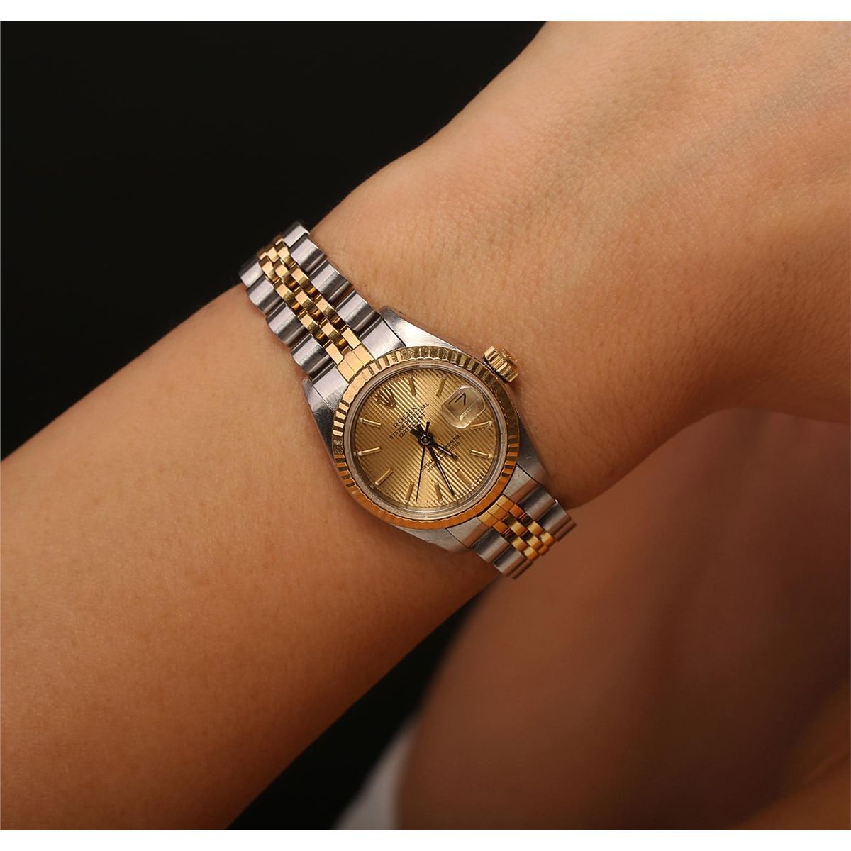 One ladies, hand crafted & machine milled Rolex DateJust Model wristwatch electronically tested, Stainless Steel Case: 26mm oyster, 18KT yellow gold Crown: twinlock with logo, Bezel: 18KT yellow gold fluted, Custom Crystal: synthetic sapphire cyclops lens. Movement: superlative chronometer, Tapestry Dial: Champagne, with baton style hands & indices, Calendar: 3 o'clock position date display, quick set, Circa: 1990, Condition: G-4 Average, Bracelet: stainless steel and 18KT yellow gold jubilee. Bright polish & satin finish. Six and three quarter inch length, adjustable. Standard clasp, with logo. Total Weight of Watch 55.40 grams. AIG Appraised at $7,990.00.