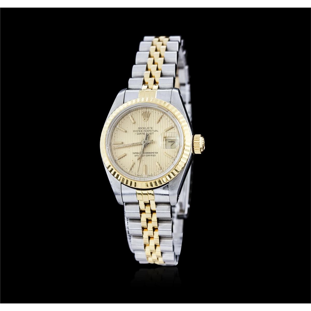 One ladies, hand crafted & machine milled Rolex DateJust Model wristwatch electronically tested, Stainless Steel Case: 26mm oyster, 18KT yellow gold Crown: twinlock with logo, Bezel: 18KT yellow gold fluted, Custom Crystal: synthetic sapphire cyclops lens. Movement: superlative chronometer, Tapestry Dial: Champagne, with baton style hands & indices, Calendar: 3 o'clock position date display, quick set, Circa: 1990, Condition: G-4 Average, Bracelet: stainless steel and 18KT yellow gold jubilee. Bright polish & satin finish. Six and three quarter inch length, adjustable. Standard clasp, with logo. Total Weight of Watch 55.40 grams. AIG Appraised at $7,990.00.