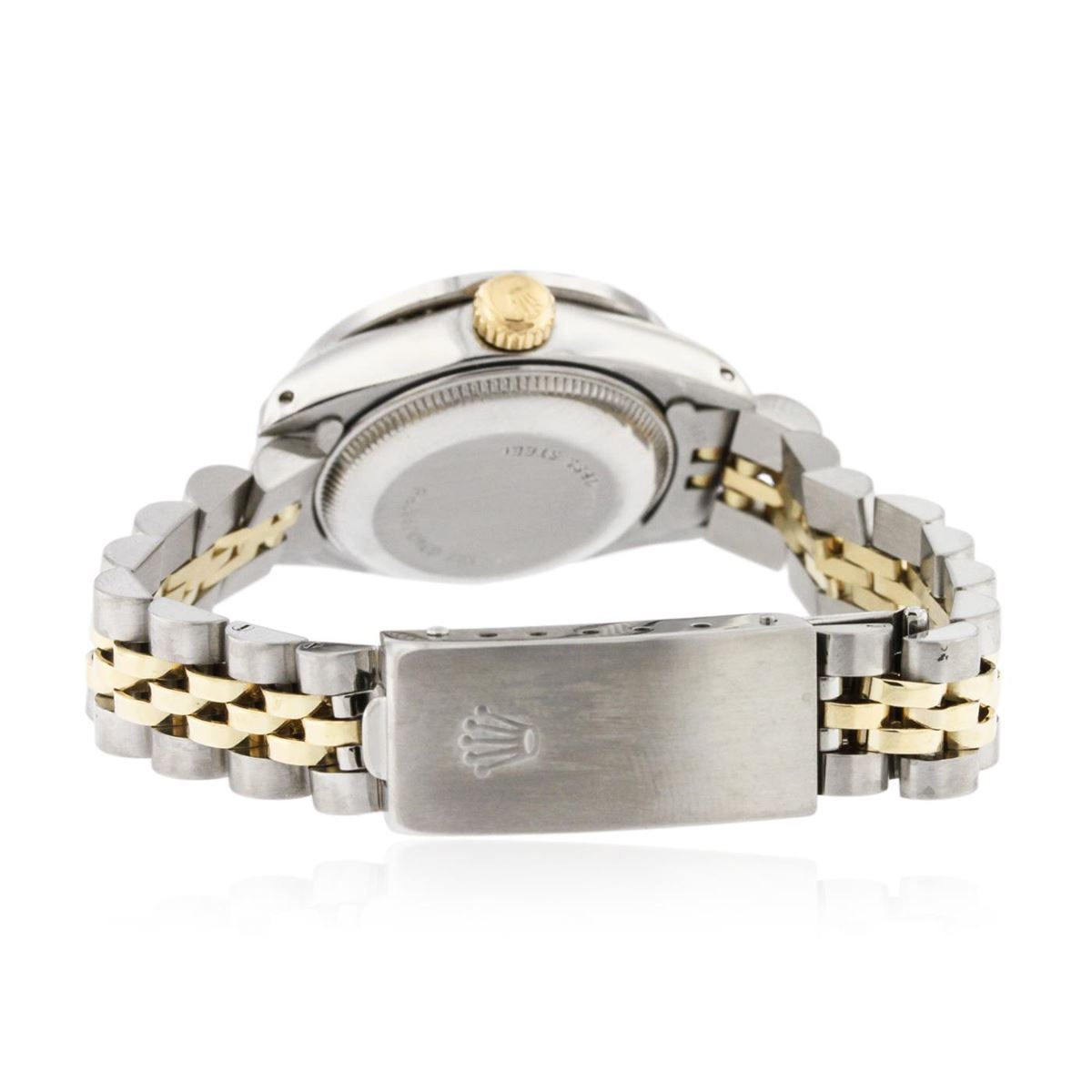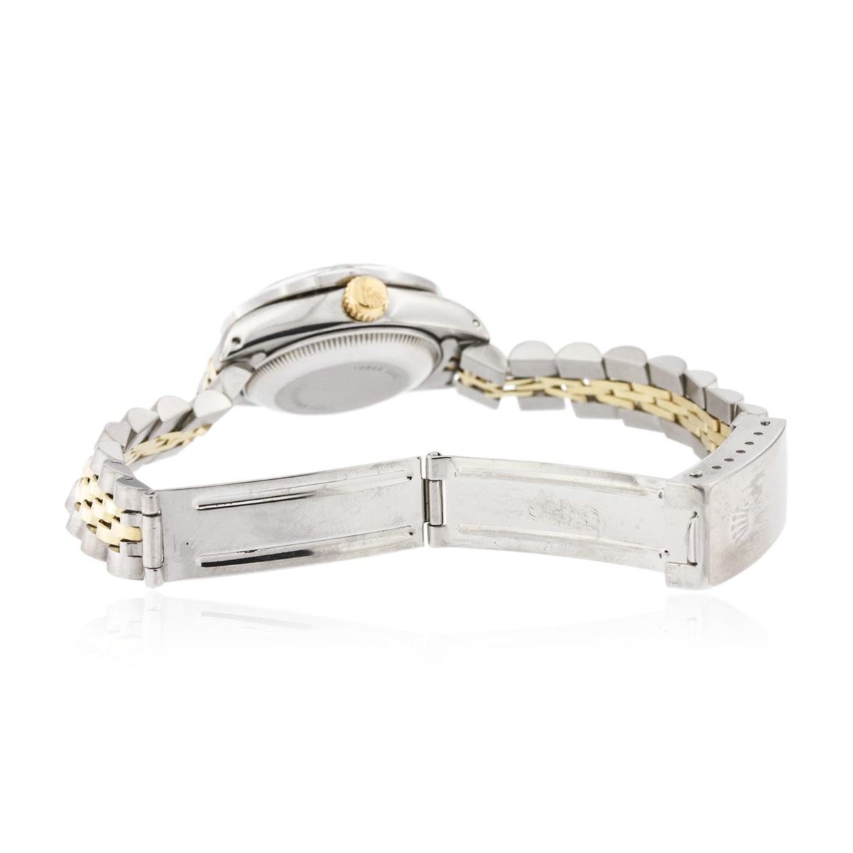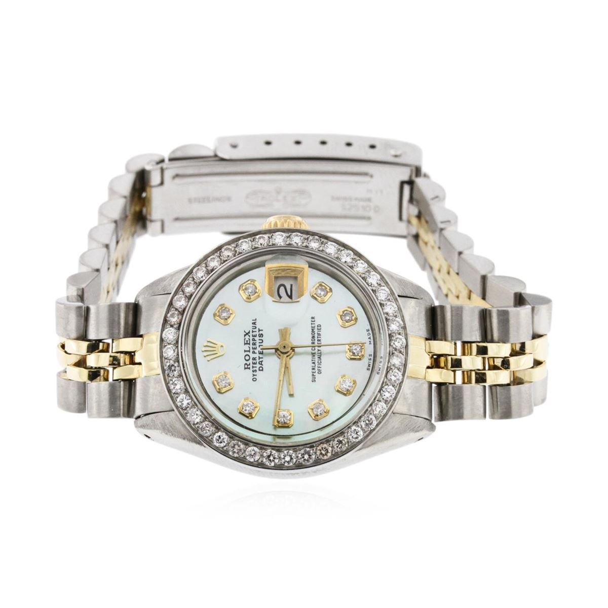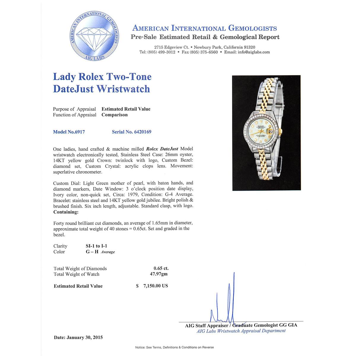 One ladies, hand crafted & machine milled Rolex DateJust Model wristwatch electronically tested, Stainless Steel Case: 26mm oyster, 14KT yellow gold Crown: twinlock with logo, Custom Bezel: diamond set, Custom Crystal: acrylic clops lens. Movement: superlative chronometer. Custom Dial: Light Green mother of pearl, with baton hands, and diamond markers, Date Window: 3 o'clock position date display, Ivory color, non-quick set, Circa: 1979, Condition: G-4 Average. Bracelet: stainless steel and 14KT yellow gold jubilee. Bright polish & brushed finish. Six inch length, adjustable. Standard clasp, with logo. Containing: Forty round brilliant cut diamonds, an average of 1.65mm in diameter, approximate. Total Weight of 40 stones = 0.65ct. Set and graded in the bezel. Clarity: SI-1 to I-1. Color: G - H Average. Total Weight of Diamonds 0.65ct. Total Weight of Watch 47.97 grams. AIG Appraised at $7,150.00.