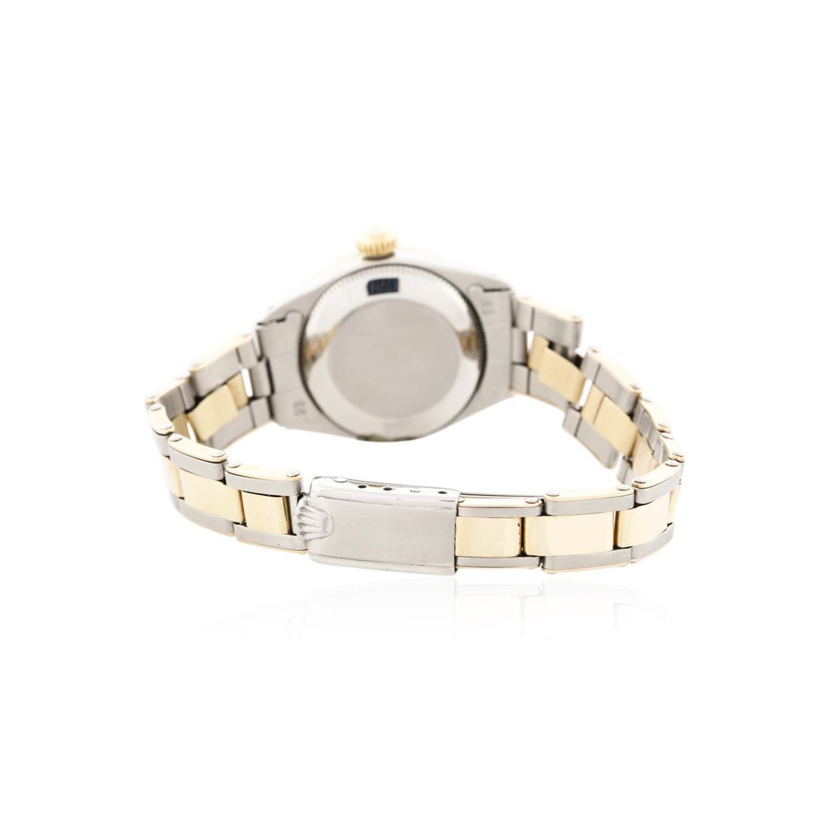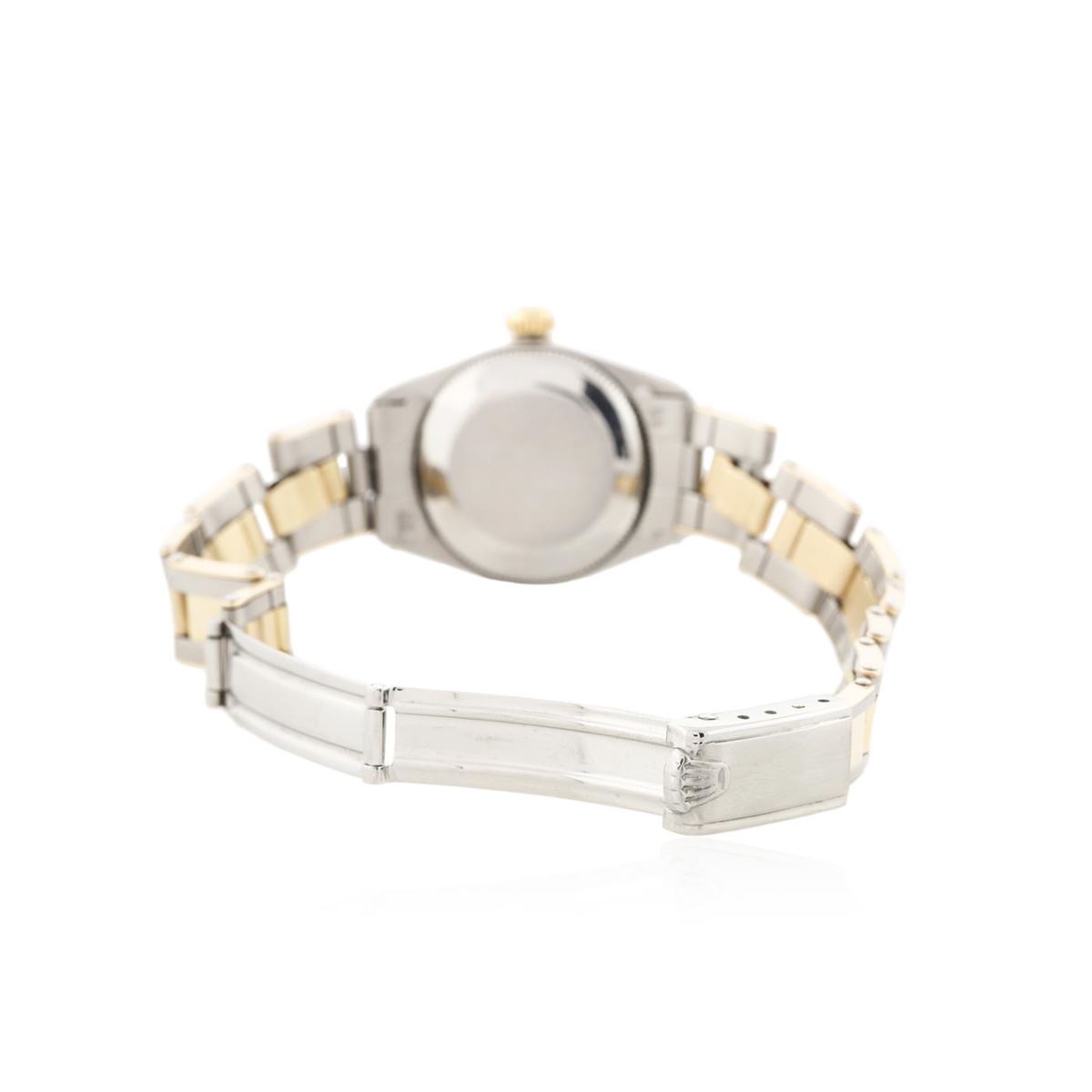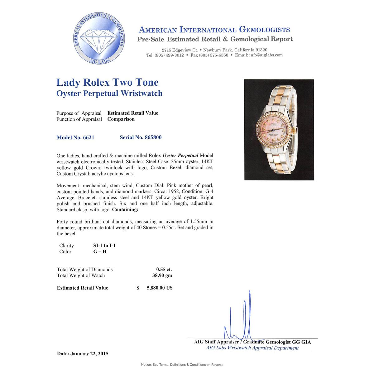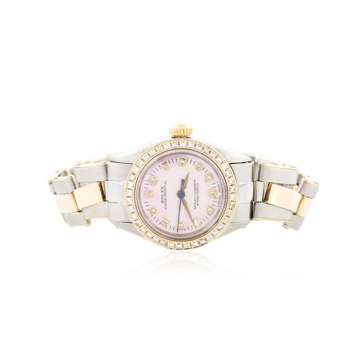 One ladies, hand crafted & machine milled Rolex Oyster Perpetual Model wristwatch electronically tested, Stainless Steel Case: 25mm oyster, 14KT yellow gold Crown: twinlock with logo, Custom Bezel: diamond set, Custom Crystal: acrylic cyclops lens. Movement: mechanical, stem wind, Custom Dial: Pink mother of pearl, custom pointed hands, and diamond markers, Circa: 1952, Condition: G-4 Average. Bracelet: stainless steel and 14KT yellow gold oyster. Bright polish and brushed finish. Six and one half inch length, adjustable. Standard clasp, with logo. Containing: Forty round brilliant cut diamonds, measuring an average of 1.55mm in diameter, approximate. Total Weight of 40 Stones = 0.55ct. Set and graded in the bezel. Clarity SI-1 to I-1. Color: G - H. Total Weight of Diamonds 0.55ct. Total Weight of Watch 38.90 grams. AIG Appraised at $5,880.00.