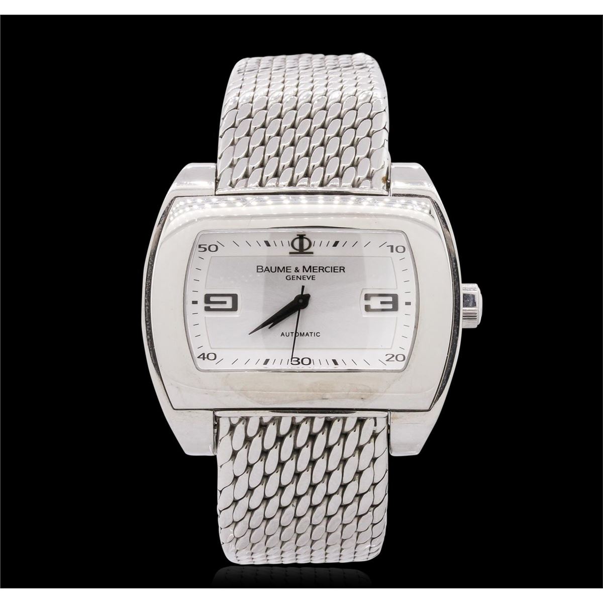 One ladies stainless steel Baume Mercier Hampton City Series Women's Watch. The watch features: curved rectangular stainless steel lugs and case (32mm length x 49mm width including crown x 14mm thickness.