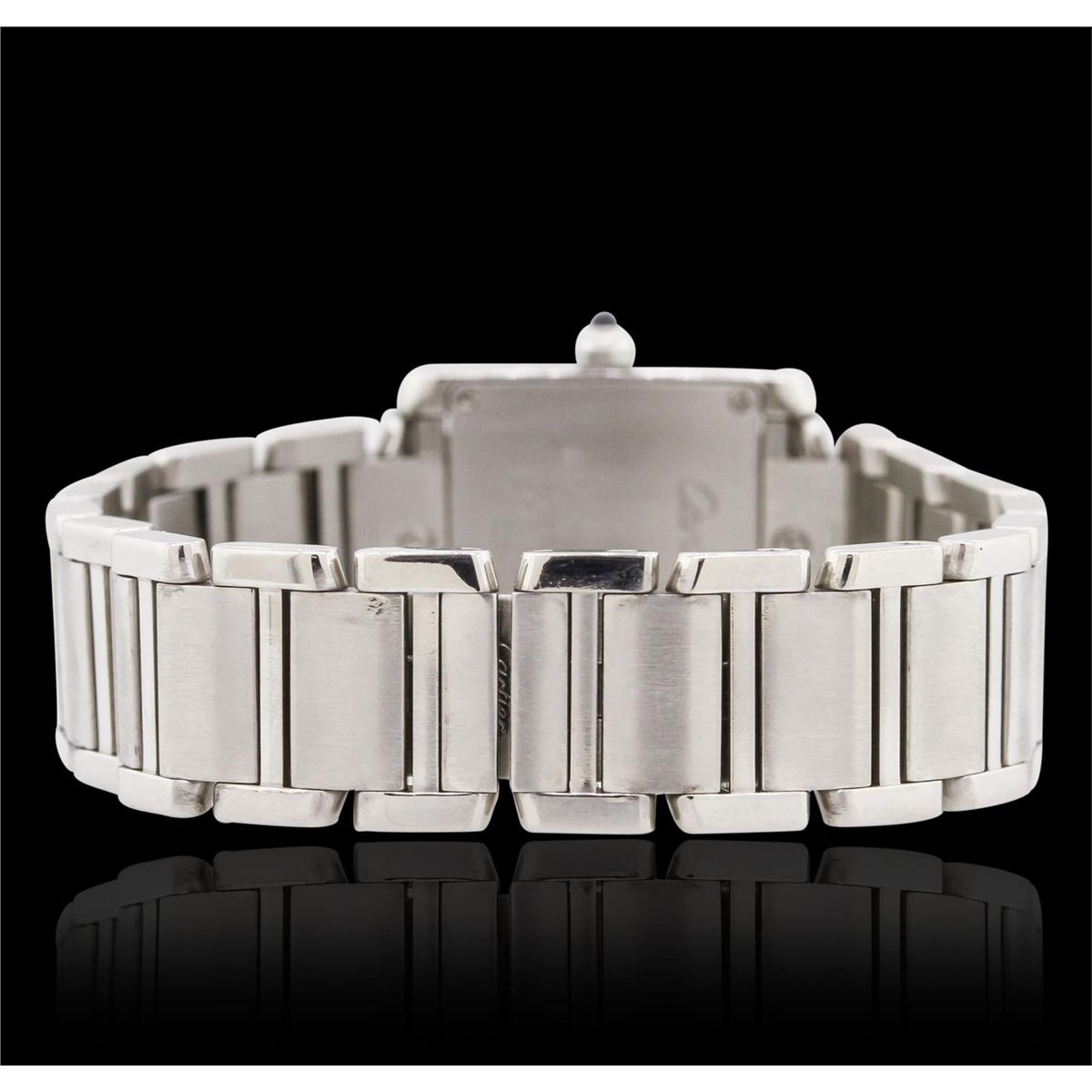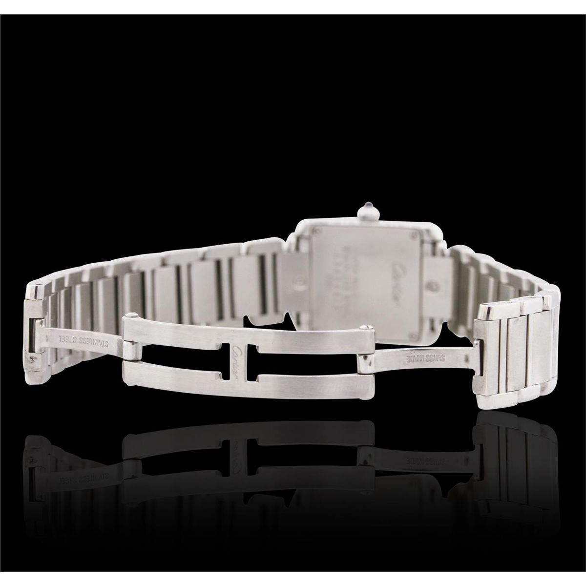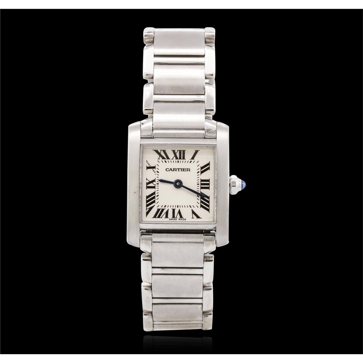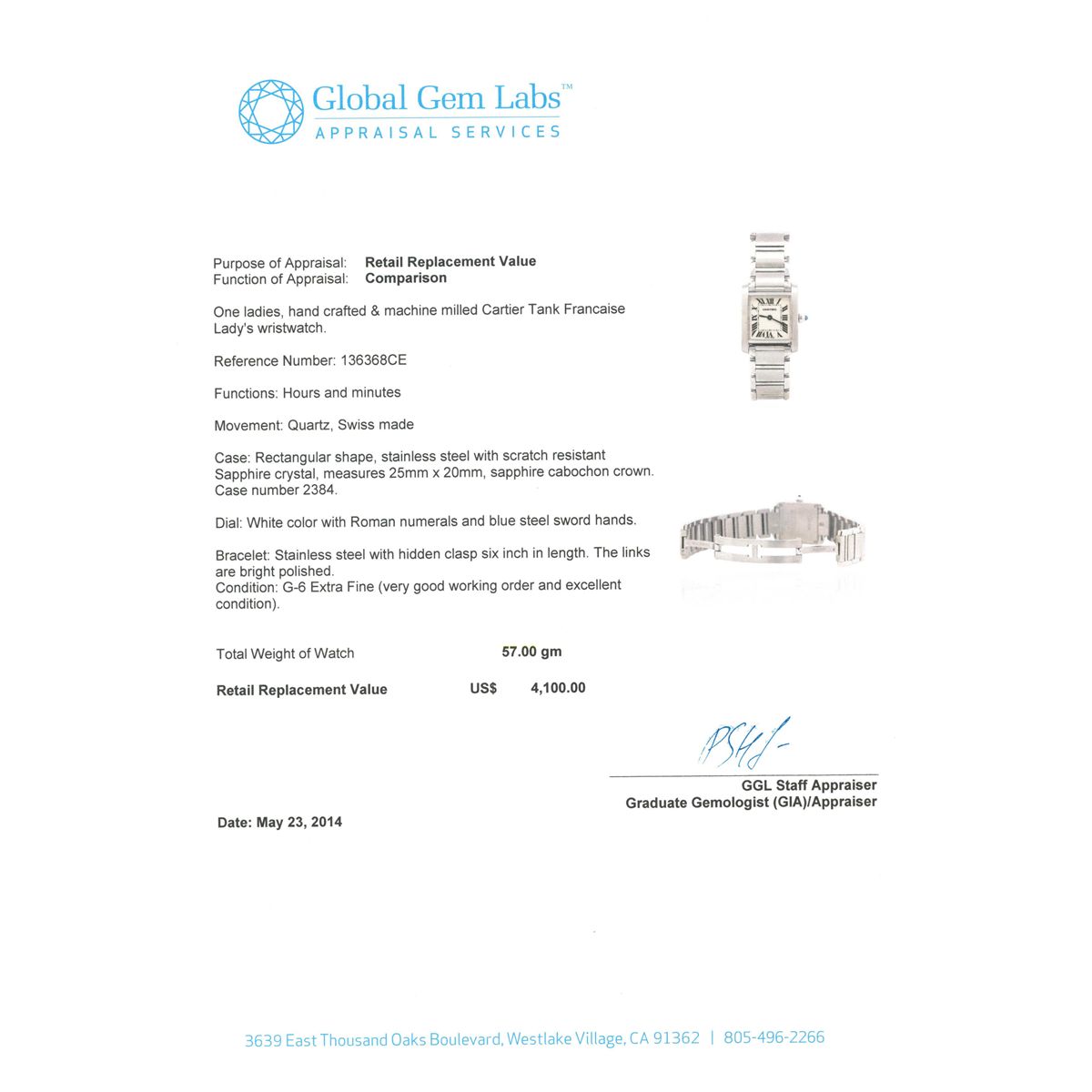 One ladies, hand crafted & machine milled Cartier Tank Francaise Lady's wristwatch. Reference Number: 136368CE Functions: Hours and minutes Movement: Quartz, Swiss made, Case: Rectangular shape, stainless steel with scratch resistant Sapphire crystal, measures 25mm x 20mm, sapphire cabochon crown. Case number 2384. Dial: White color with Roman numerals and blue steel sword hands. Bracelet: Stainless steel with hidden clasp six inch in length. The links are bright polished. Condition: G-6 Extra Fine (very good working order and excellent condition). Total Weight of 57.00 grams. GGL Appraised at $4,100.00.
