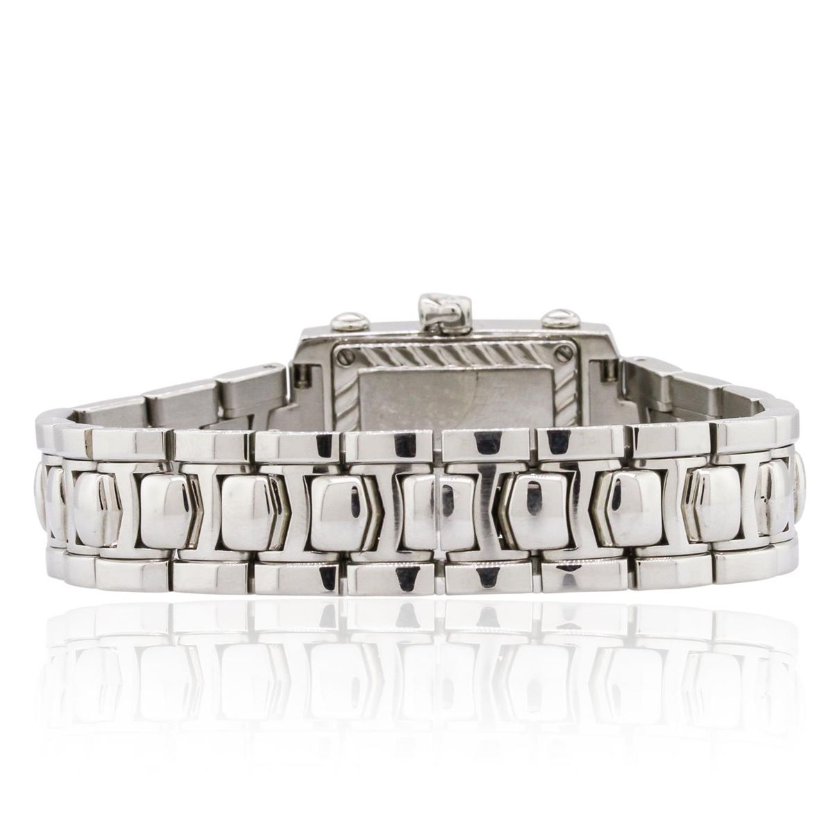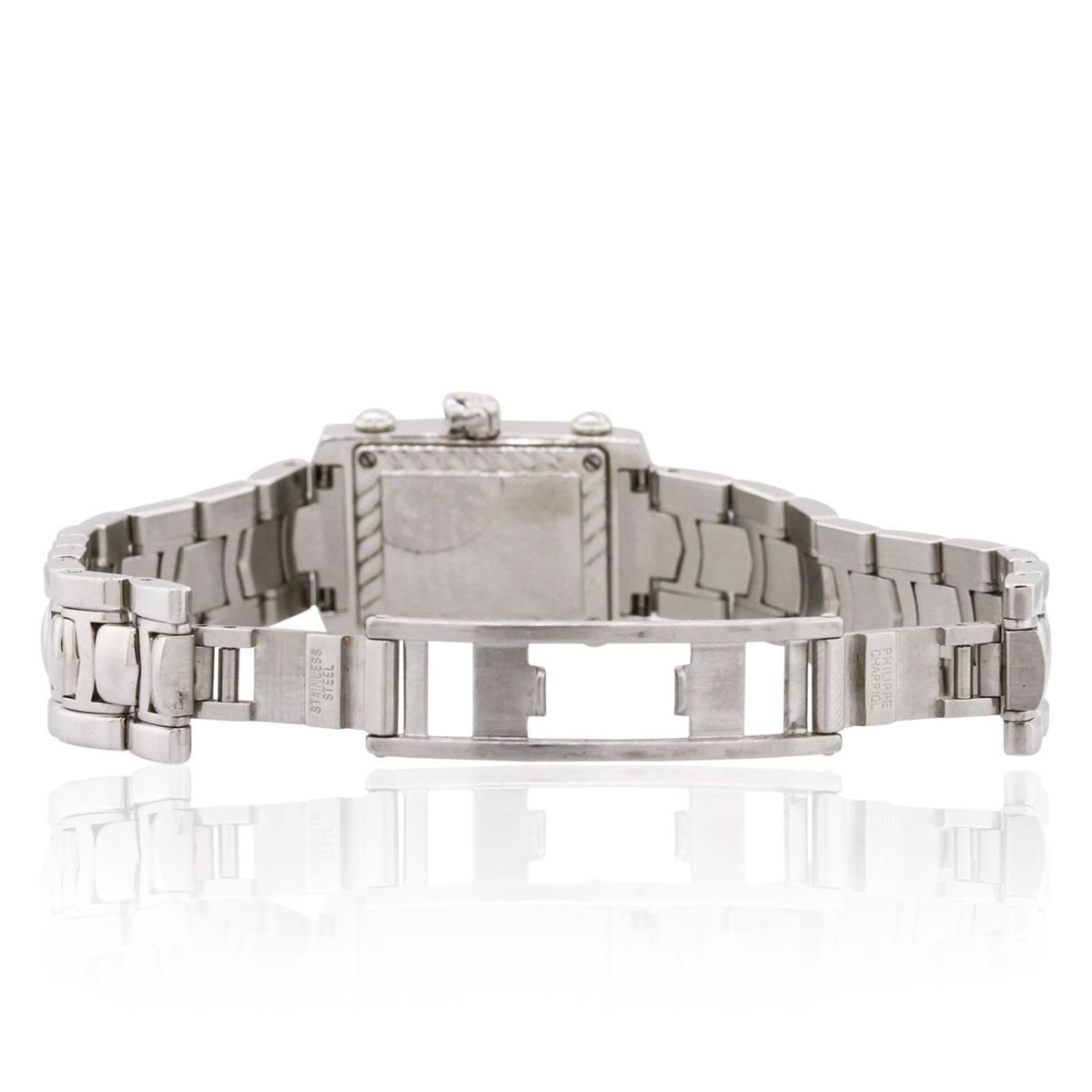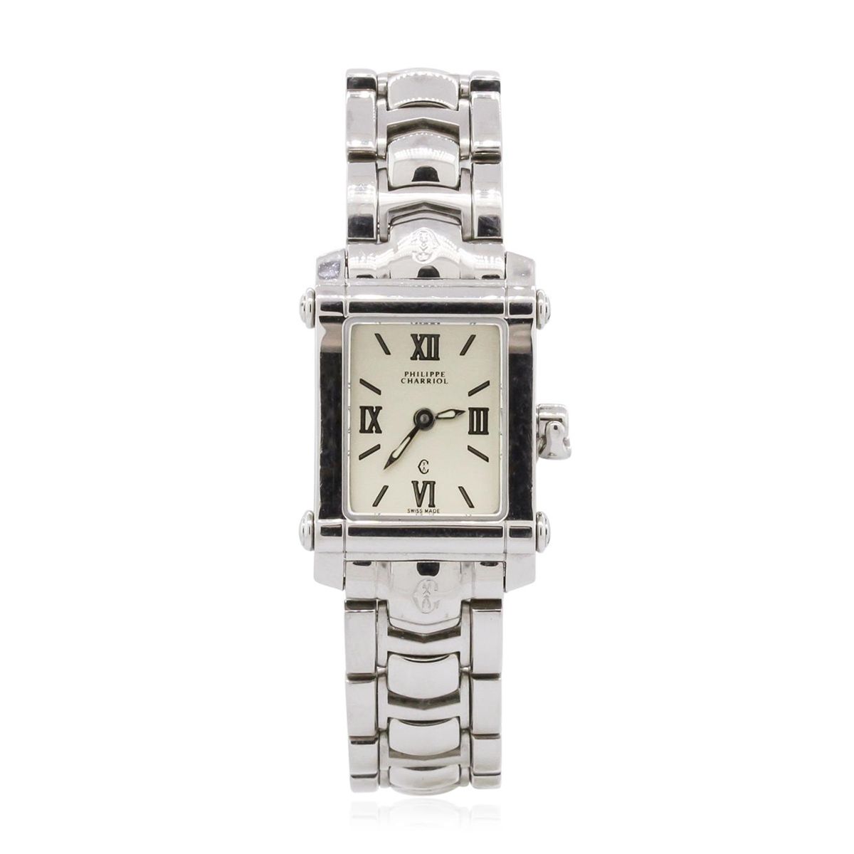 One ladies Phillipe Charriol Columbus Luxury Dress Style Wristwatch featuring: Stainless Steel Bracelet, Lugs, Crystal, Bezel, and 18mm wide Case, White Dial with Analog Display, XII, III, VI, and IX numerals, line hour markers, luminescent hour and minute hands, Swiss Quartz Battery Movement, Deployment Clasp.