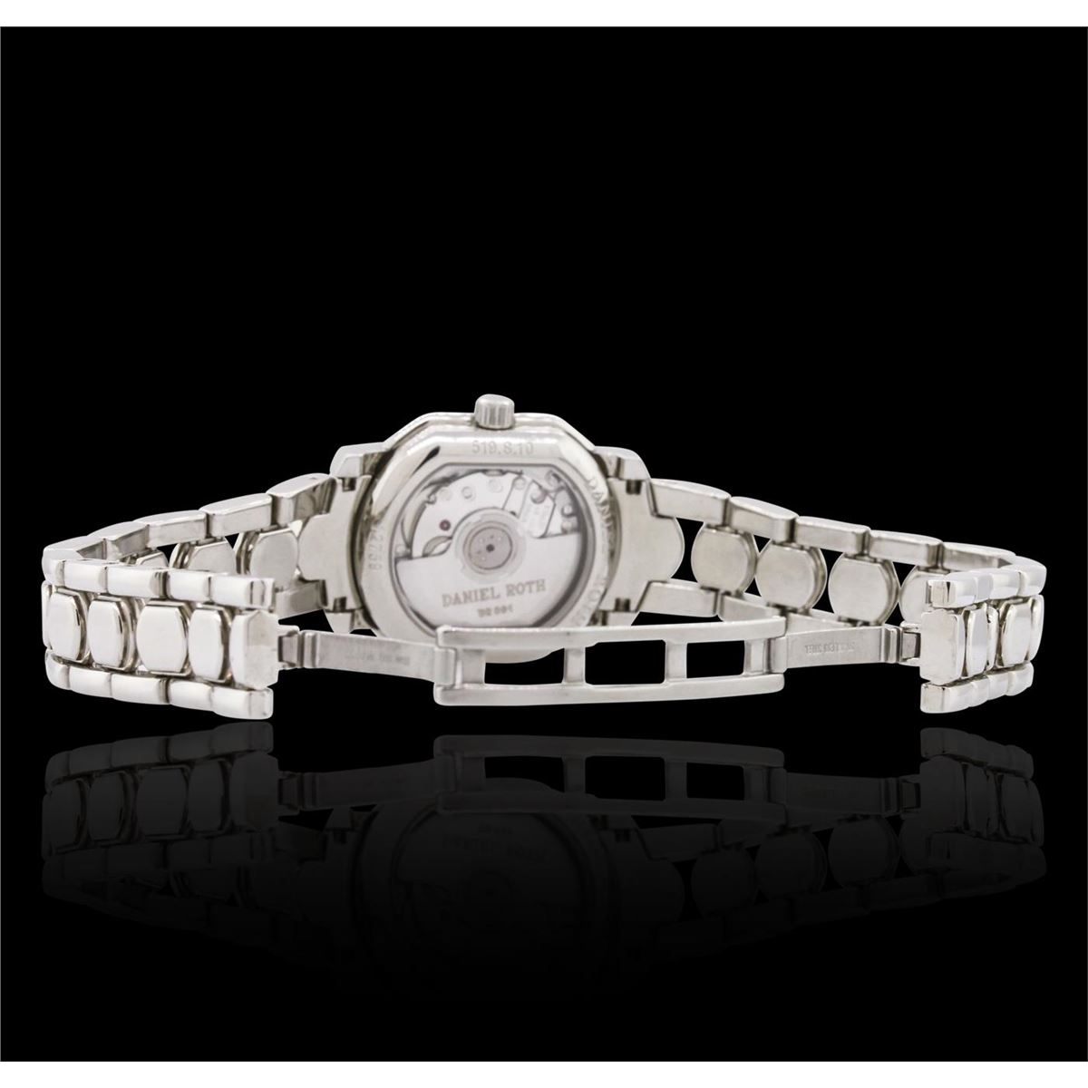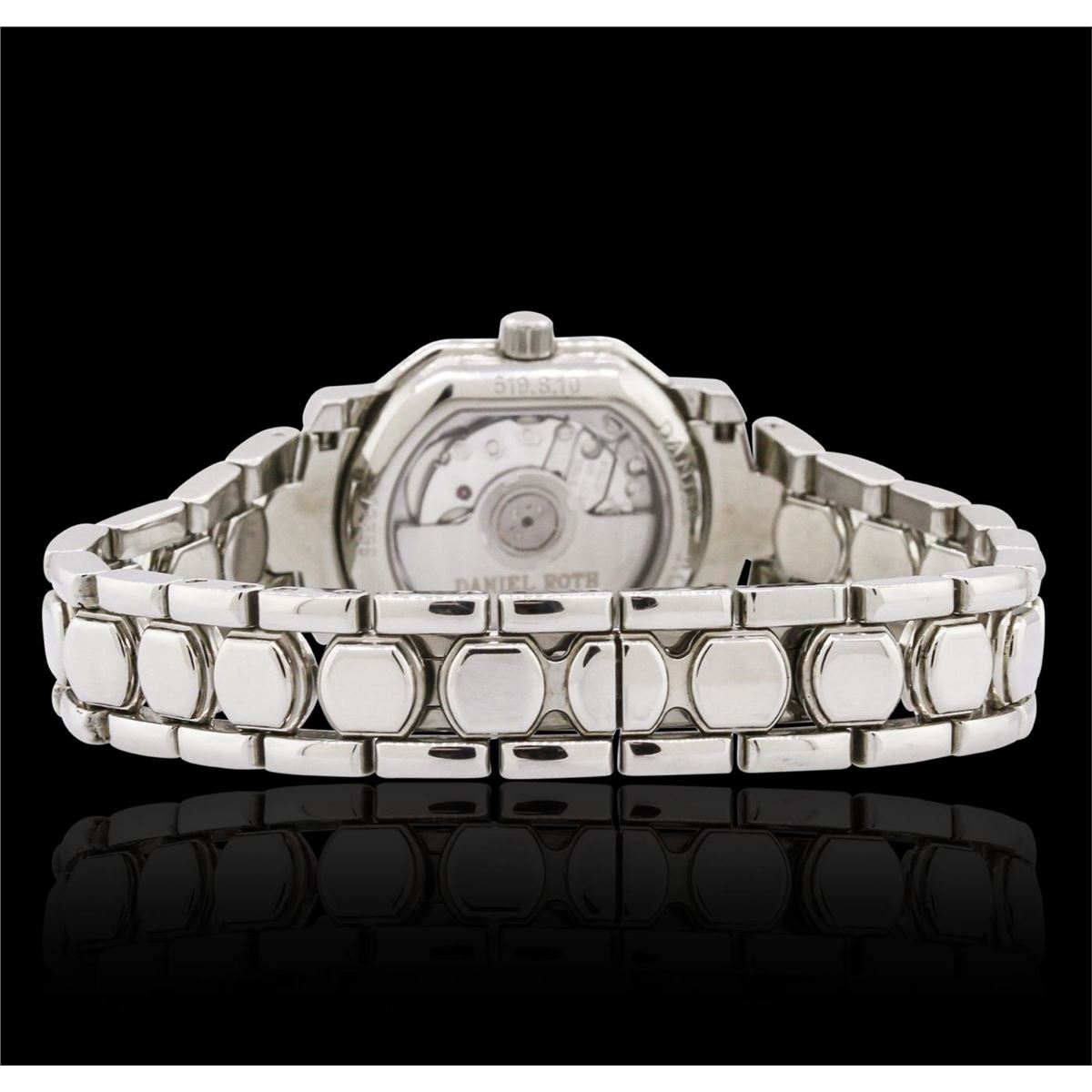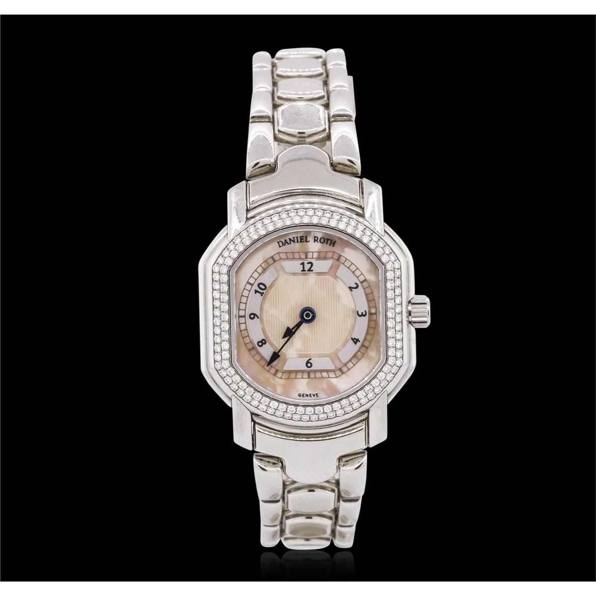 One ladies Daniel Roth Luxury Dress Style Wristwatch featuring: Factory Diamond Bezel, Stainless Steel Case, Screw Down Crown, and Lugs, Salmon Guilloche Mother of Pearl Dial with Analog Display, Arabic Numerals, Hour and Minute Hands, Water Resistant to 20m, Mechanical Hand-winding Movement, Steel Bracelet Strap, Sapphire Crystal, 24x21mm, Deployment Clasp.