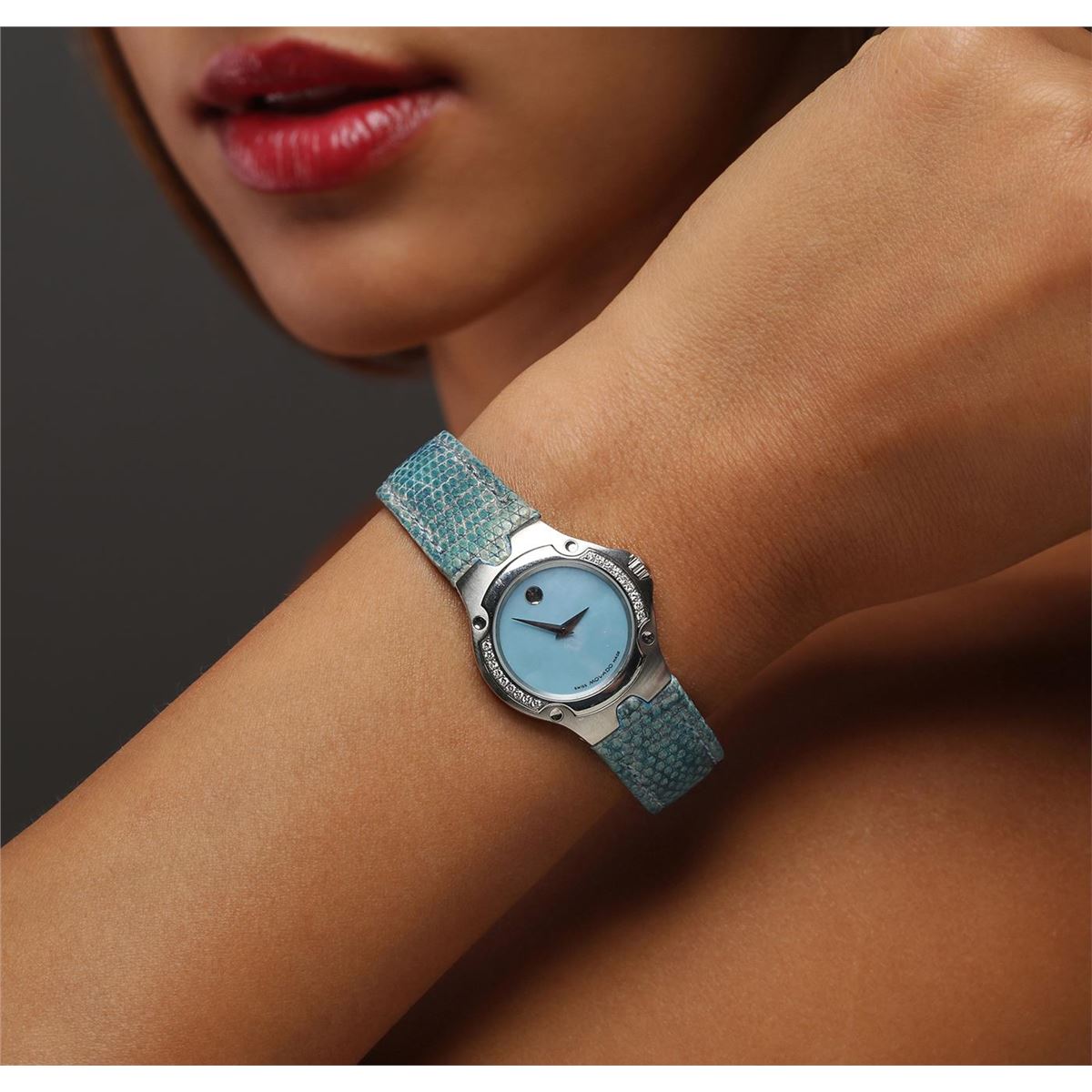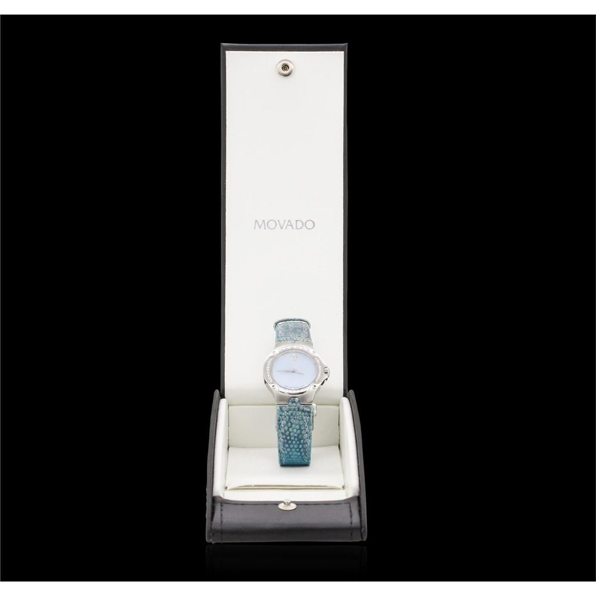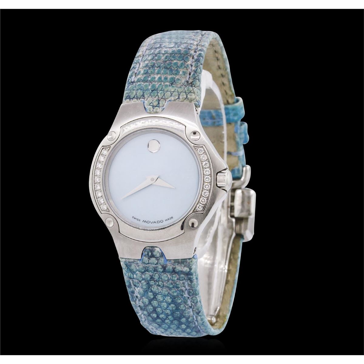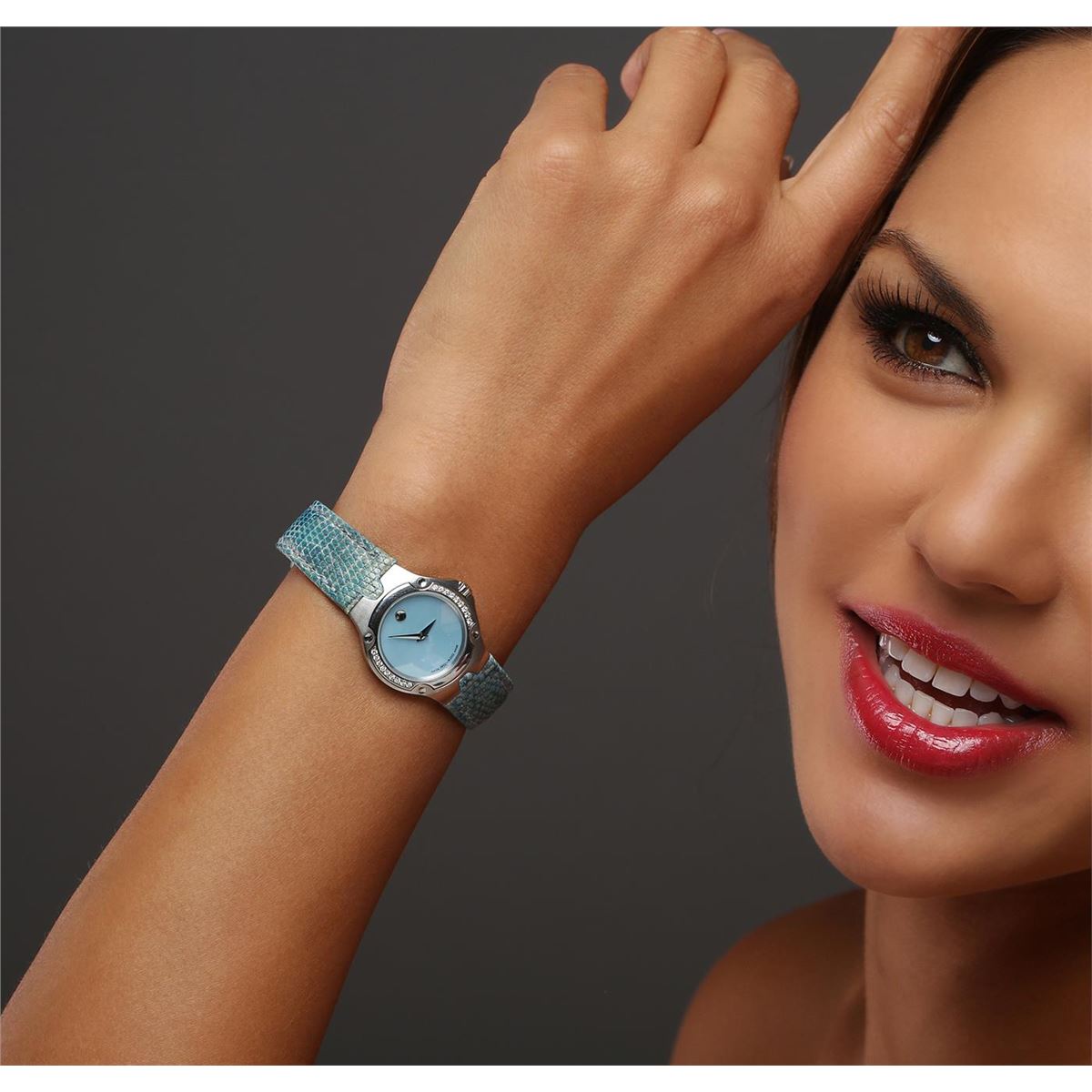 One ladies Movado Sport SE Luxury Dress Wristwatch featuring: Blue/Green Leather Bracelet, Stainless Steel Crown, Lugs, 26mm Case, and Diamond Bezel, White Dial with Analog Display, Movado Dot at 12 o clock position, Silver-Tone hour and minute hands, Swiss Movado Made marking at 6 o'clock position, Swiss Quartz Battery Movement, Highly Scratch Resistant Sapphire Crystal, Push Button Hidden Dual Deployment Clasp.