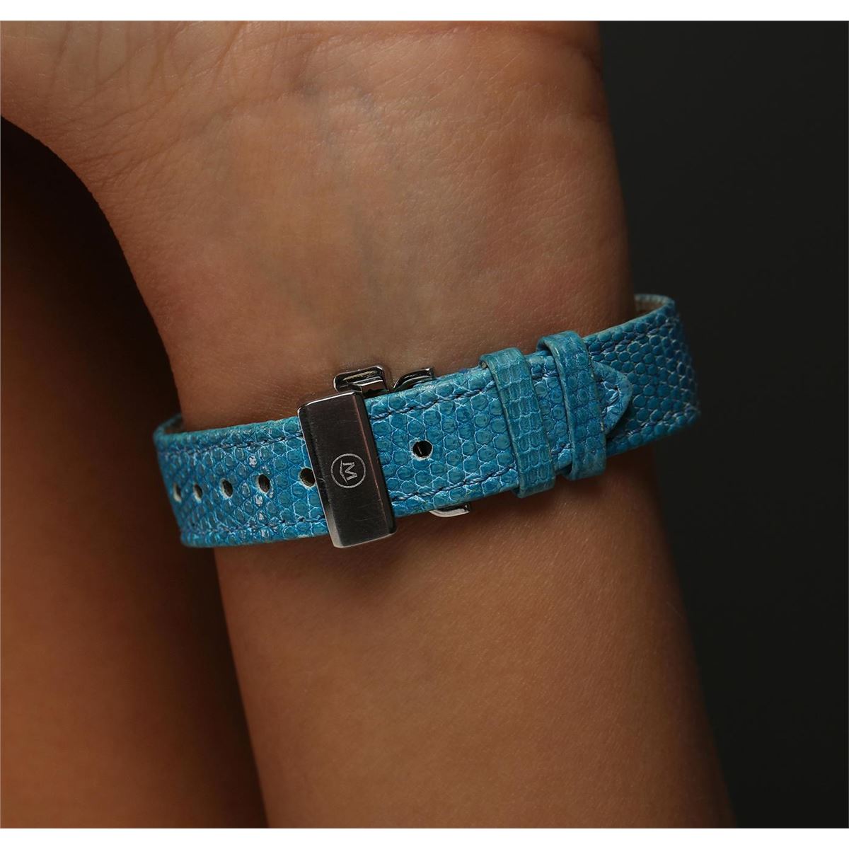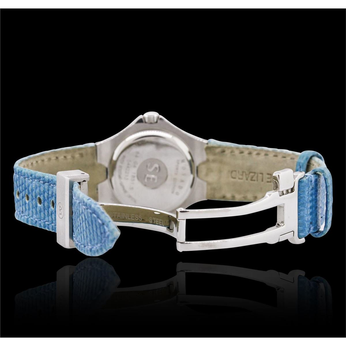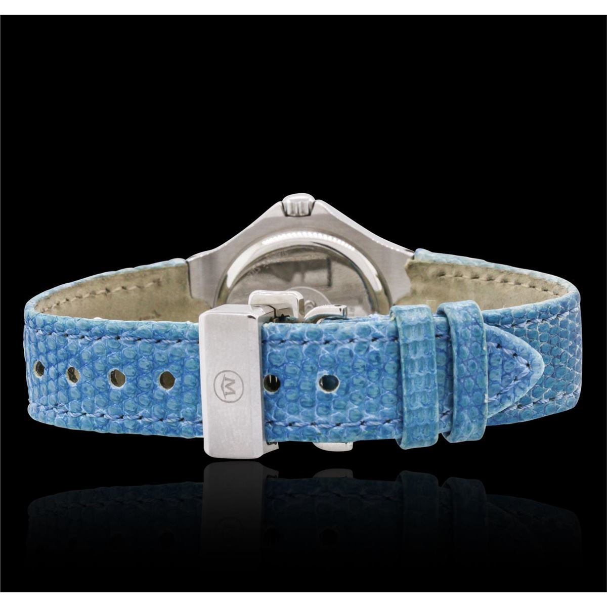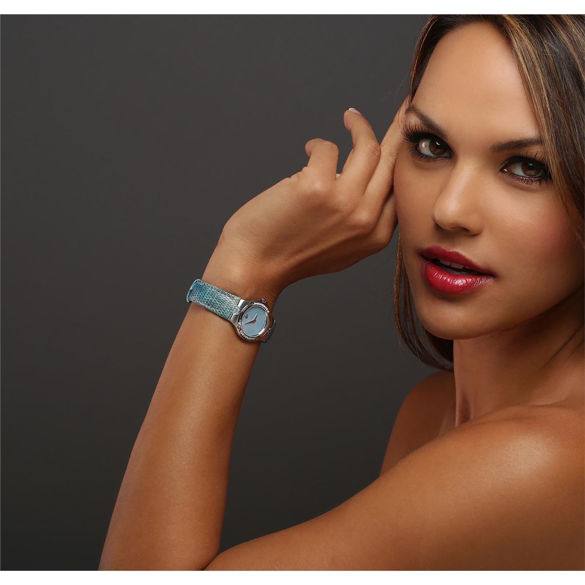 One ladies Movado Sport SE Luxury Dress Wristwatch featuring: Blue/Green Leather Bracelet, Stainless Steel Crown, Lugs, 26mm Case, and Diamond Bezel, White Dial with Analog Display, Movado Dot at 12 o clock position, Silver-Tone hour and minute hands, Swiss Movado Made marking at 6 o'clock position, Swiss Quartz Battery Movement, Highly Scratch Resistant Sapphire Crystal, Push Button Hidden Dual Deployment Clasp.