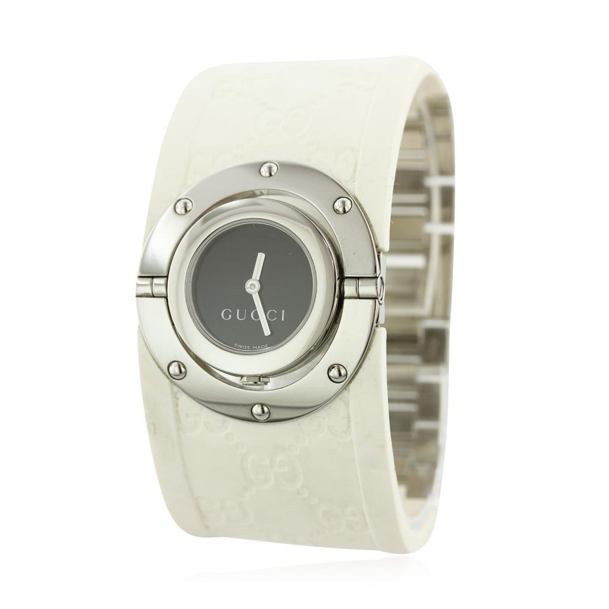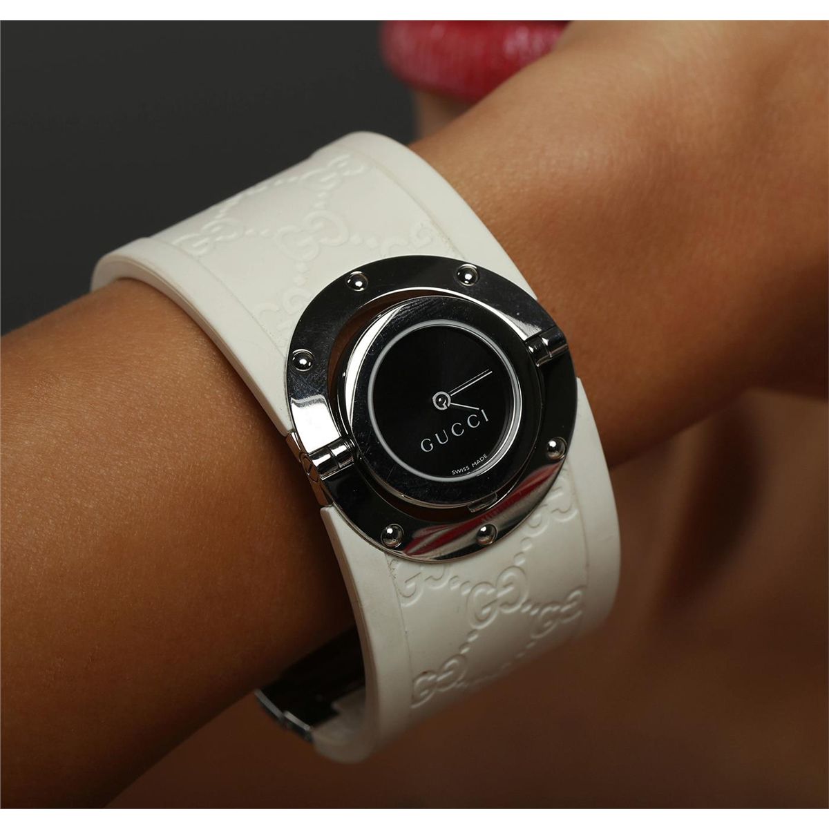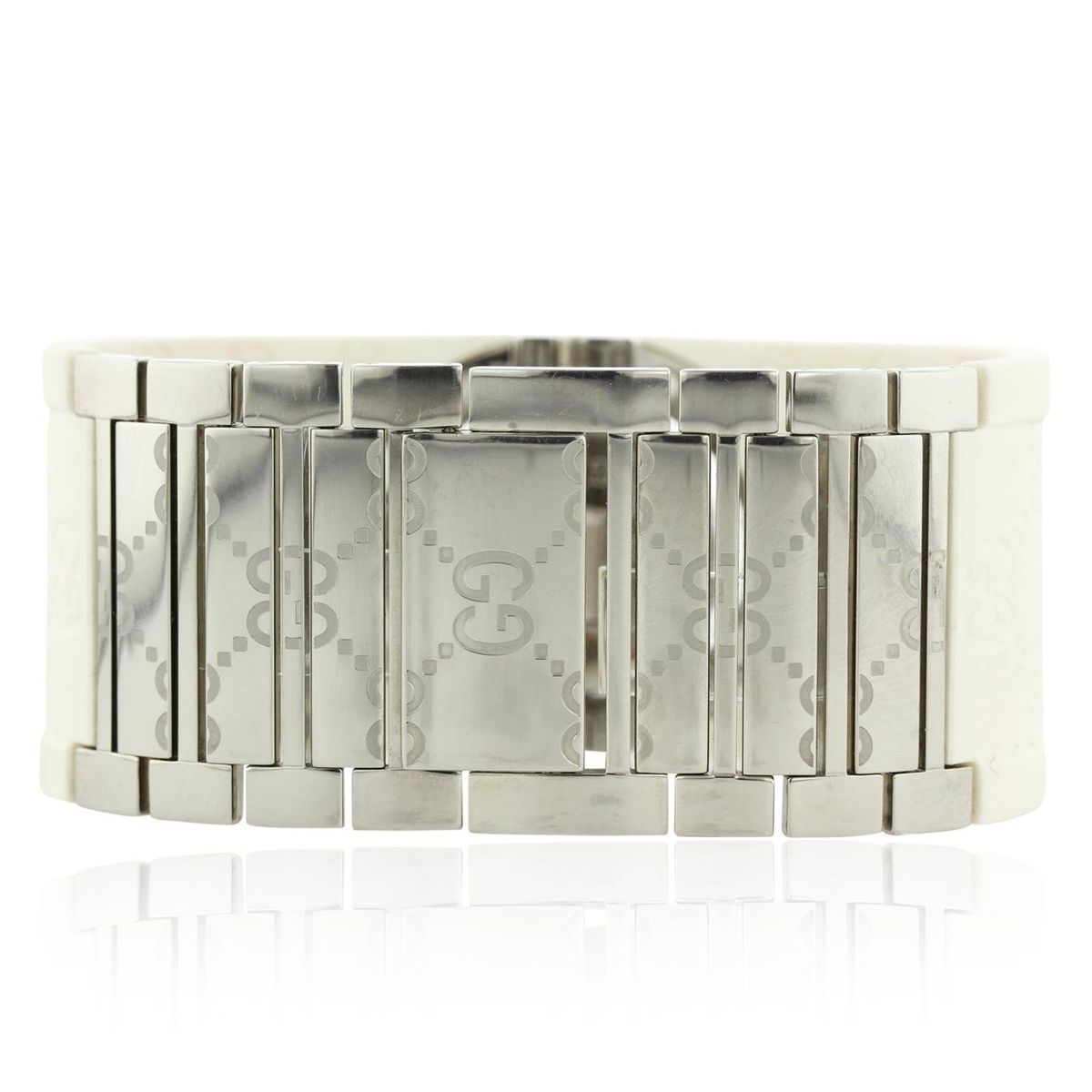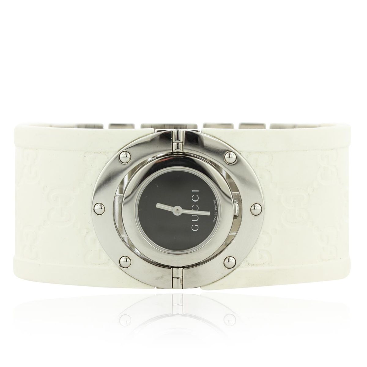 One ladies Gucci 112 Bangle Fashion Style Wristwatch featuring: Model YA112422, White Silicone Strap with GG Pattern, "Twirling" Black Dial with Analog Display, "Gucci" marker at 6 o'clock position and silver tone steel hour and minute hands, Swiss Quartz Movement, Water Resistant to 3 atmospheres/30 meters/100 feet, Stainless Steel Bezel, 23mm (6mm Thick) Case, and Lugs, GG Patterned Stainless Steel Case Back, Anti-Reflective Scratch Resistant Sapphire Crystal, Two-Position Fold-Over Clasp, Stainless Steel Crown under 6 o'clock position.