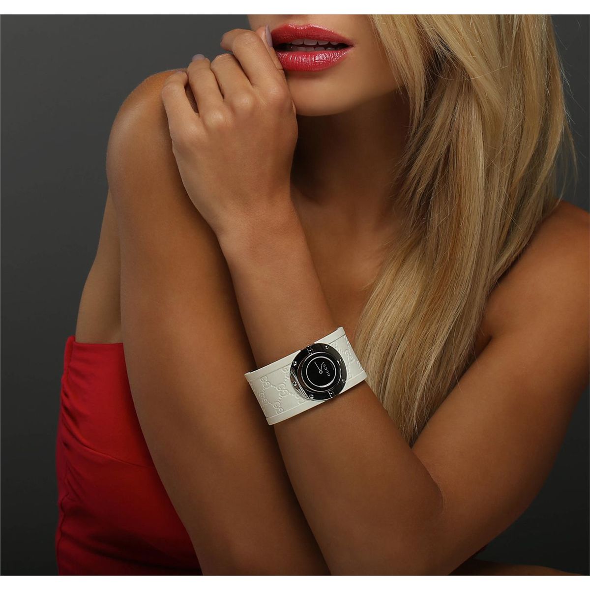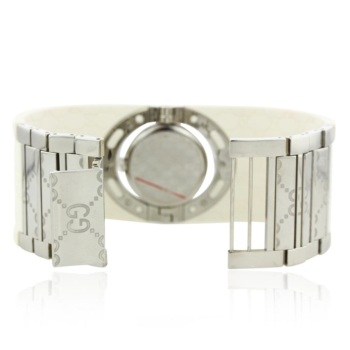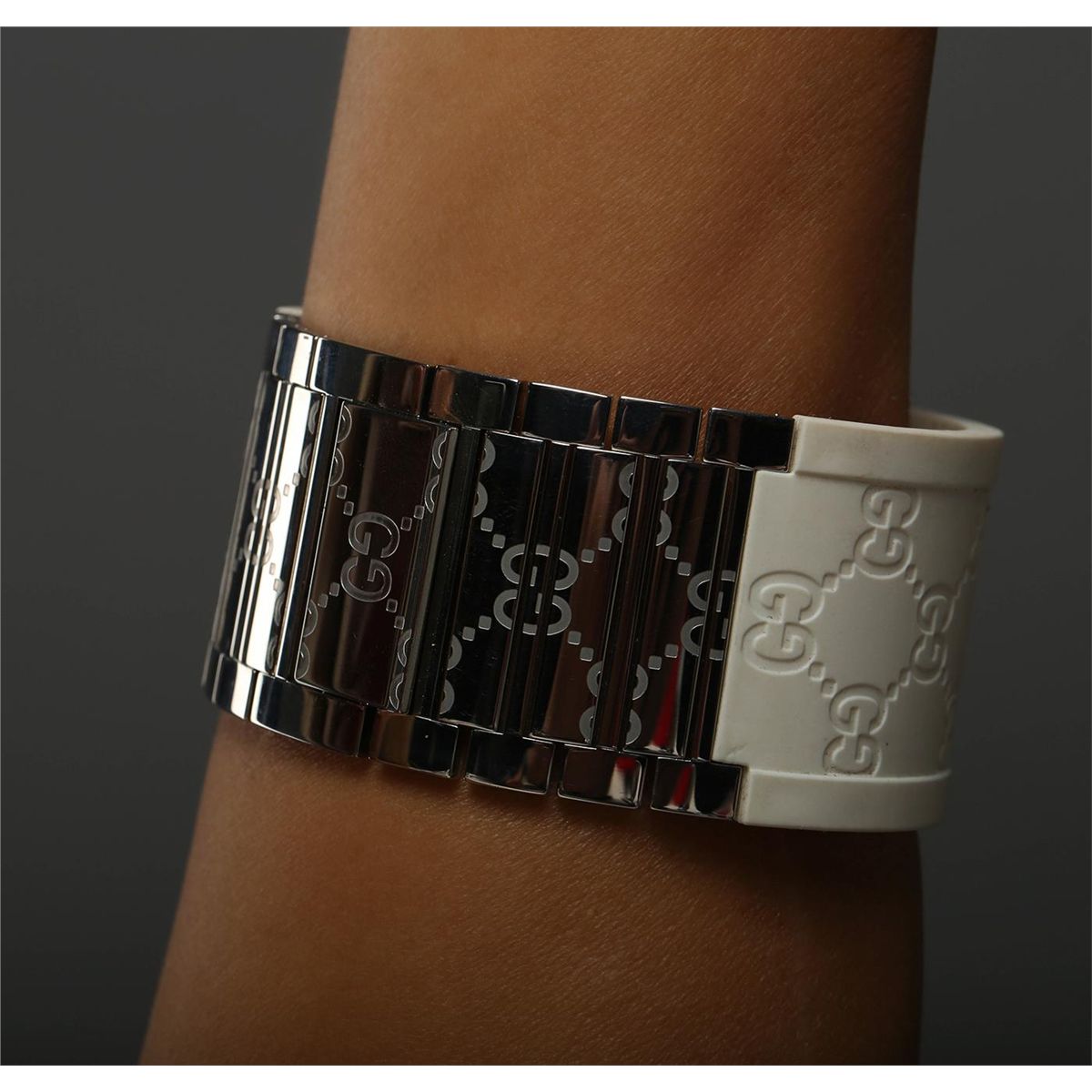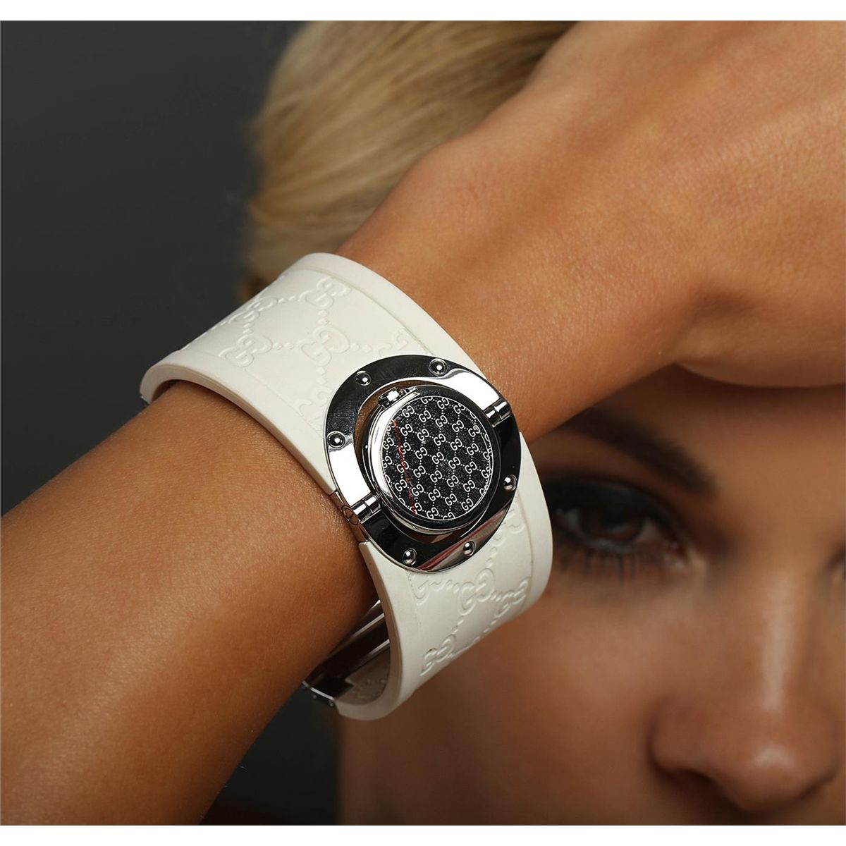 One ladies Gucci 112 Bangle Fashion Style Wristwatch featuring: Model YA112422, White Silicone Strap with GG Pattern, "Twirling" Black Dial with Analog Display, "Gucci" marker at 6 o'clock position and silver tone steel hour and minute hands, Swiss Quartz Movement, Water Resistant to 3 atmospheres/30 meters/100 feet, Stainless Steel Bezel, 23mm (6mm Thick) Case, and Lugs, GG Patterned Stainless Steel Case Back, Anti-Reflective Scratch Resistant Sapphire Crystal, Two-Position Fold-Over Clasp, Stainless Steel Crown under 6 o'clock position.