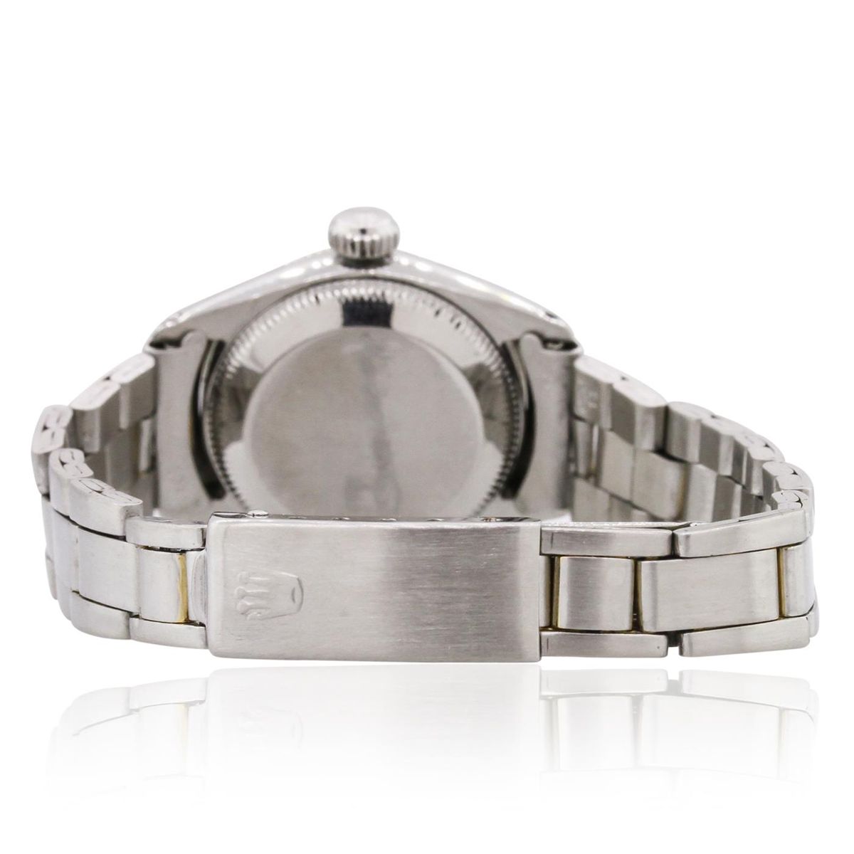 One ladies, vintage LadyDate Rolex Oyster Perpetual model Stainless Steel wristwatch electronically tested, Case: 25mm oyster, Crown: twinlock with logo, Bezel: fluted, Custom Crystal: acrylic cyclops lens. Movement: mechanical stem wind, Dial: Silvered, with pointed hands and indices, Date Window: 3 o'clock position, non-quick set, Circa: 1951, Condition: G-4 Average, Bracelet: brushed finish stainless steel tapering oyster link. Six and three quarter inch length, adjustable. Total Weight of Watch 38.93gm. AIG Appraised at $2,450.00.