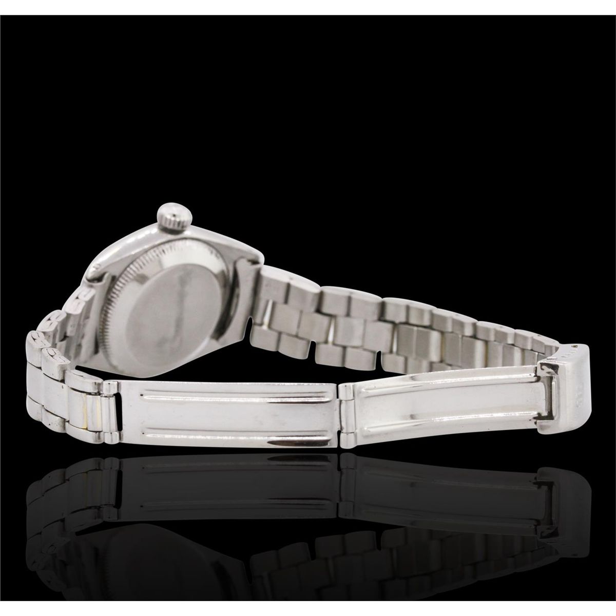 One ladies, vintage LadyDate Rolex Oyster Perpetual model Stainless Steel wristwatch electronically tested, Case: 25mm oyster, Crown: twinlock with logo, Bezel: fluted, Custom Crystal: acrylic cyclops lens. Movement: mechanical stem wind, Dial: Silvered, with pointed hands and indices, Date Window: 3 o'clock position, non-quick set, Circa: 1951, Condition: G-4 Average, Bracelet: brushed finish stainless steel tapering oyster link. Six and three quarter inch length, adjustable. Total Weight of Watch 38.93gm. AIG Appraised at $2,450.00.
