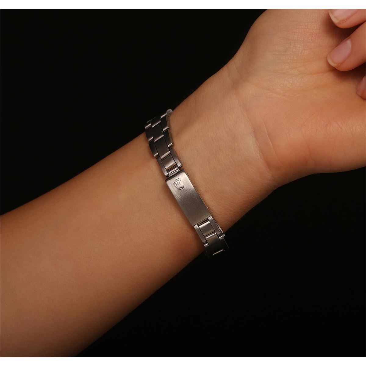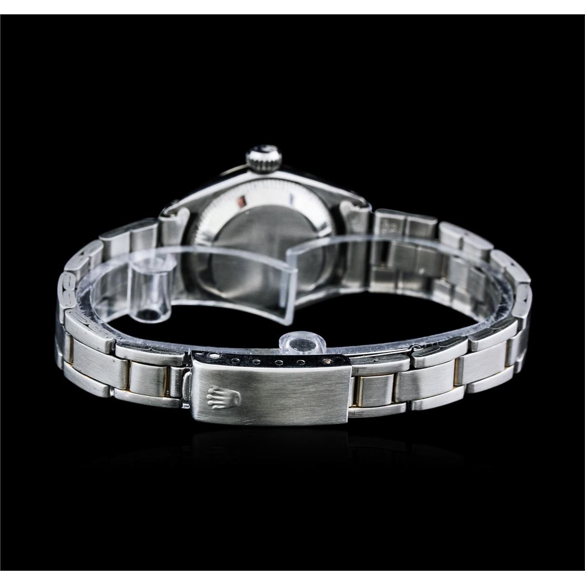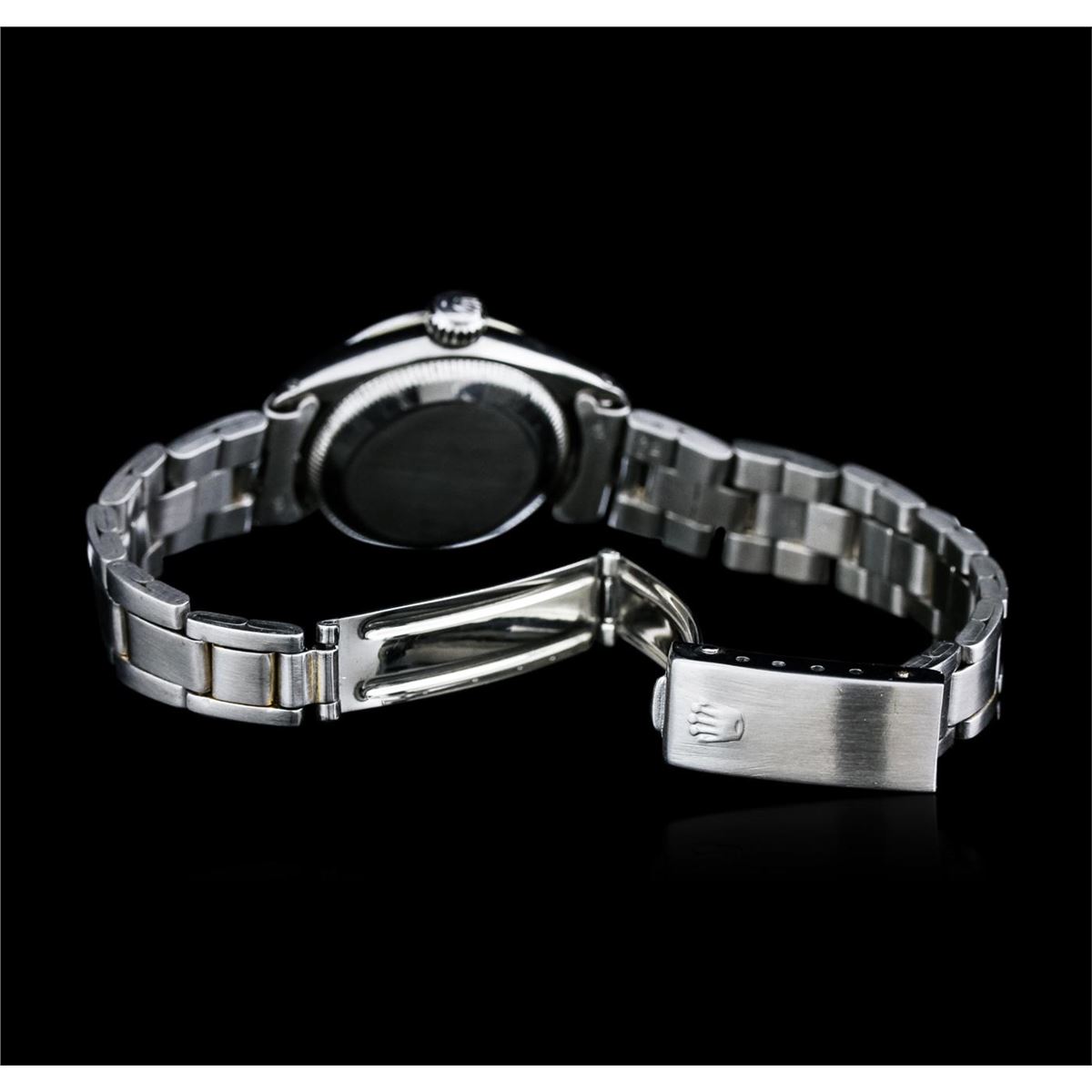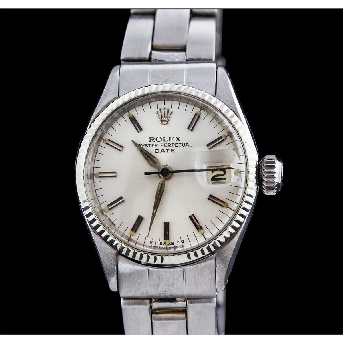 One ladies, vintage LadyDate Rolex Oyster Perpetual model Stainless Steel wristwatch electronically tested, Case: 25mm oyster, Crown: twinlock with logo, Bezel: fluted, Custom Crystal: acrylic cyclops lens. Movement: mechanical stem wind, Dial: Silvered, with pointed hands and indices, Date Window: 3 o'clock position, non-quick set, Circa: 1951, Condition: G-4 Average, Bracelet: brushed finish stainless steel tapering oyster link. Six and three quarter inch length, adjustable. Total Weight of Watch 38.93gm. AIG Appraised at $2,450.00.