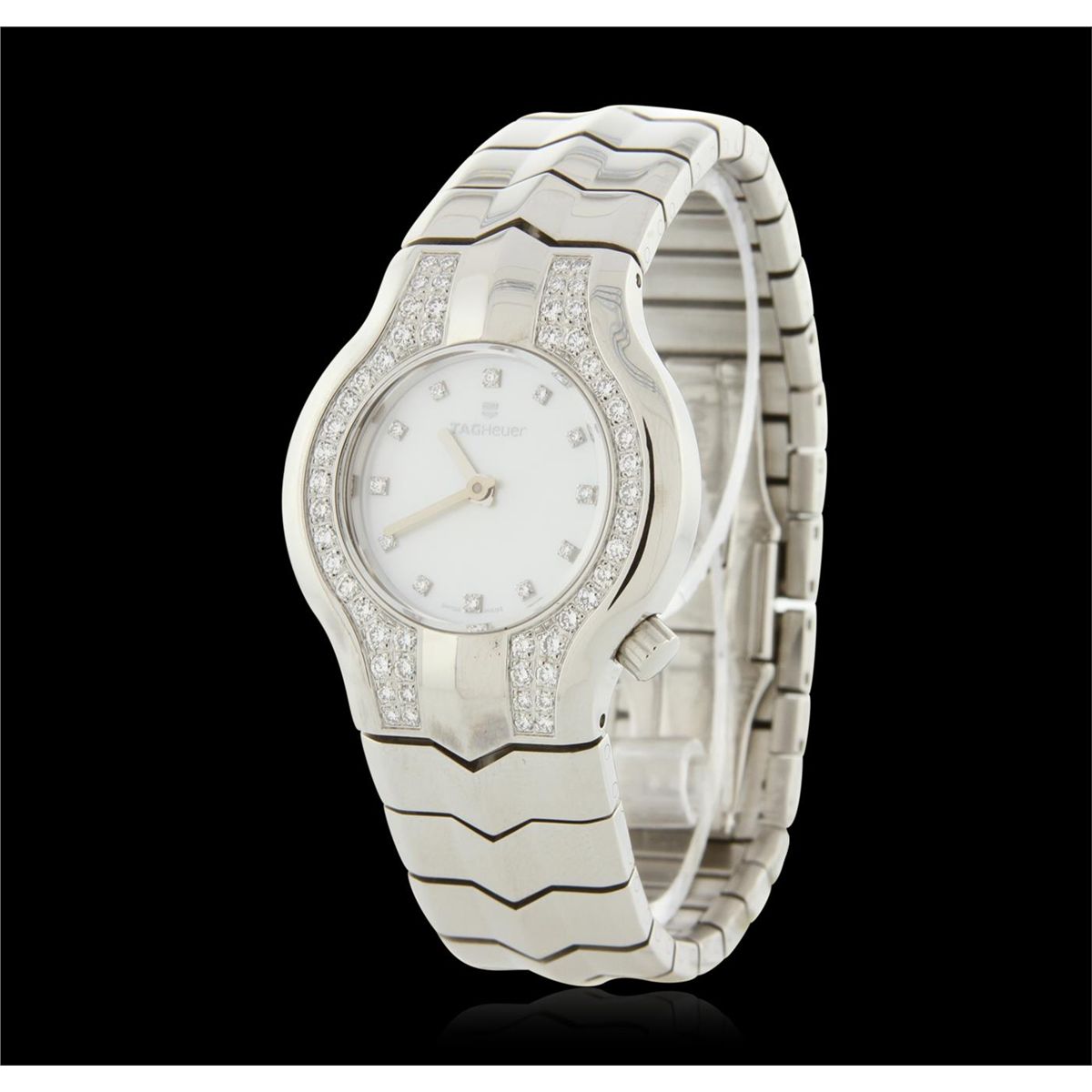 One Ladies Tag Heuer Stainless Steel Diamond Wristwatch featuring: Stainless Steel Case, Crown, Lugs and Bracelet, Diamond Bezel, White Dial with analog display, hour and second hands, diamond hour markers, sapphire crystal. Water resistant up to 100m.
