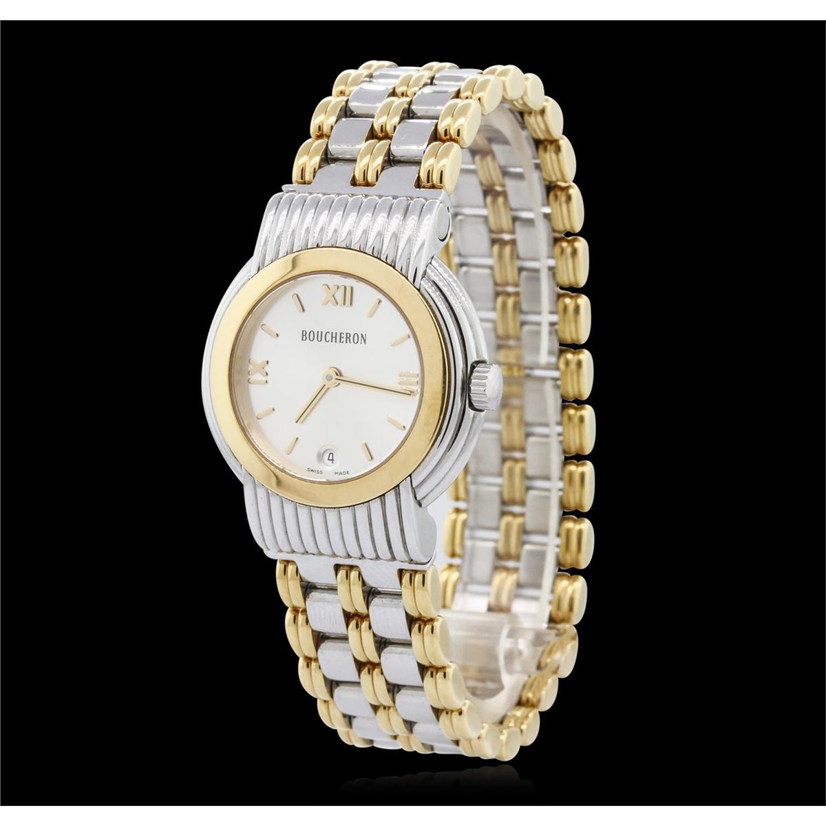 One ladies Boucheron Solis Wristwatch featuring: Two-Tone Gold Champagne Dial and Case, 30.5mm without the crown, Quartz Battery Movement, Date at 6 o'clock position, stainless steel buckle.