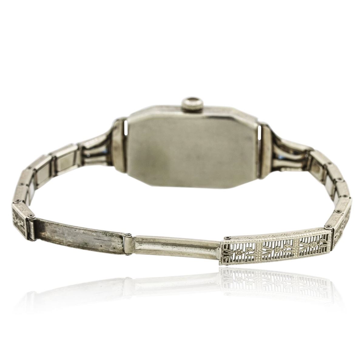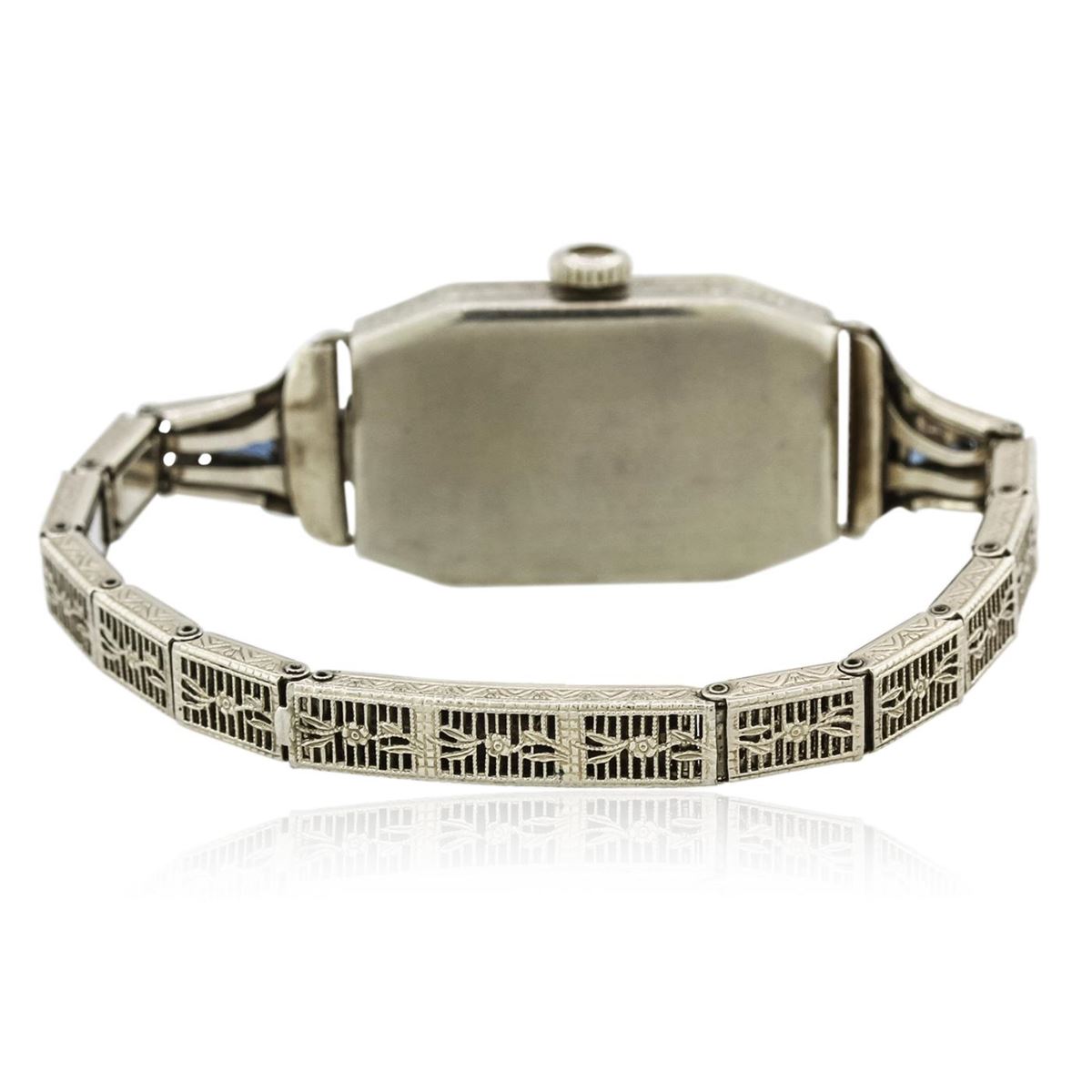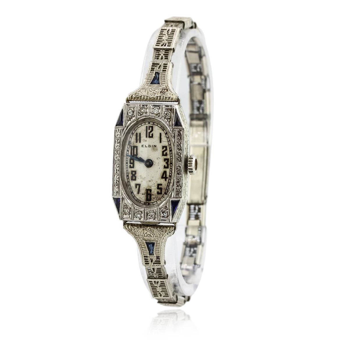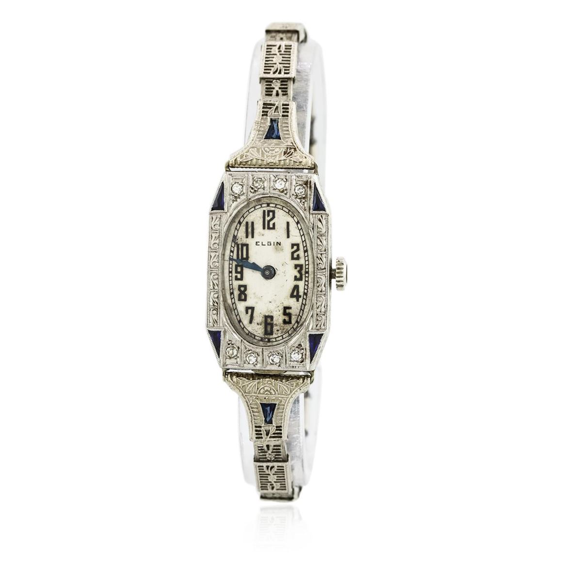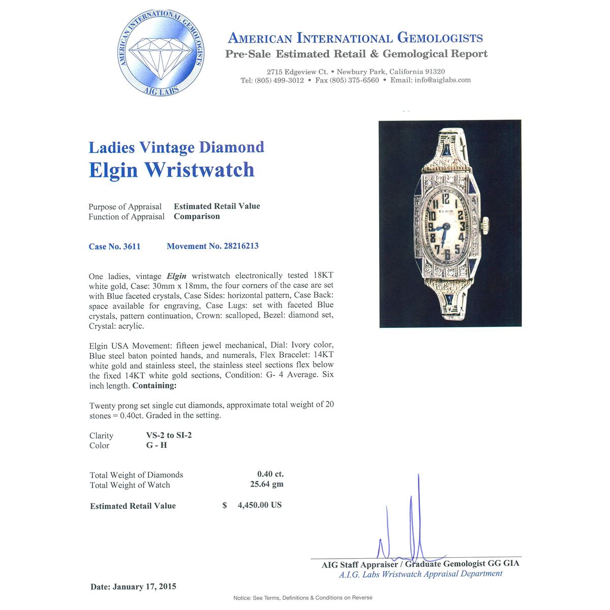 One ladies, vintage Elgin wristwatch electronically tested 18KT white gold, Case: 30mm x 18mm, the four corners of the case are set with Blue faceted crystals, Case Sides: horizontal pattern, Case Back: space available for engraving, Case Lugs: set with faceted Blue crystals, pattern continuation, Crown: scalloped, Bezel: diamond set, Crystal: acrylic. Elgin USA Movement: fifteen jewel mechanical, Dial: Ivory color, Blue steel baton pointed hands, and numerals, Flex Bracelet: 14KT white gold and stainless steel, the stainless steel sections flex below the fixed 14KT white gold sections, Condition: G- 4 Average. Six inch length. Containing: Twenty prong set single cut diamonds, approximate. Total Weight of 20 stones = 0.40ct. Graded in the setting. Clarity: VS-2 to SI-2. Color: G - H. Total Weight of Diamonds 0.40ct. Total Weight of Watch 25.64 grams. AIG Appraised at $4,450.00.