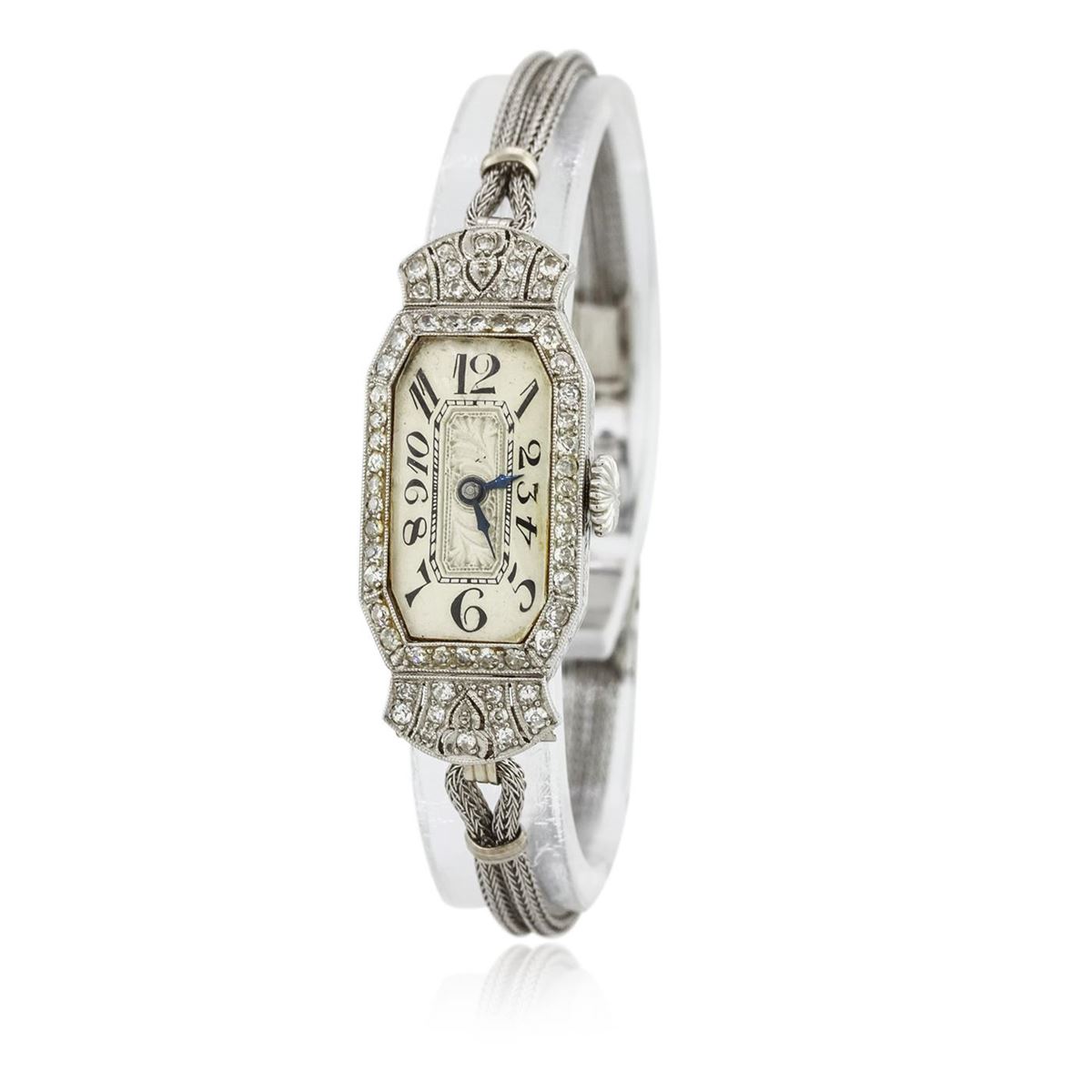 One ladies, cast & assembled Vintage Glycine wristwatch electronically tested, Platinum Case: 24mm x 14mm, Case Back: space available for engraving, Case Lugs: diamond set, Bezel: diamond set, Crystal: acrylic. Glycine Movement: seventeen jewel three adjustment mechanical, Dial: Ivory color, with Blue Steel pointed hands, and numerals, Condition: G-4 average. Bracelet: 14KT white gold double mesh cord strap, six inch length, with a fold over stainless steel snap locking clasp. Containing: Fifty Eight single cut diamonds, approximate. Total Weight of 58 stones = 0.55ct. Graded in the setting. Clarity: SI-1 to I-1. Color: G - I. Total Weight of Diamonds 0.55ct. Total Weight of Watch 16.24 grams. AIG Appraised at $5,880.00.