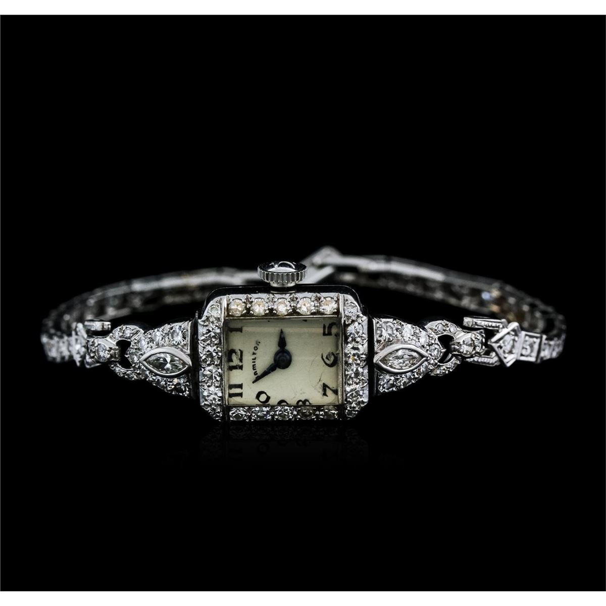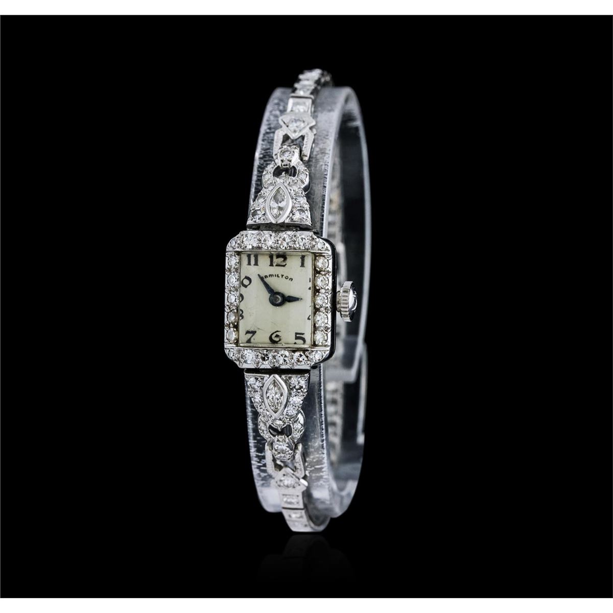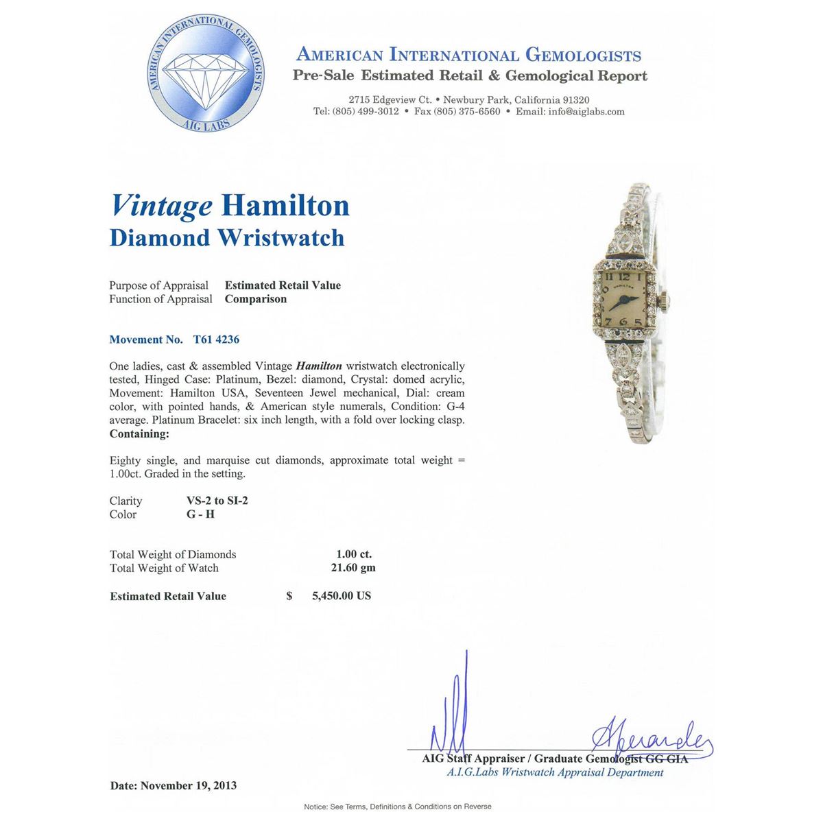 One ladies, cast & assembled Vintage Hamilton wristwatch electronically tested, Hinged Case: Platinum, Bezel: diamond, Crystal: domed acrylic, Movement: Hamilton USA, Seventeen Jewel mechanical, Dial: cream. Color, with pointed hands, & American style numerals, Condition: G-4 average. Platinum Bracelet: six inch length, with a fold over locking clasp. Containing: Eighty single, and marquise cut diamonds, approximate total weight = 1.00ct. Graded in the setting. Clarity VS-2 to SI-2. Color G - H. Total Weight of Diamonds 1.00ct. Total Weight of Watch 21.60gm. AIG Appraised at $5,450.00.