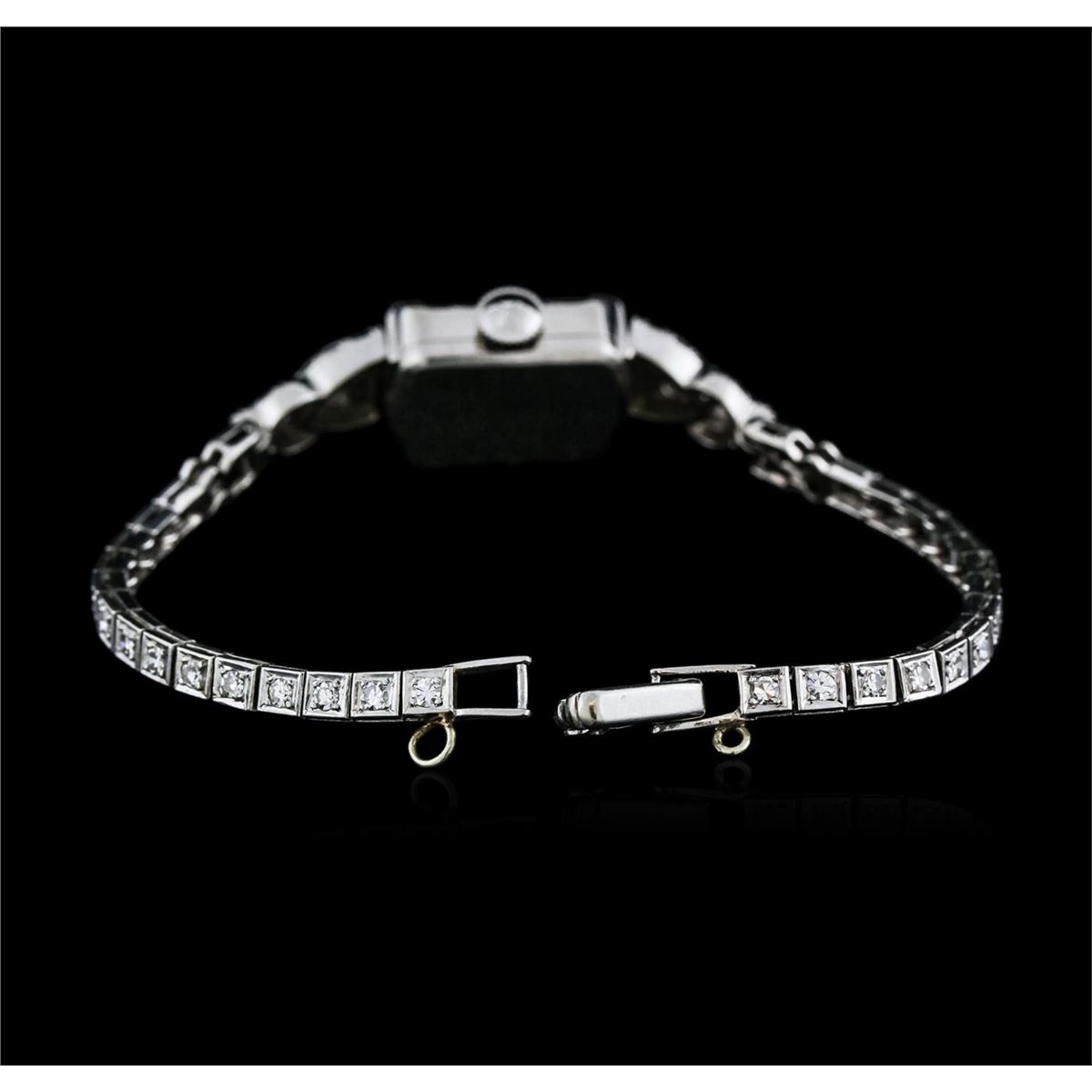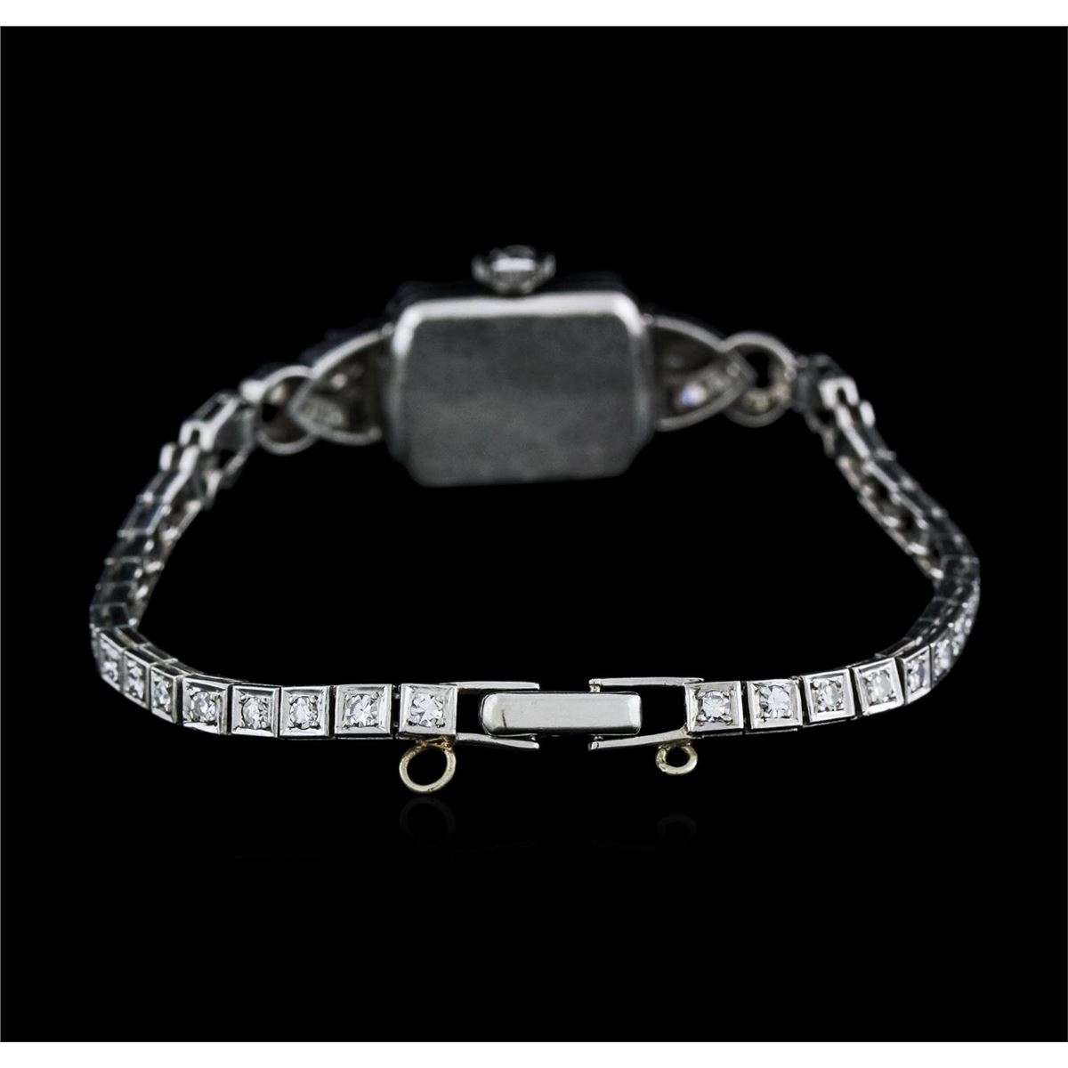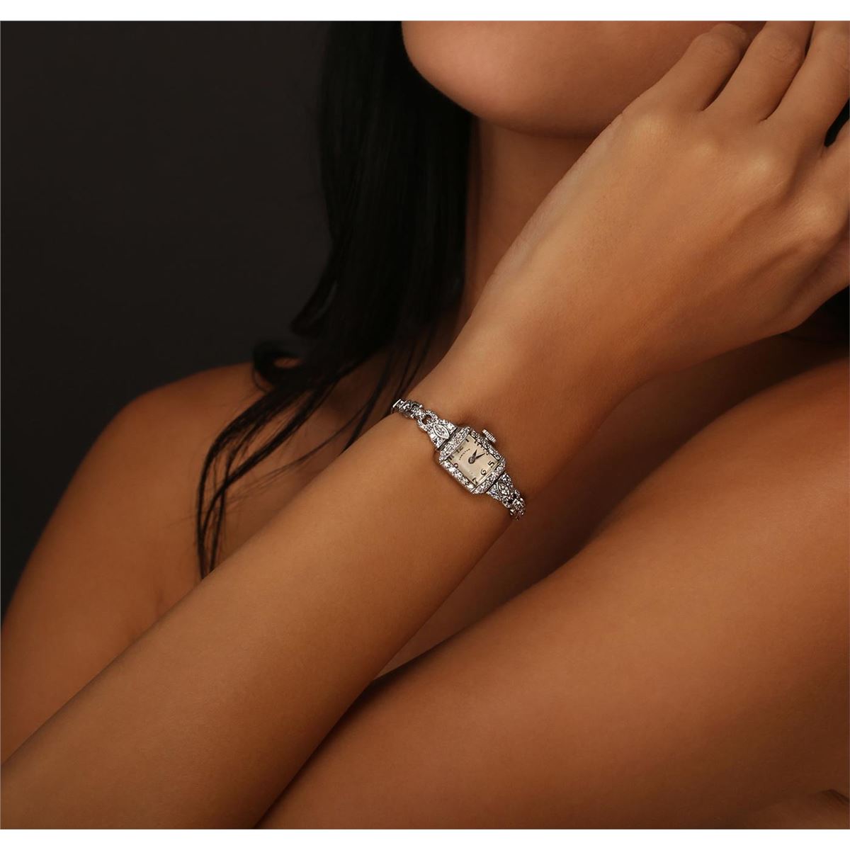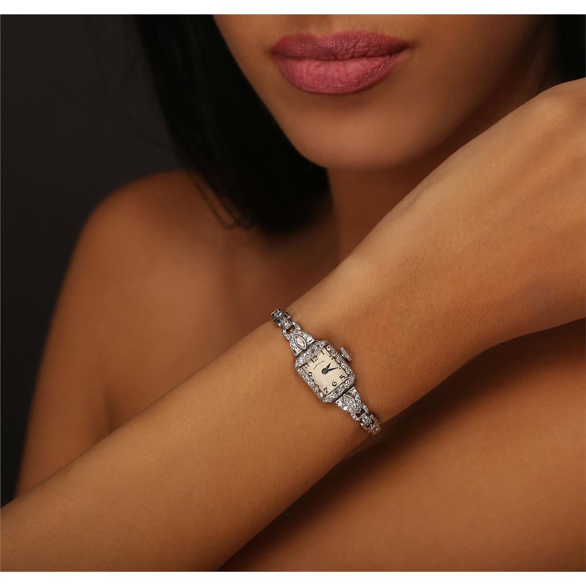 One ladies, cast & assembled Vintage Hamilton wristwatch electronically tested, Hinged Case: Platinum, Bezel: diamond, Crystal: domed acrylic, Movement: Hamilton USA, Seventeen Jewel mechanical, Dial: cream. Color, with pointed hands, & American style numerals, Condition: G-4 average. Platinum Bracelet: six inch length, with a fold over locking clasp. Containing: Eighty single, and marquise cut diamonds, approximate total weight = 1.00ct. Graded in the setting. Clarity VS-2 to SI-2. Color G - H. Total Weight of Diamonds 1.00ct. Total Weight of Watch 21.60gm. AIG Appraised at $5,450.00.