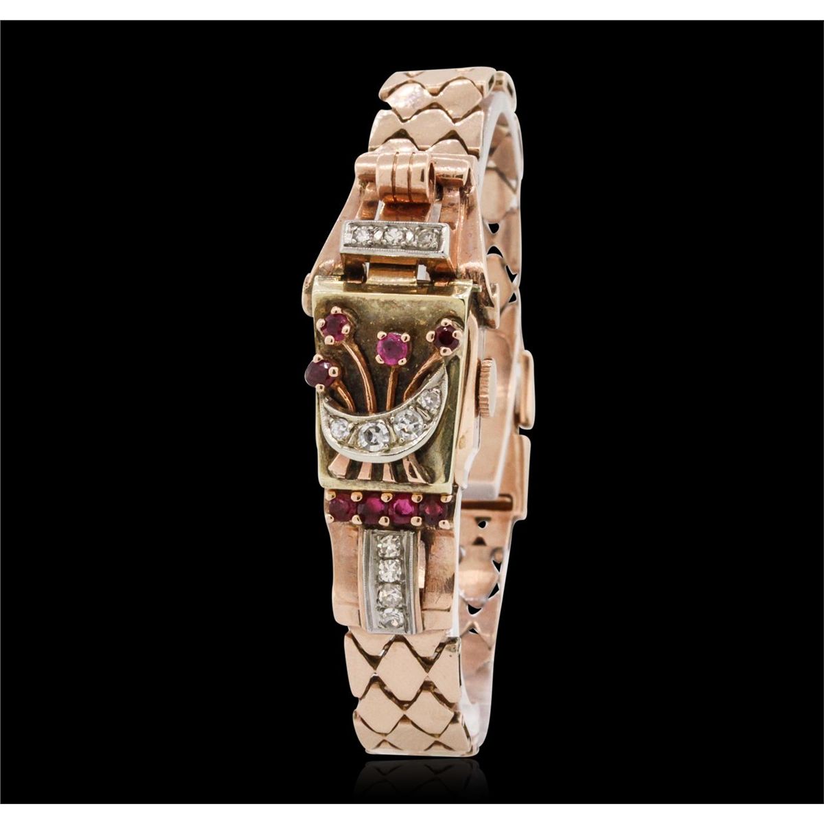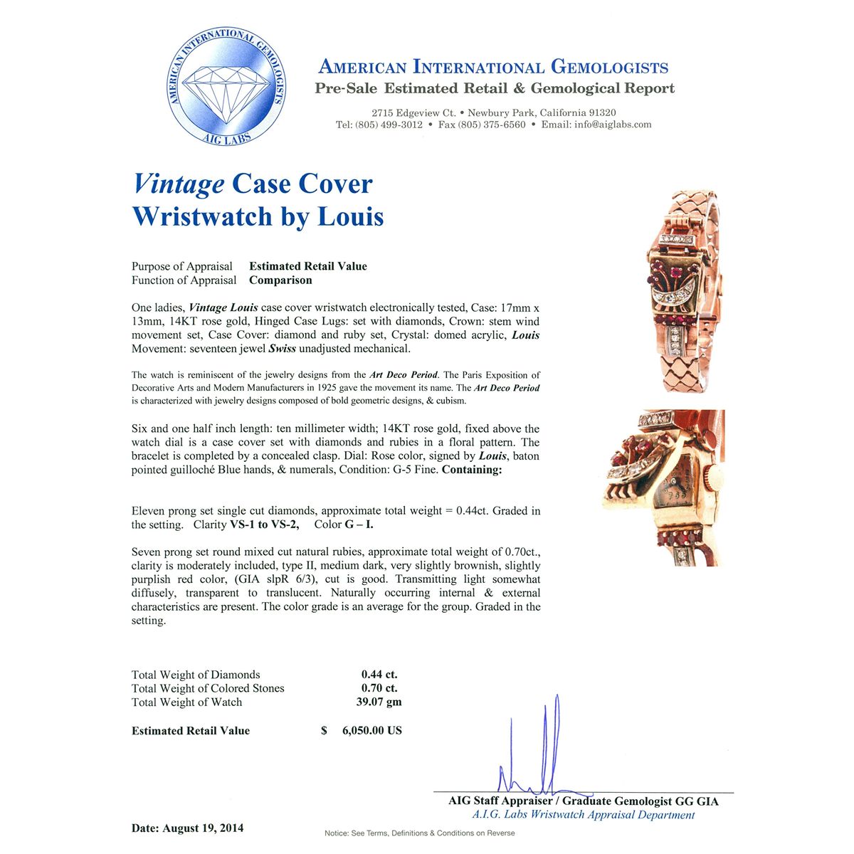 One ladies, Vintage Louis case cover wristwatch electronically tested, Case: 17mm x 13mm, 14KT rose gold, Hinged Case Lugs: set with diamonds, Crown: stem wind movement set, Case Cover: diamond and ruby set, Crystal: domed acrylic, Louis Movement: seventeen jewel Swiss unadjusted mechanical. The watch is reminiscent of the jewelry designs from the Art Deco Period. The Paris Exposition of Decorative Arts and Modern Manufacturers in 1925 gave the movement its name. The Art Deco Period is characterized with jewelry designs composed of bold geometric designs, & cubism. Six and one half inch length: ten millimeter width; 14KT rose gold, fixed above the watch dial is a case cover set with diamonds and rubies in a floral pattern. The bracelet is completed by a concealed clasp. Dial: Rose color, signed by Louis, baton pointed guilloche, Blue hands, & numerals, Condition: G-5 Fine. Containing: Eleven prong set single cut diamonds, approximate total weight = 0.44ct. Graded in the setting. Clarity VS-1 to VS-2, Color G - I. Seven prong set round mixed cut natural rubies, approximate total weight of 0.70ct., clarity is moderately included, type II, medium dark, very slightly brownish, slightly purplish red color, (GIA slpR 6/3), cut is good. Transmitting light somewhat diffusely, transparent to translucent. Naturally occurring internal & external characteristics are present. The color grade is an average for the group. Graded in the setting. Total Weight of Diamonds 0.44ct. Total Weight of Colored Stones 0.70ct. Total Weight of Watch 39.07 grams. AIG Appraised at $6,050.00.