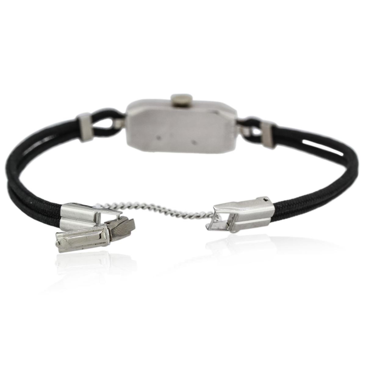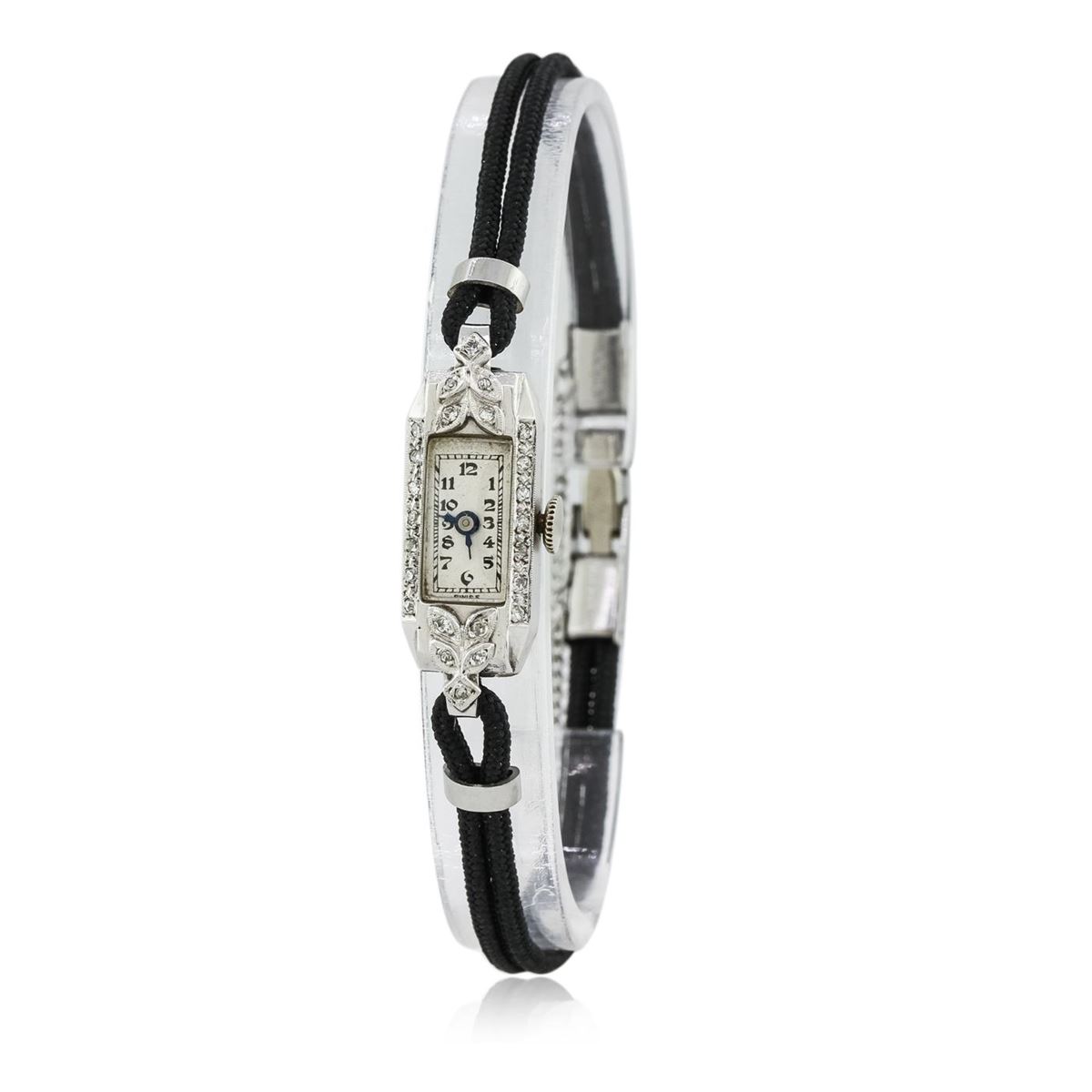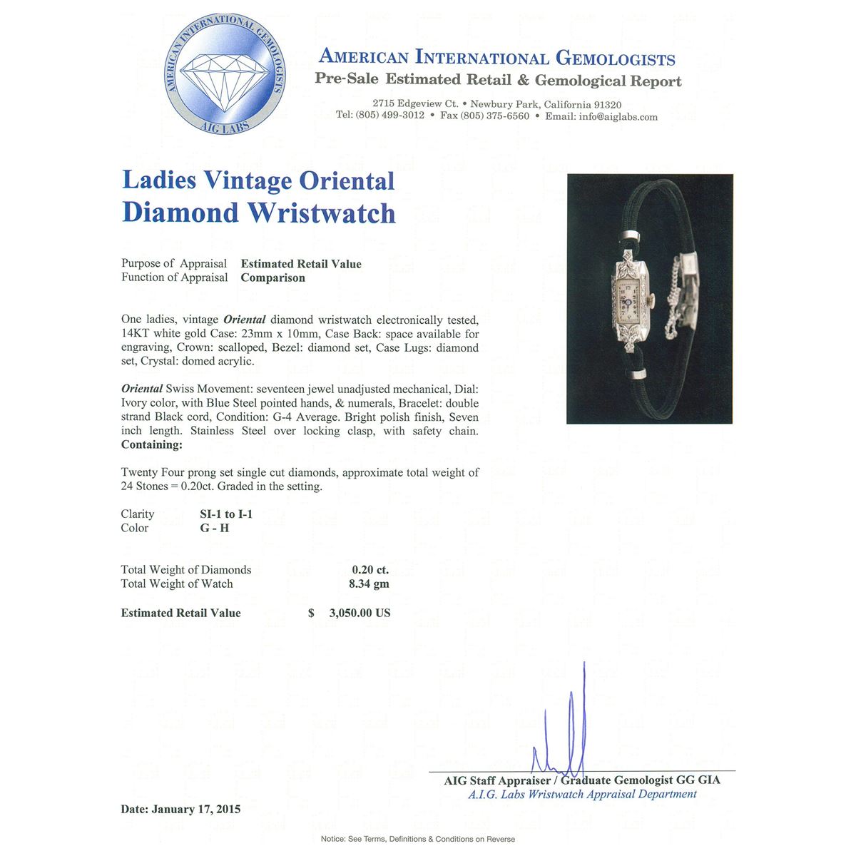 One ladies, vintage Oriental diamond wristwatch electronically tested, 14KT white gold Case: 23mm x 10mm, Case Back: space available for engraving, Crown: scalloped, Bezel: diamond set, Case Lugs: diamond set, Crystal: domed acrylic. Oriental Swiss Movement: seventeen jewel unadjusted mechanical, Dial: Ivory color, with Blue Steel pointed hands, & numerals, Bracelet: double strand Black cord, Condition: G-4 Average. Bright polish finish, Seven inch length. Stainless Steel over locking clasp, with safety chain. Containing: Twenty Four prong set single cut diamonds, approximate. Total Weight of 24 Stones = 0.20ct. Graded in the setting. Clarity: SI-1 to I-1. Color: G - H. Total Weight of Diamonds 0.20ct. Total Weight of Watch 8.34 grams. AIG Appraised at $3,050.00.