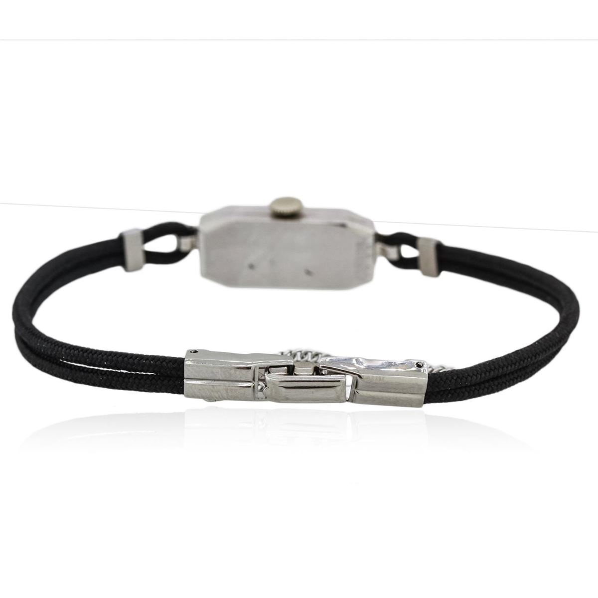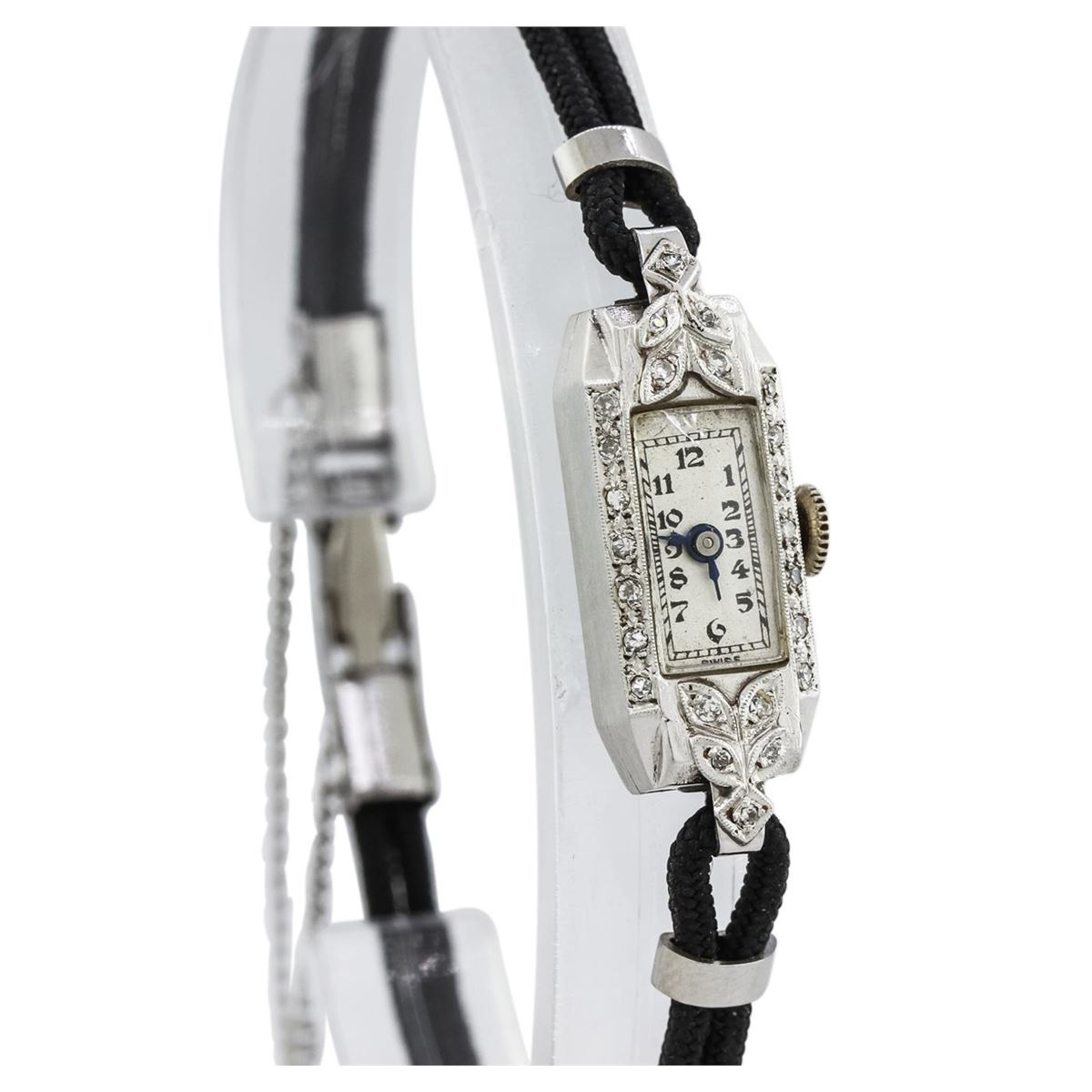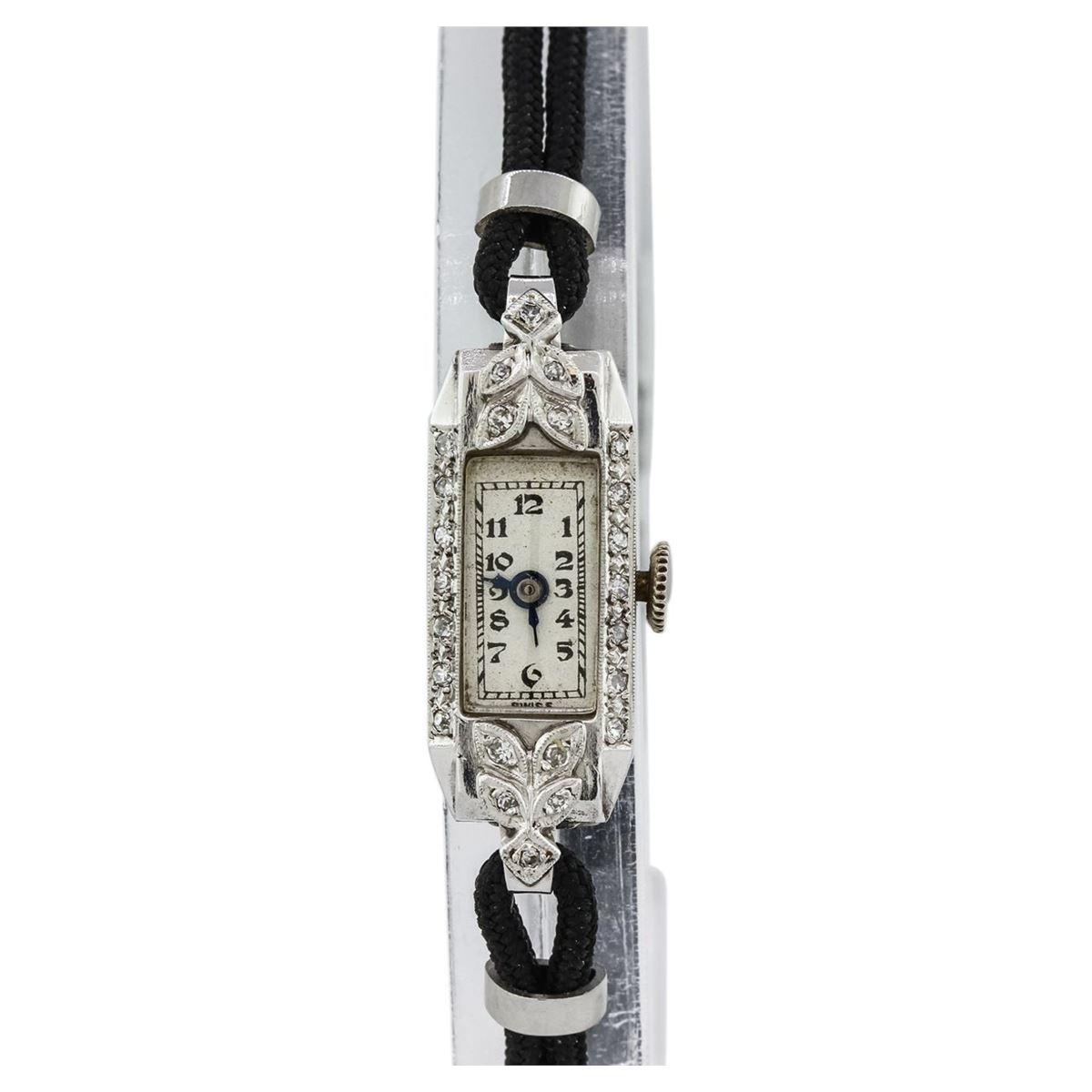 One ladies, vintage Oriental diamond wristwatch electronically tested, 14KT white gold Case: 23mm x 10mm, Case Back: space available for engraving, Crown: scalloped, Bezel: diamond set, Case Lugs: diamond set, Crystal: domed acrylic. Oriental Swiss Movement: seventeen jewel unadjusted mechanical, Dial: Ivory color, with Blue Steel pointed hands, & numerals, Bracelet: double strand Black cord, Condition: G-4 Average. Bright polish finish, Seven inch length. Stainless Steel over locking clasp, with safety chain. Containing: Twenty Four prong set single cut diamonds, approximate. Total Weight of 24 Stones = 0.20ct. Graded in the setting. Clarity: SI-1 to I-1. Color: G - H. Total Weight of Diamonds 0.20ct. Total Weight of Watch 8.34 grams. AIG Appraised at $3,050.00.