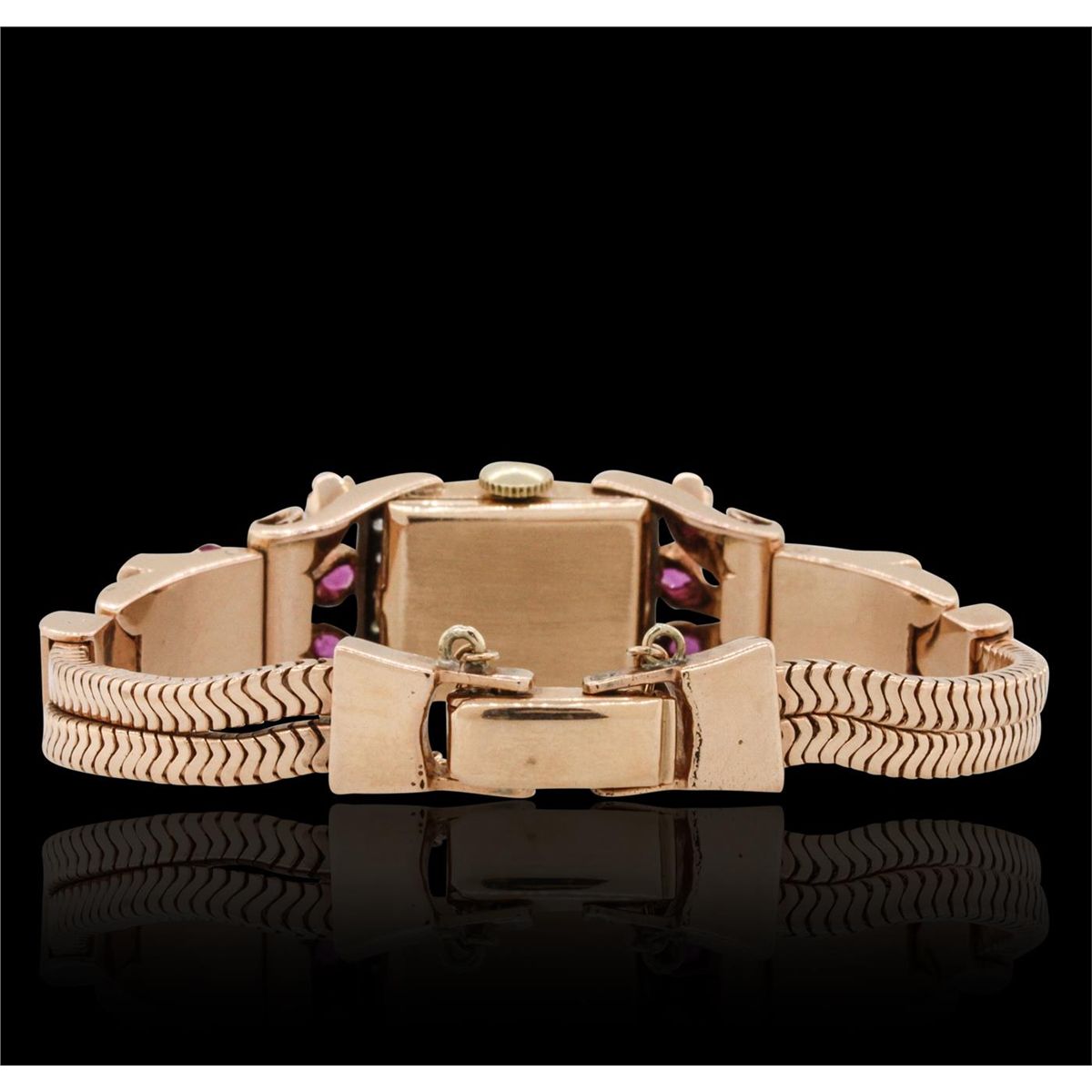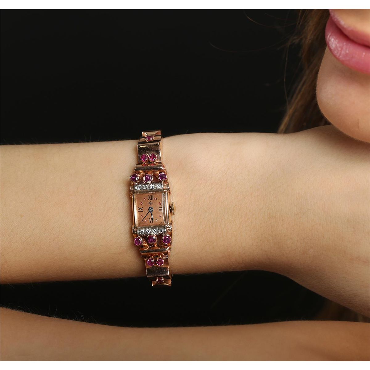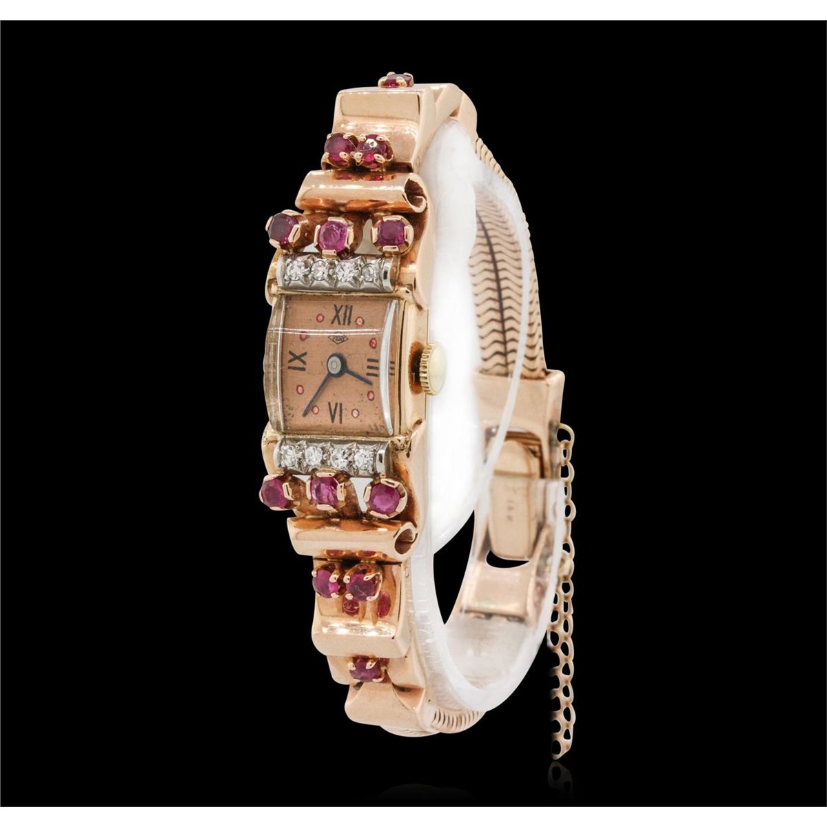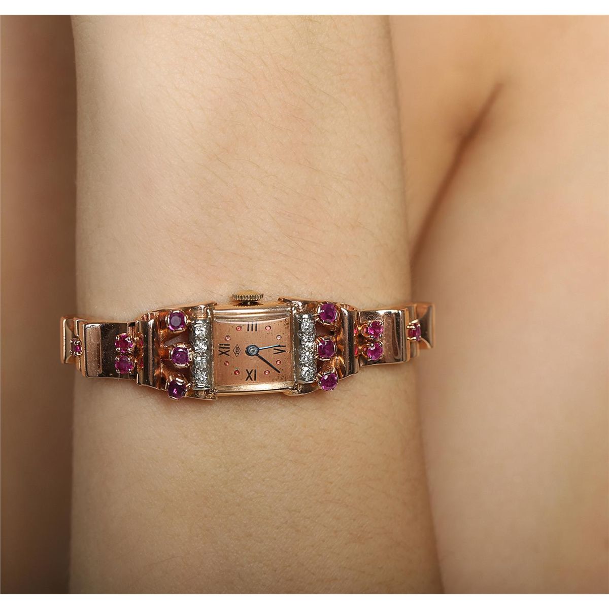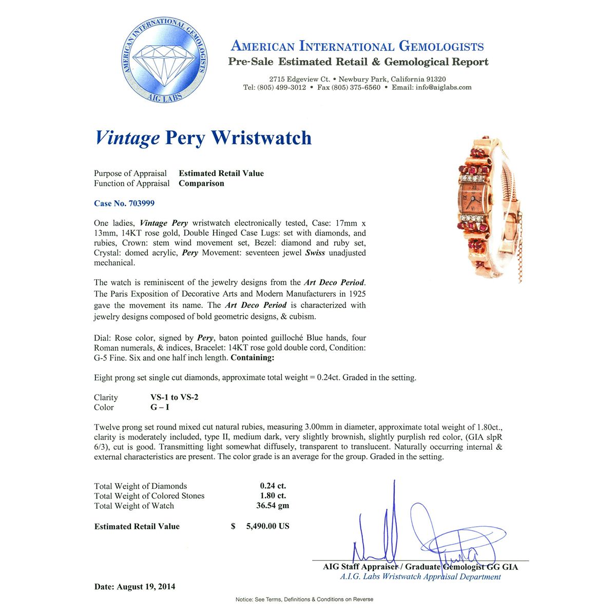 One ladies, Vintage Pery wristwatch electronically tested, Case: 17mm x 13mm, 14KT rose gold, Double Hinged Case Lugs: set with diamonds, and rubies, Crown: stem wind movement set, Bezel: diamond and ruby set, Crystal: domed acrylic, Pery Movement: seventeen jewel Swiss unadjusted mechanical. The watch is reminiscent of the jewelry designs from the Art Deco Period. The Paris Exposition of Decorative Arts and Modern Manufacturers in 1925 gave the movement its name. The Art Deco Period is characterized with jewelry designs composed of bold geometric designs, & cubism. Dial: Rose color, signed by Pery, baton pointed guilloche, Blue hands, four Roman numerals, & indices, Bracelet: 14KT rose gold double cord, Condition: G-5 Fine. Six and one half inch length. Containing: Eight prong set single cut diamonds, approximate total weight = 0.24ct. Graded in the setting. Clarity: VS-1 to VS-2. Color: G - I. Twelve prong set round mixed cut natural rubies, measuring 3.00mm in diameter, approximate total weight of 1.80ct., clarity is moderately included, type II, medium dark, very slightly brownish, slightly purplish red color, (GIA slpR 6/3), cut is good. Transmitting light somewhat diffusely, transparent to translucent. Naturally occurring internal & external characteristics are present. The color grade is an average for the group. Graded in the setting. Total Weight of Diamonds 0.24ct. Total Weight of Colored Stones 1.80ct. Total Weight of Watch 36.54 grams. AIG Appraised at $5,490.00.