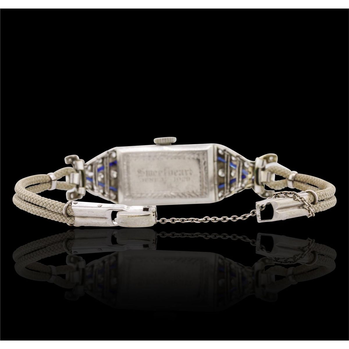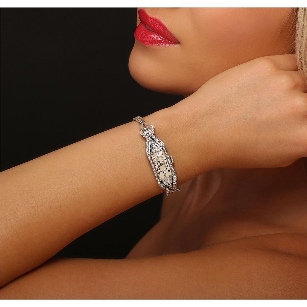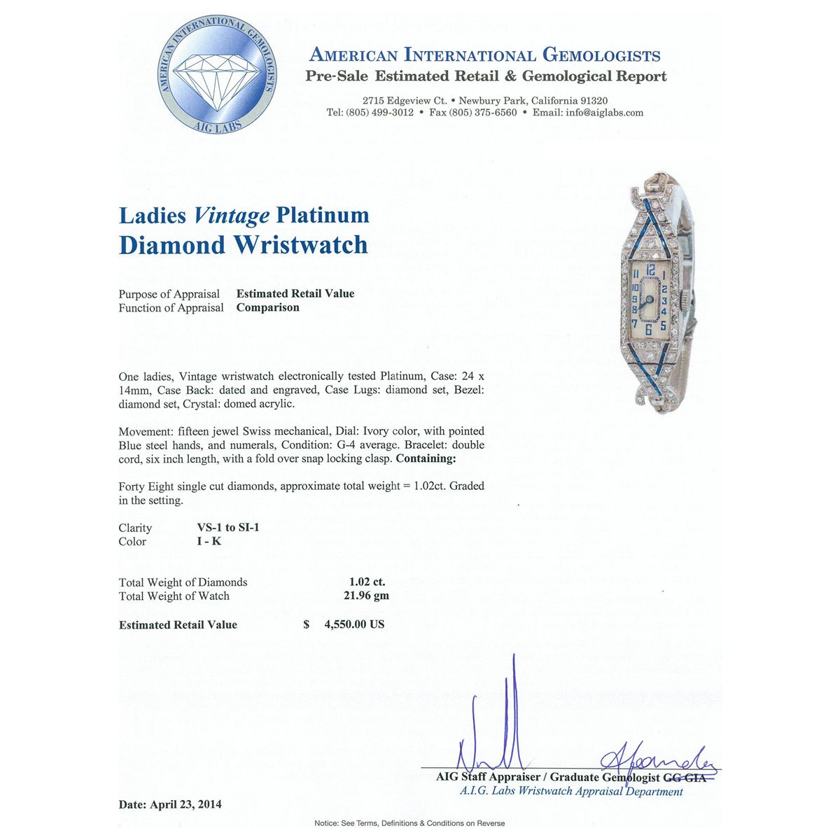 One ladies, Vintage wristwatch electronically tested Platinum, Case: 24 x 14mm, Case Back: dated and engraved, Case Lugs: diamond set, Bezel: diamond set, Crystal: domed acrylic. Movement: fifteen jewel Swiss mechanical, Dial: Ivory color, with pointed Blue steel hands, and numerals, Condition: G-4 average. Bracelet: double cord, six inch length, with a fold over snap locking clasp. Containing: Forty Eight single cut diamonds, approximate total weight = 1.02ct. Graded in the setting. Clarity: VS-1 to SI-1. Color: I - K. Total Weight of Diamonds 1.02ct. Total Weight of Watch 21.96 grams. AIG Appraised at $4,550.00.