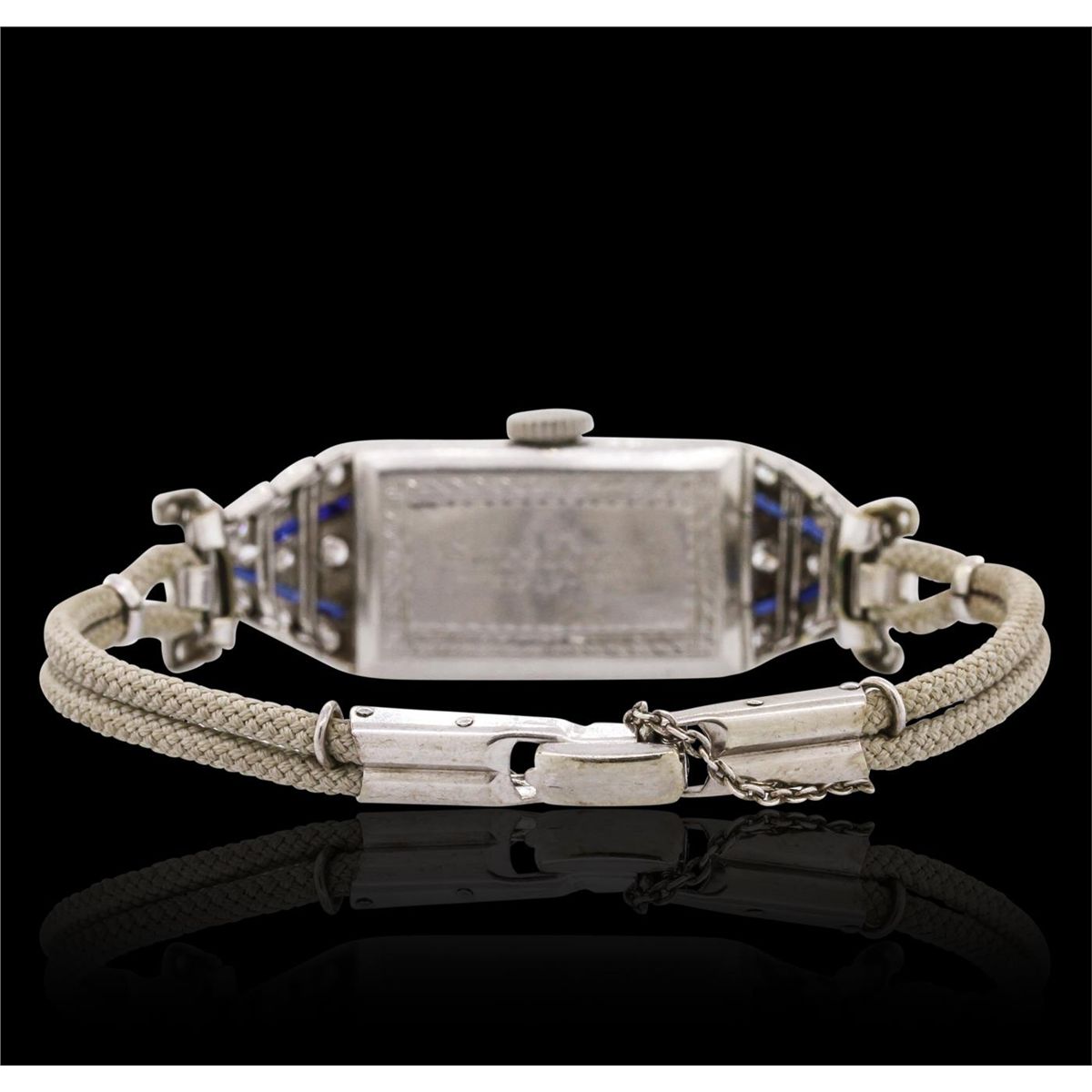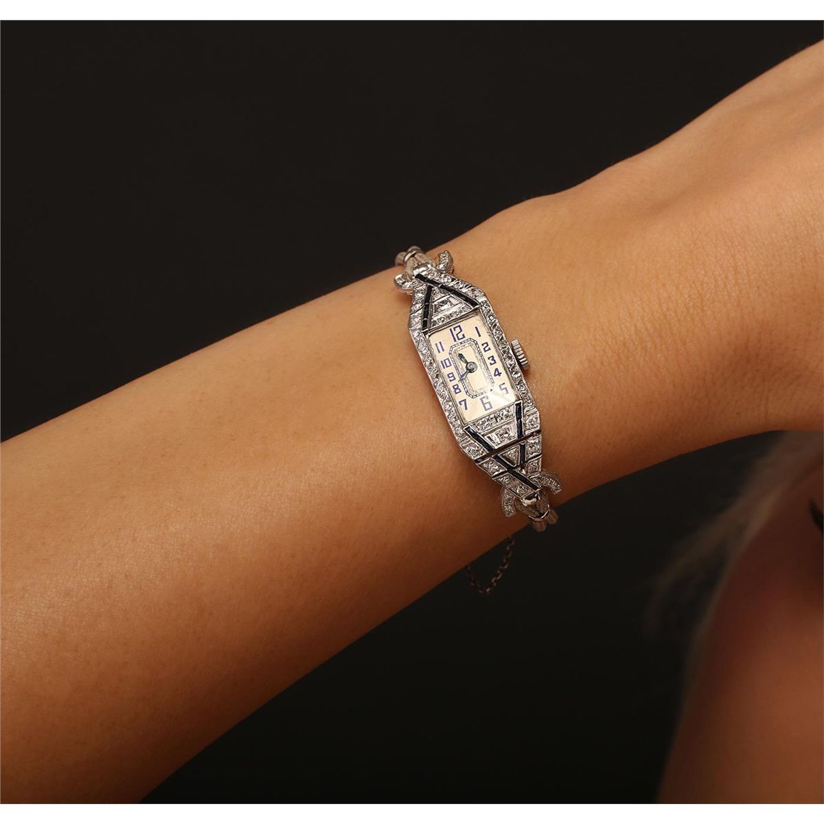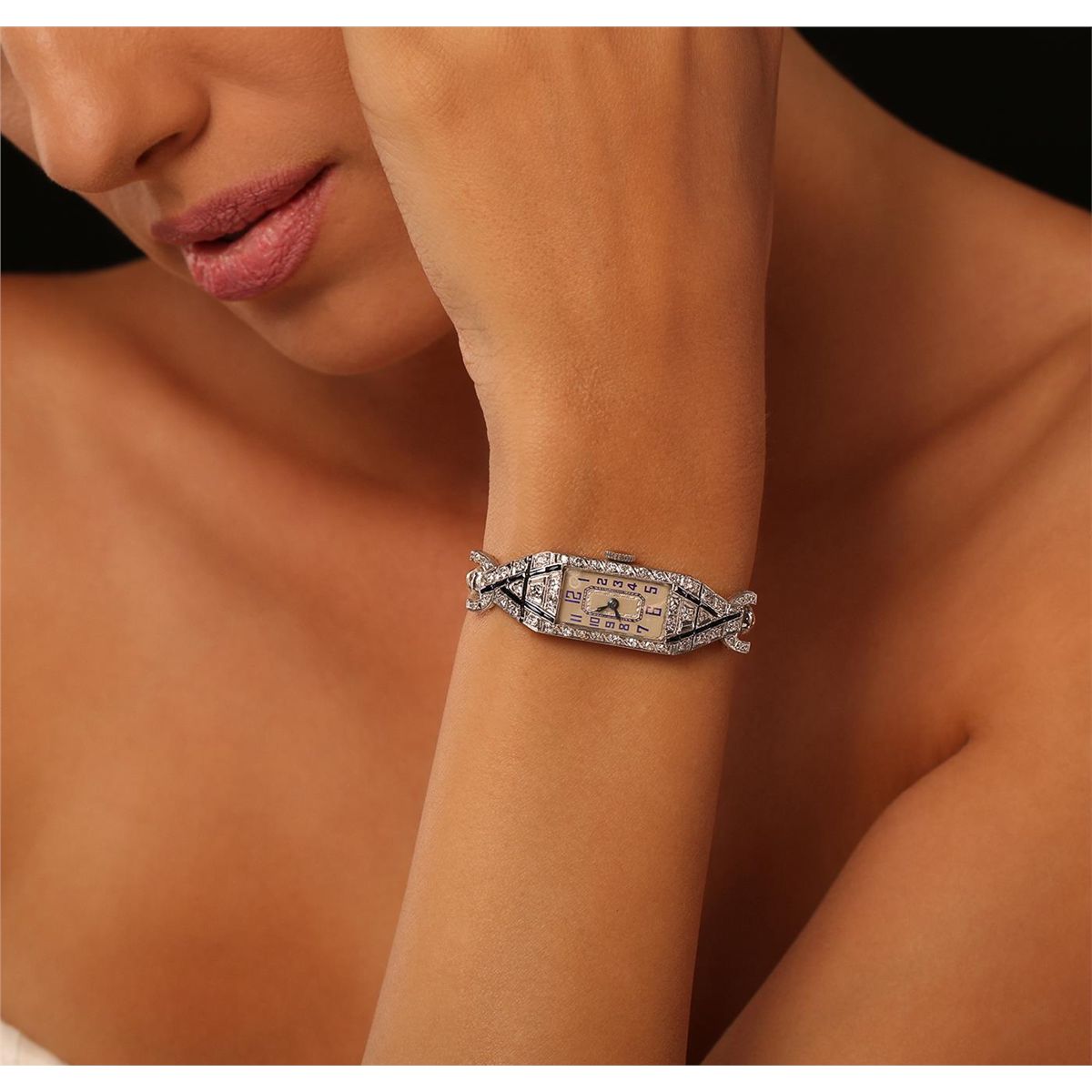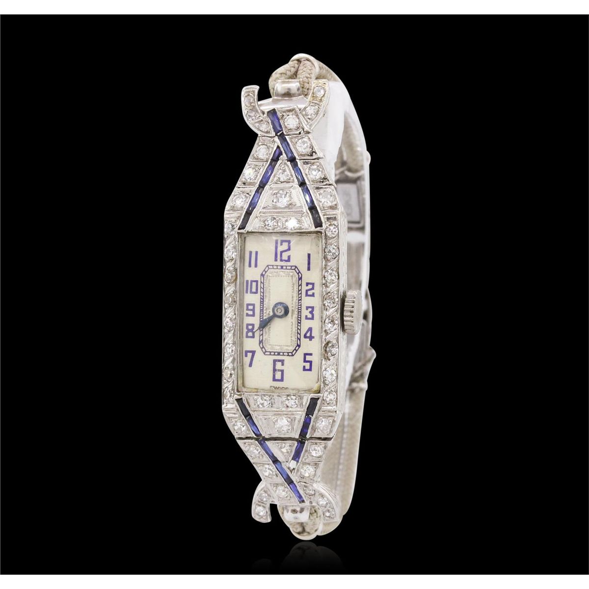 One ladies, Vintage wristwatch electronically tested Platinum, Case: 24 x 14mm, Case Back: dated and engraved, Case Lugs: diamond set, Bezel: diamond set, Crystal: domed acrylic. Movement: fifteen jewel Swiss mechanical, Dial: Ivory color, with pointed Blue steel hands, and numerals, Condition: G-4 average. Bracelet: double cord, six inch length, with a fold over snap locking clasp. Containing: Forty Eight single cut diamonds, approximate total weight = 1.02ct. Graded in the setting. Clarity: VS-1 to SI-1. Color: I - K. Total Weight of Diamonds 1.02ct. Total Weight of Watch 21.96 grams. AIG Appraised at $4,550.00.