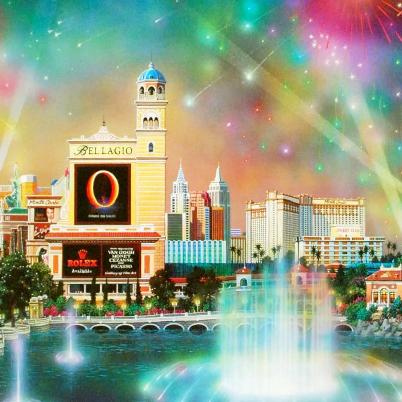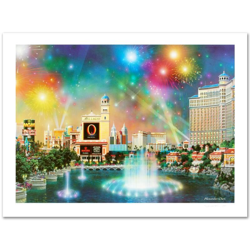 Alexander Chen creates stunningly detailed masterpieces filled with elaborate icons and a touch of fantasy. "Las Vegas Evening" is a limited edition offset lithograph on paper by Alexander Chen, numbered and hand signed by the artist. Measures approx. 23.5" x 17.5" (with border), 21" x 15" (image).
